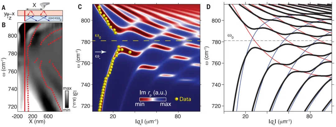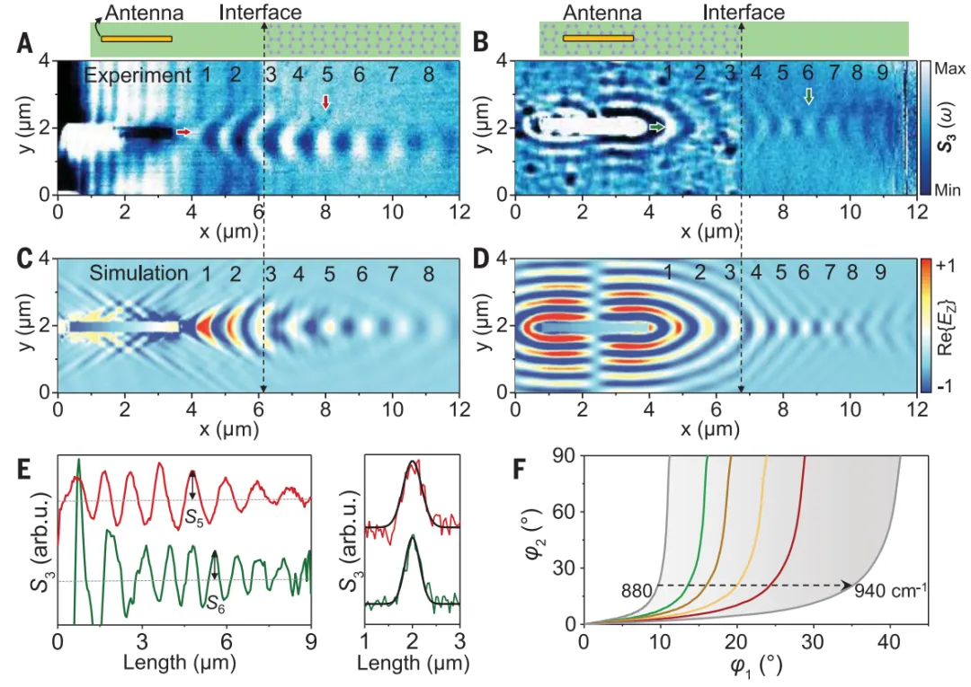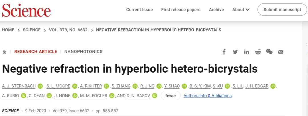 具体来说,作者在部分修饰有石墨烯的α-MoO3薄膜中可视化了广角负折射极化激子,并进行了可逆的平面纳米尺度聚焦。同时,本文的原子厚异质结构削弱了界面处的散射损耗,同时通过电门控实现了正常折射到负折射的主动可调转换。此外,这项工作提出极化负折射作为红外应用的有前途的平台,如电可调超分辨率成像、纳米级热操纵、增强分子传感和片上光学电路。相关论文以“Gate-tunable negative refraction of mid-infrared polaritons”为题发表在Science。Hai Hu†*, Na Chen†, Hanchao Teng†, Renwen Yu, Mengfei Xue, Ke Chen, Yuchuan Xiao,Yunpeng Qu, Debo Hu, Jianing Chen, Zhipei Sun, Peining Li, F. Javier García de Abajo*, Qing Dai*, Gate-tunable negative refraction of mid-infrared polaritons, 2023, Science, https://www.science.org/doi/10.1126/science.adf1251二、美国哥伦比亚大学A. J. Sternbach团队Science折射作为光学中的一种基本现象,其中光线在穿过两种介质之间的界面后改变方向 。如果折射光束与入射光束出现在界面法线的同一侧,则折射被认为是“负”的。这种罕见的情况在人造超材料和超晶格中得到了证实,它们的介电常数ε和磁导率μ同时为负。负折射会改变光放大和发射以及非线性光学,还可能导致捕获光以及“完美”透镜,具有主轴旋转错位的各向异性元结构之间的界面也可以实现负折射。极端各向异性由双曲材料(HMs)提供,其混合光物质模式-极化子-预计在精心设计的界面处表现出全角度负折射。在这项工作中,美国哥伦比亚大学A. J. Sternbach教授等人研究了以前未探索的一类由两个薄晶体组成的双曲异质双晶中的极化子,即氧化钼(MoO3)和同位素纯六方氮化硼(h11BN)。本文的高光谱纳米成像数据显示了MoO3/h11BN异双晶体中极化子射线的定位、负折射和闭环循环,观测到的效应的核心是极化子色散中的间隙,从极化波的高光谱图像中提取了该间隙。同时,异质双晶体的这些属性与使用HMs的光子应用广泛相关。此外,异双晶体中的极化子可以聚焦于衍射有限的光斑尺寸,这可以通过负折射实现完美的透镜化。然而,可达到的焦点可能受到外部因素的限制,包括晶体损耗和不完美的极化发射器。更加重要的一点是,与Fabry-Pérot腔类似,负折射可以导致辐射在异双晶纳米腔中以封闭循环传播,并且介电损失仍然是一个挑战,但可能通过主动损失补偿来缓解。相关论文以“Negative refraction in hyperbolic hetero-bicrystals”为题发表在Science。A. J. Sternbach*, S. L. Moore, A. Rikhter, S. Zhang, R. Jing, Y. Shao, B. S. Y. Kim, S. Xu,S. Liu, J. H. Edgar, A. Rubio, C. Dean, J. Hone, M. M. Fogler, D. N. Basov, Negative refraction in hyperbolic hetero-bicrystals, 2023, Science, https://www.science.org/doi/10.1126/science.adf1065【免费】为国内外课题组发布招聘信息,详情联系电话/微信:13632601244
