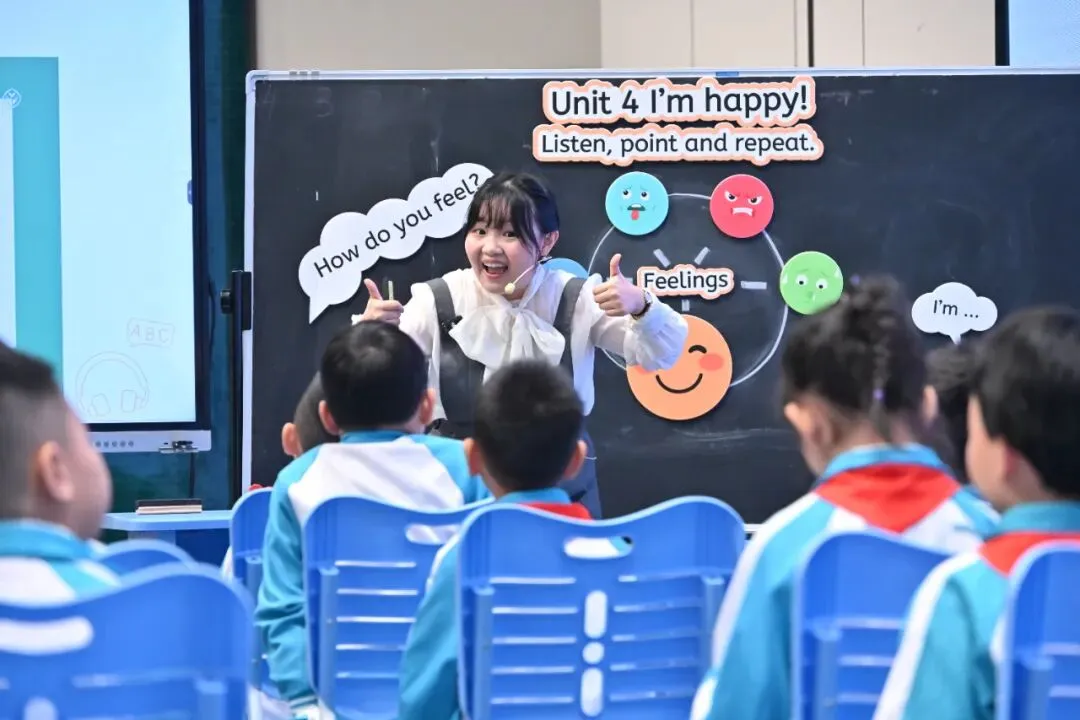 次日上午,PEP会场聚焦预备级教材,邀请广东省东莞市冯抒雁老师同海南中学澄迈附属小学的学生共同完成了二年级上册“Unit 4 I’m happy!Lesson 1”的现场课。课标组专家闫赤兵老师和山西省教育科学研究院李萍老师对本课给予了高度评价。两位专家指出,冯老师的教学设计充分遵循了低龄段学生的认知规律与心理特点,在活动中渗透语言学习,在运用中培养初步语感,生动体现了“在玩中学、在学中用”的教学理念。她们还进一步强调,在小学低年级阶段开设英语课程,对于激发学生语言兴趣、奠定长远语言发展基础具有重要价值。