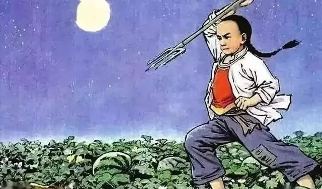 那个画面太美了 , 项带银圈 , 手捏钢叉 , 脚下是西瓜地。