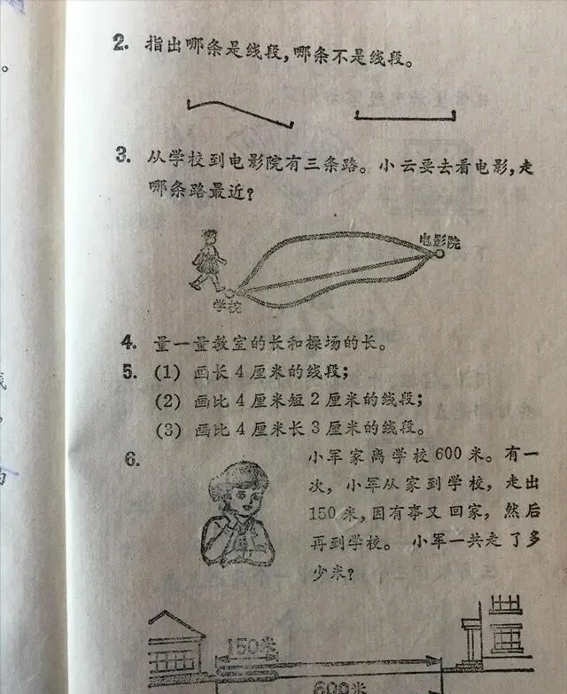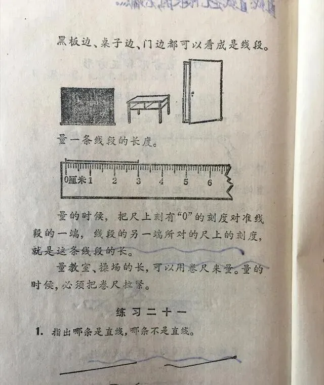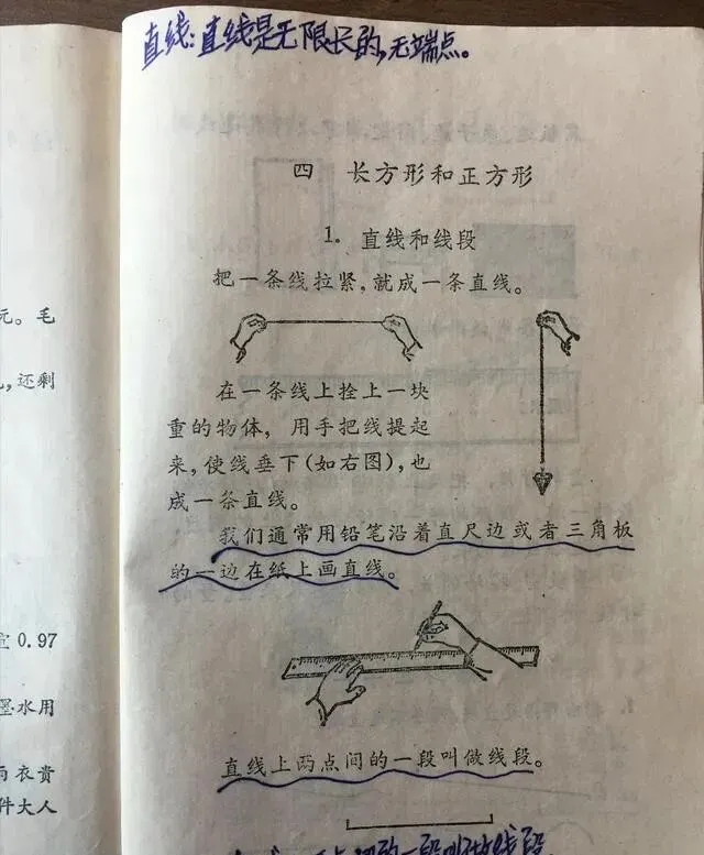 课本上画得清清楚楚 , 什么是直线 , 什么是线段 , 旁边配着实物图。 桌子边、铅笔、尺子 , 生活里随处可见的东西 , 一看就懂。