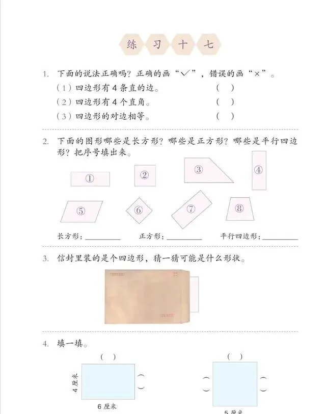 没有直线线段的铺垫 , 没有角的讲解 , 上来就是四边形 , 一堆图形让你辨认哪个是、哪个不是。