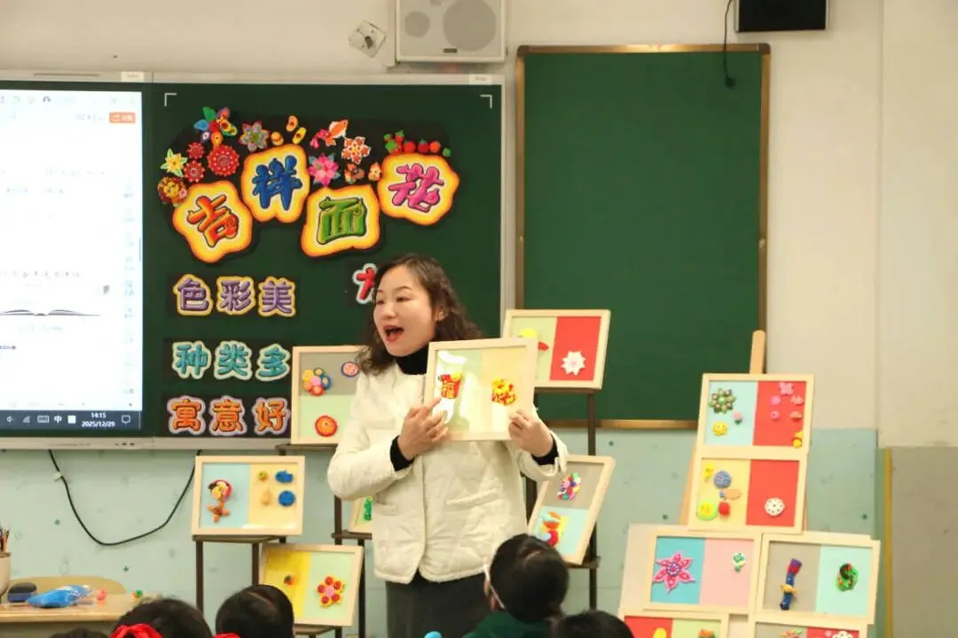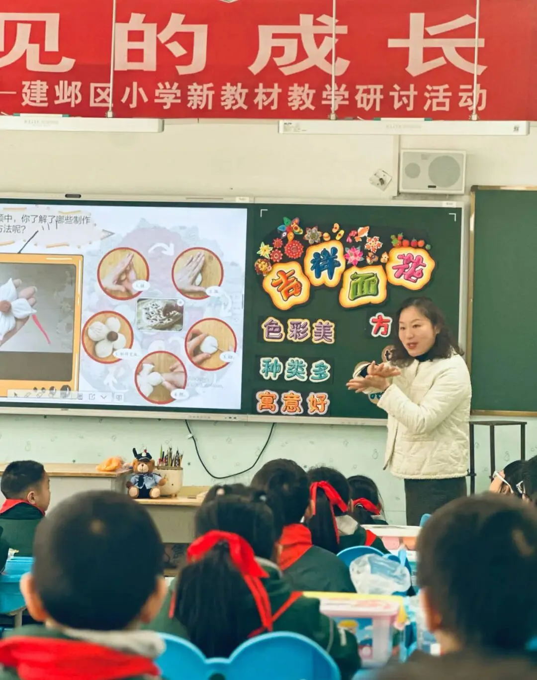 首先,杨梅老师执教的《吉祥面花》以AI面花小人“花花”带着《做面花》童谣和师生一起唱唱跳跳导入,杨老师带领学生通过视频探寻南北面花地域特色与历史渊源,引导学生通过面花和馒头的对比解读面花造型、色彩以及吉祥寓意等特征。在趣味实践环节,学生用超轻粘土通过捏、压、搓,剪等技法创作面花传递祝福,在温馨互动中感悟面花所承载的团圆情感与文化传承。