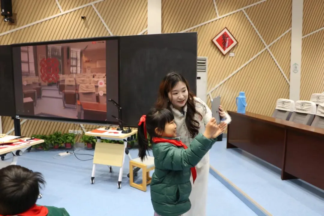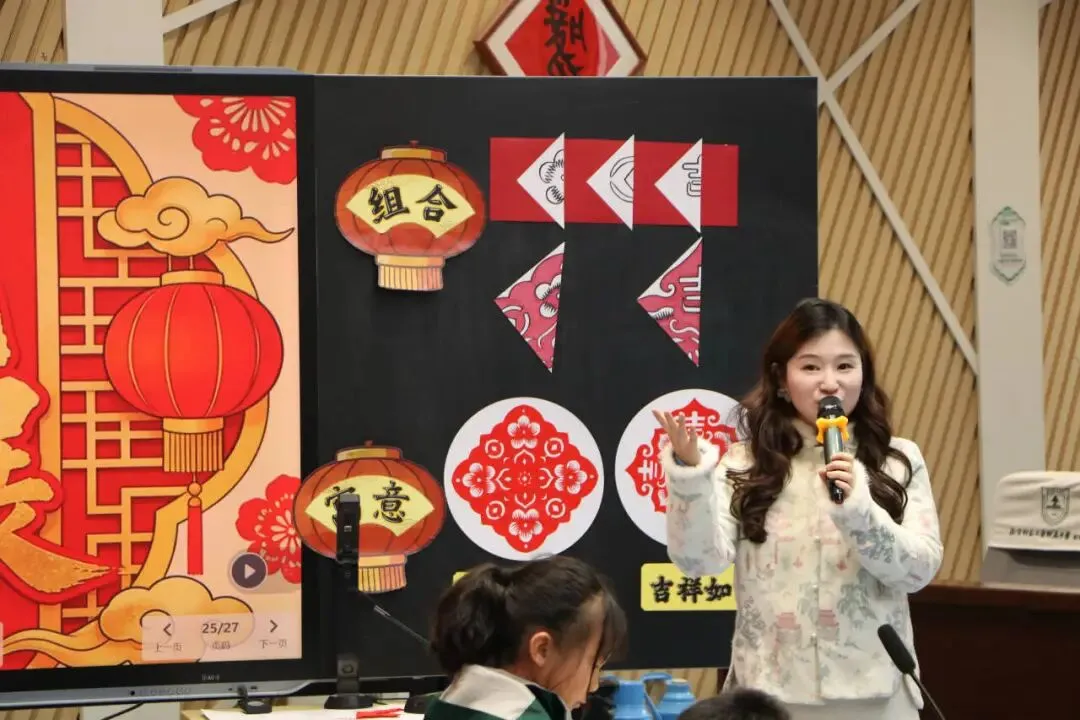 张若昕老师执教《剪个窗花闹新年》,课堂伊始,张老师运用AR技术,通过平板电脑扫描触发“魔法窗花”,瞬间点燃孩子们的学习热情。课上巧妙融合信息技术与传统文化,运用AI技术生成博物馆探秘场景、借助“纸上生花”APP进行纹样设计示范,引入虚拟助手新年小精灵“阿福”讲解非遗知识。教学中,教师通过实物投影示范、互动评价等方式,引导学生掌握对角四折法及纹样组合,学生在沉浸式体验中感受剪纸艺术的魅力,感悟窗花的美好寓意和祝福。