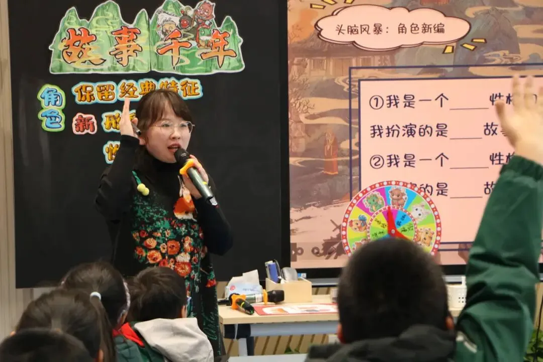 陈婵媛老师执教的《故事千年》课颇具新意,以浪浪山改编片段导入后,融合 AI 辅助创作、《山海经》灵感溯源等创新形式,引导学生为经典神话角色赋予新形象与性格。课堂通过角色创作、剧场表演等实践活动,让学生在趣味体验中传承文化,尽显课程创新活力。