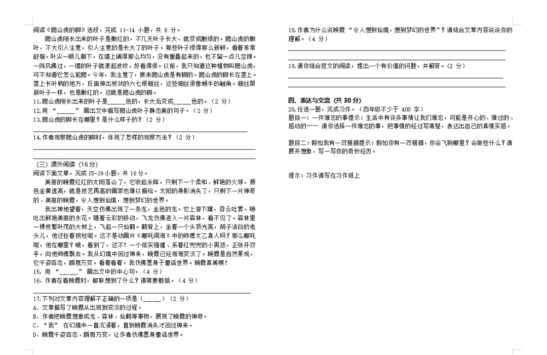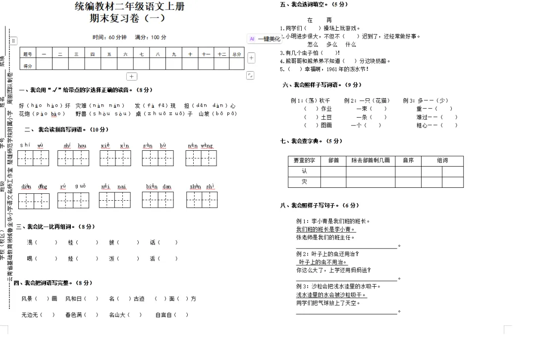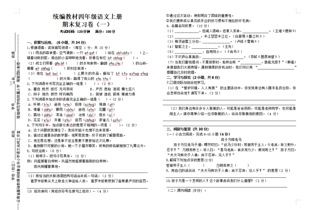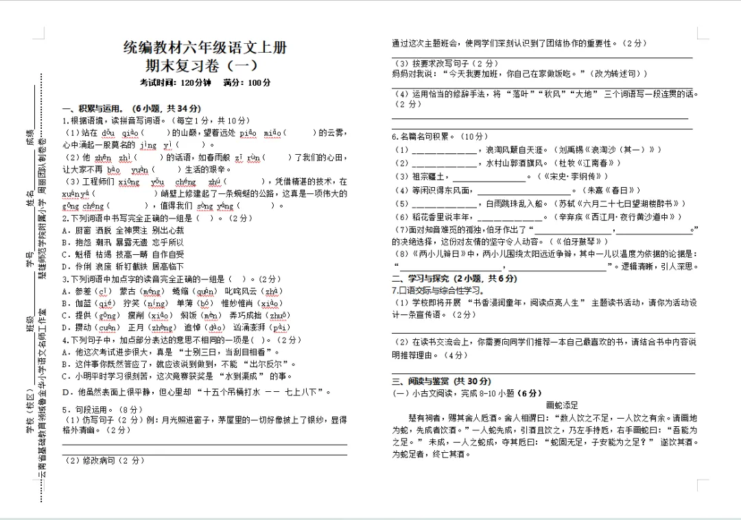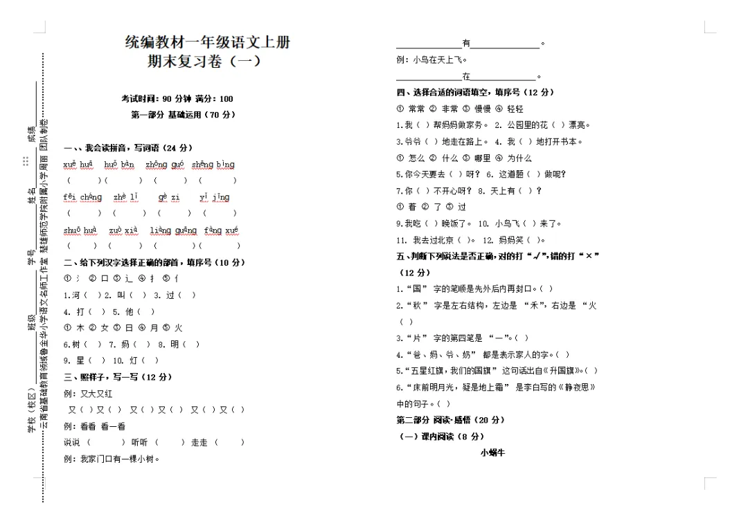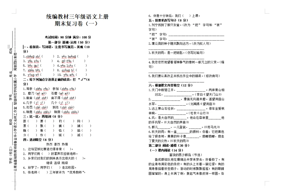 抓好期末复习工作,可以查漏补缺、提高学生的理解能力、增强记忆效果、提高应试能力。云南省“兴滇英才支持计划”教学名师鲁金华小学语文工作室根据《义务教育语文课程标准(2022年版)》关于语文学业水平考试的命题原则及命题的要求,紧扣统编教材小学语文上册教科书,命制了期末复习卷。期末复习卷(一)由云南省“兴滇英才支持计划”教学名师鲁金华小学语文工作室楚雄师范学院附属小学周丽团队命制,仅供大家参考。