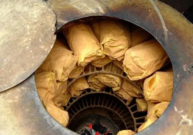 先挖个坑 , 木炭烧红 , 用灰烬薄薄盖住。 鸡包好放上去 , 上面再盖灰烬 , 堆上红木炭 , 慢慢焖。