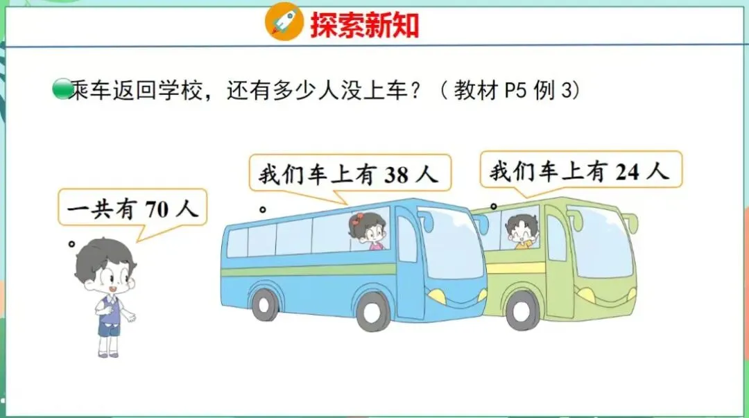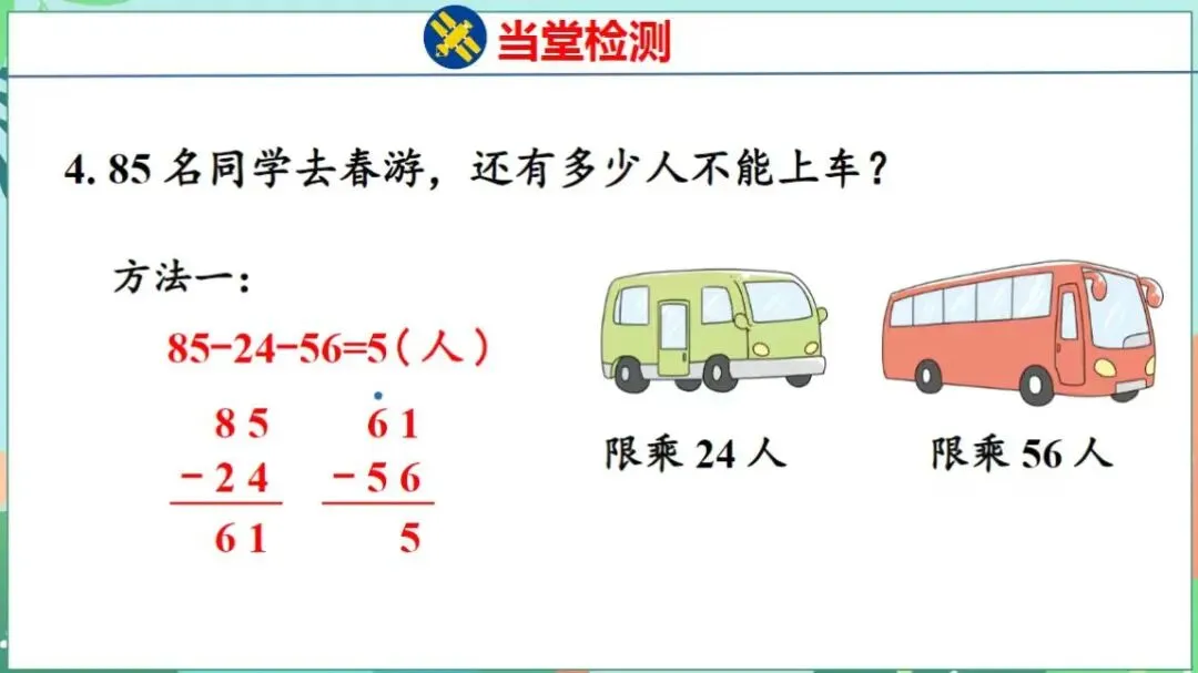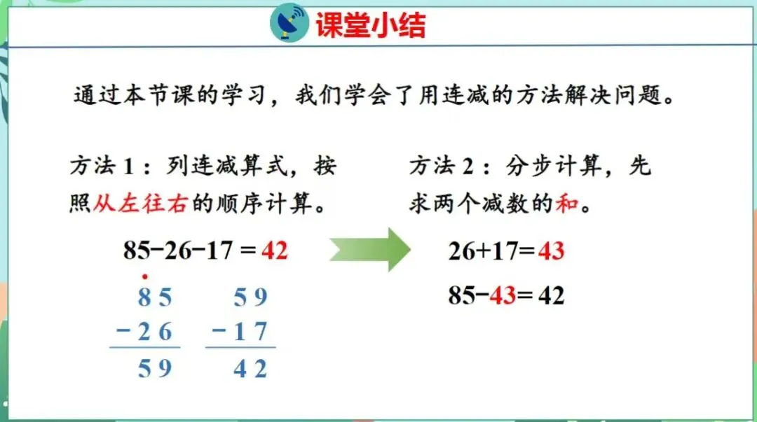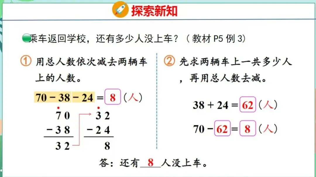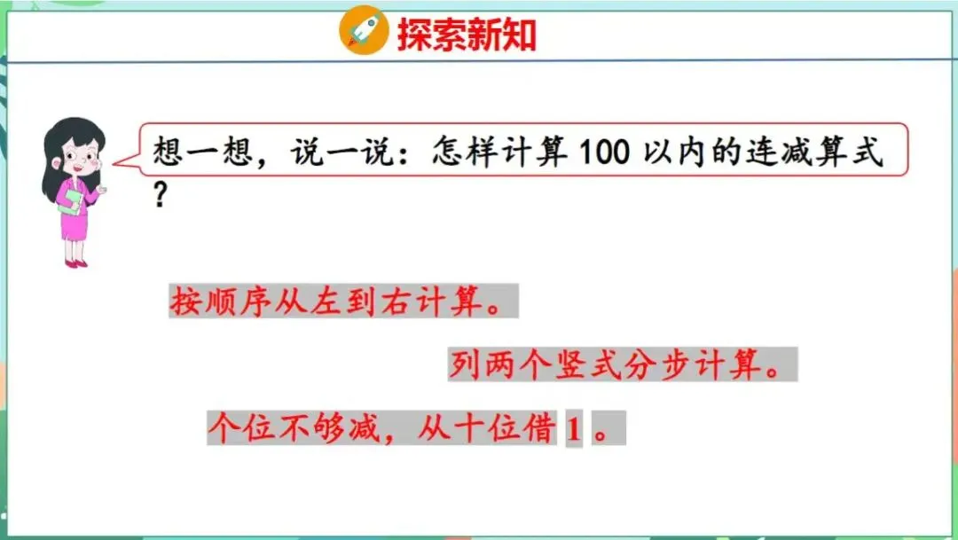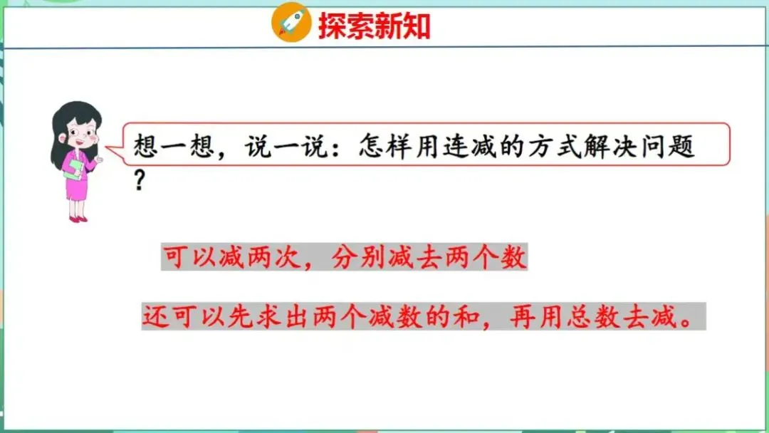 1.能从情境图中提取信息,知道同一个问题可以有不同的解法。2.掌握100以内的连减的计算方法,体验计算方法的多样化。(重点)3.理解用竖式计算连减的算理,在学习活动中获得成功的体验。(难点)
