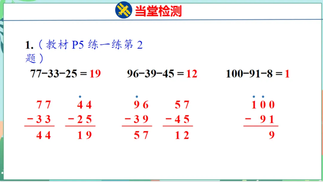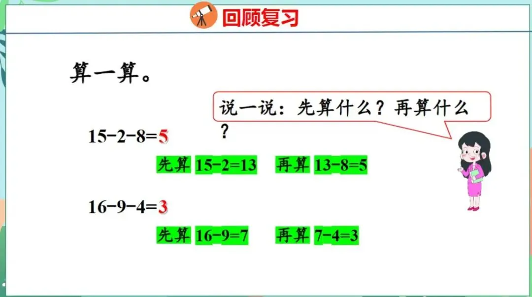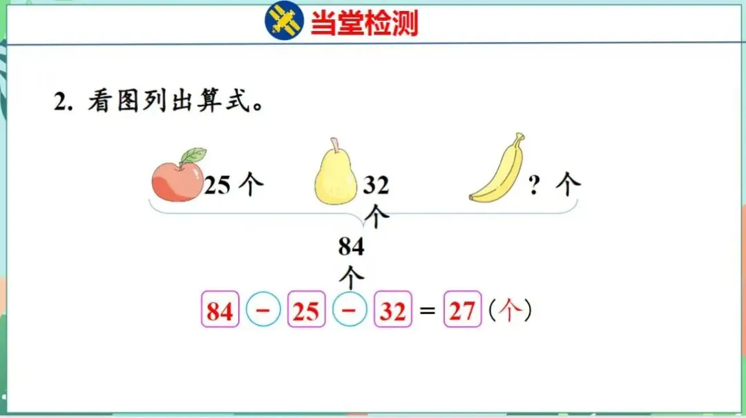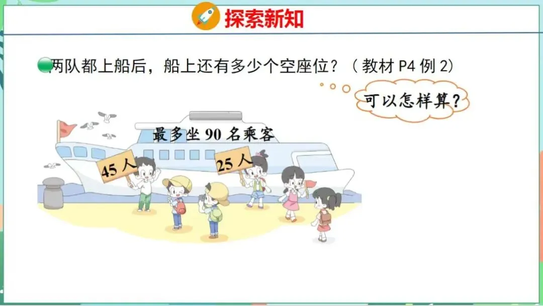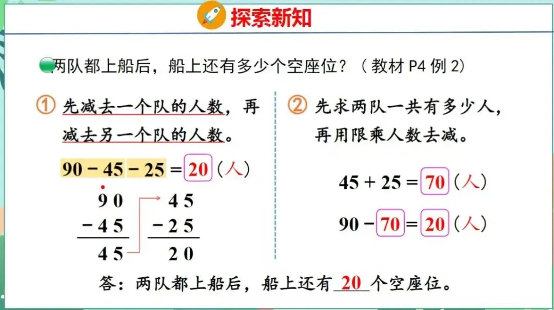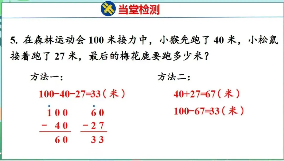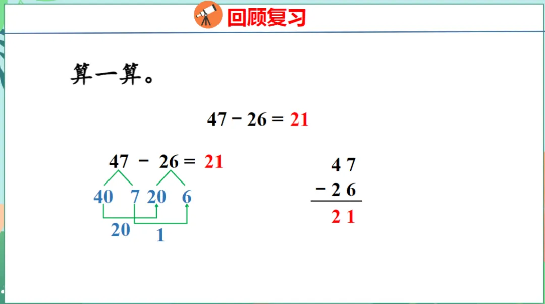 1.能从情境图中提取信息,知道同一个问题可以有不同的解法。2.掌握100以内的连减的计算方法,体验计算方法的多样化。(重点)3.理解用竖式计算连减的算理,在学习活动中获得成功的体验。(难点)