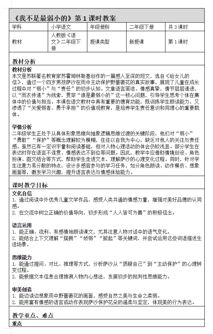 >【资源编号:00800】2026春新教材小学语文新二年级下册二下语文第二单元第7课第七课《我不是最弱小的》课时教案共三课时 教学设计 可定制