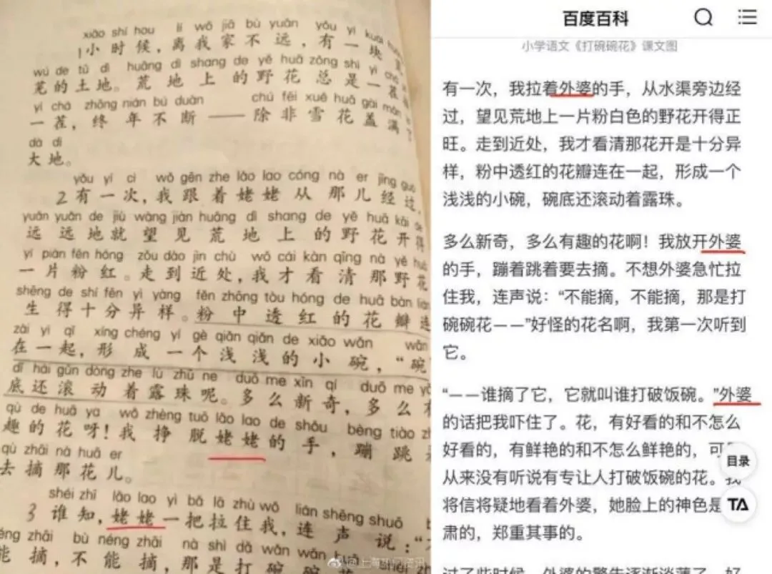 昨日,据上海市教委新闻办官方微信消息,上海市教育委员会发布《关于上海小学语文教科书“外婆”改“姥姥”一事的处理意见》。意见指出,6月20日,网络舆论关注“小学二年级第二学期上海教育出版社出版的语文教科书第24课《打碗碗花》原文的‘外婆’被改成了‘姥姥’”。上海市教委了解有关情况后,要求上海市教委教研室和上海教育出版社查清事实,向公众说明有关情况,并进一步提出以下处理意见: