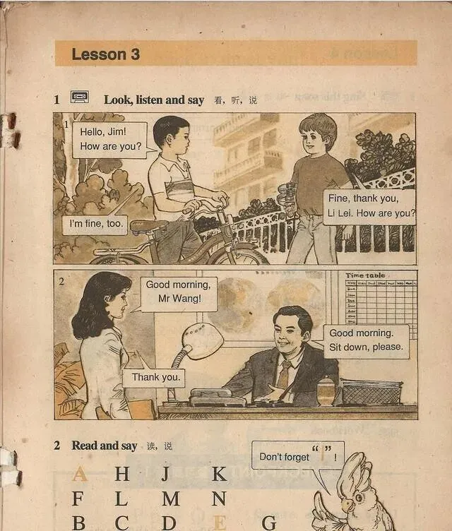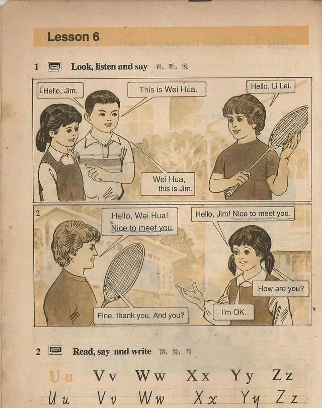 95年那套初中英语课本 , 红皮的 , 翻开第一页就是这俩人相遇 , 当时谁能想到 , 这一课我们记了二十多年~