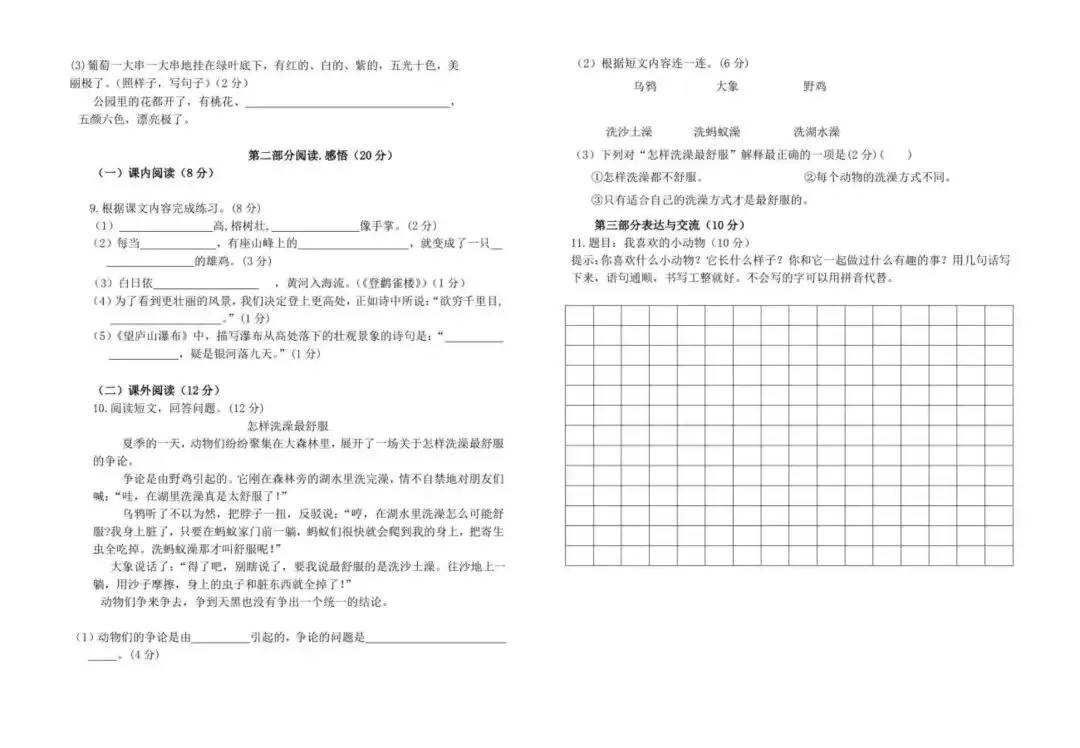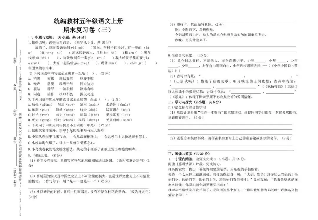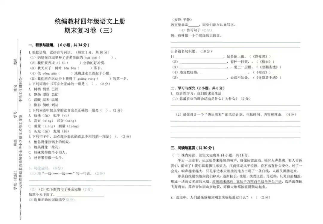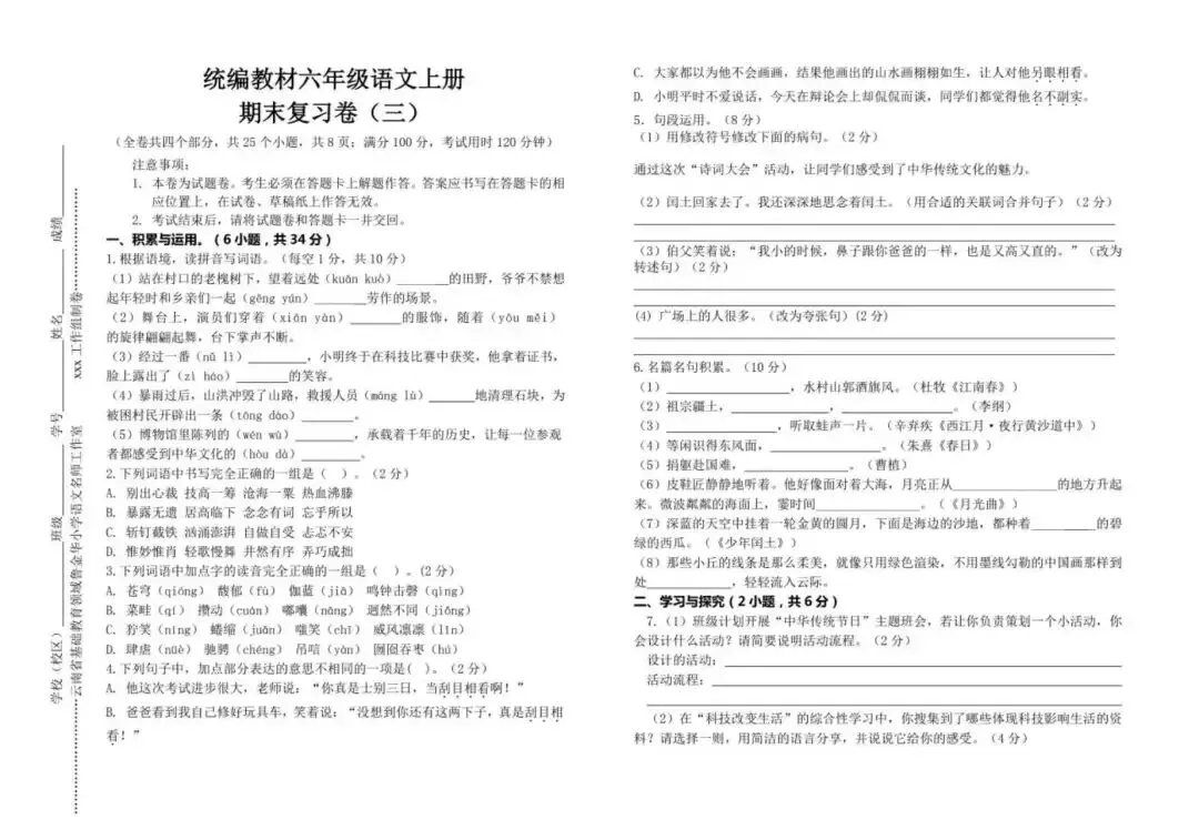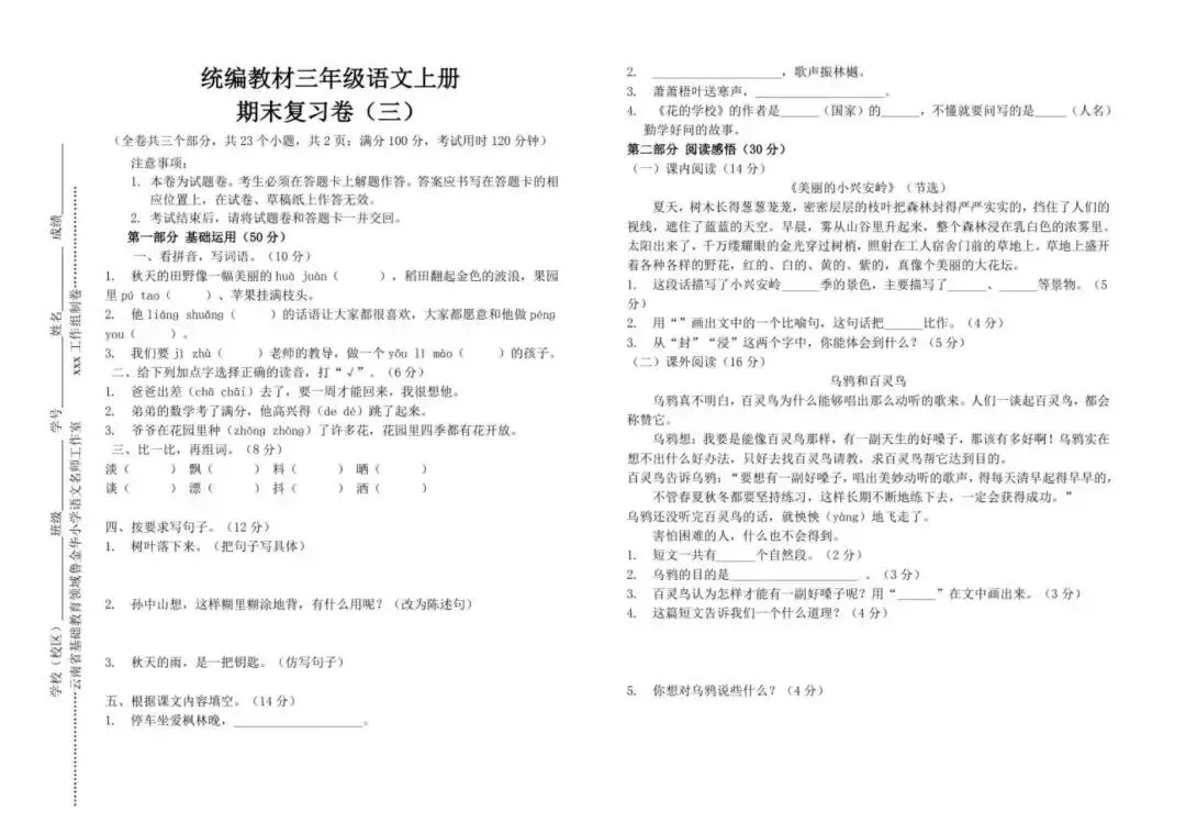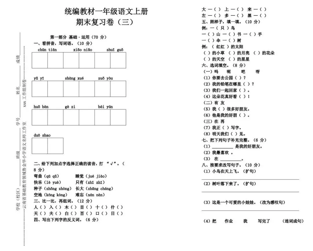 期末模拟试卷是期末复习阶段极具价值的抓手,它能帮助我们在有限的时间里精准锚定知识盲区,实现从零散知识点到系统知识网络的整合。通过完整作答模拟试卷,我们可以提前适应期末考试的时间节奏与题型分布,熟悉各类题目的解题思路和作答规范,避免考场上因不熟悉流程而出现慌乱失分的情况。云南省“兴滇英才支持计划”教学名师鲁金华小学语文工作室根据《义务教育语文课程标准(2022年版)》关于语文学业水平考试的命题原则及命题的要求,紧扣统编教材小学语文上册教科书,制定了期末复习卷。期末复习卷(三)由云南省“兴滇英才支持计划”教学名师鲁金华小学语文工作室怒江州泸水市称杆乡中心学校李艳团队制定,仅供大家参考。统编教材小学语文上册 一至六年级