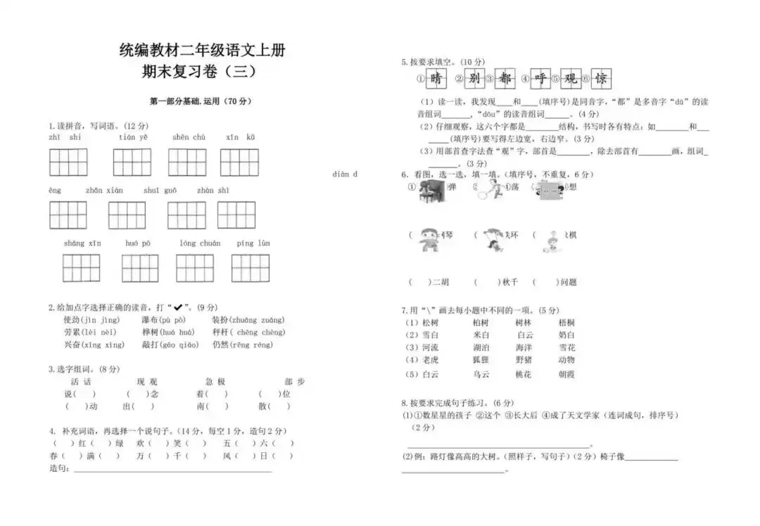 统编教材小学语文1-6年级上册期末复习卷(三)云南省“兴滇英才支持计划”教学名师鲁金华语文工作室简报 第130期