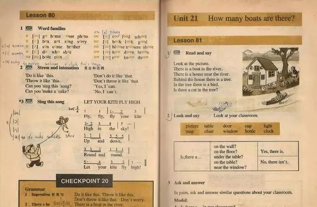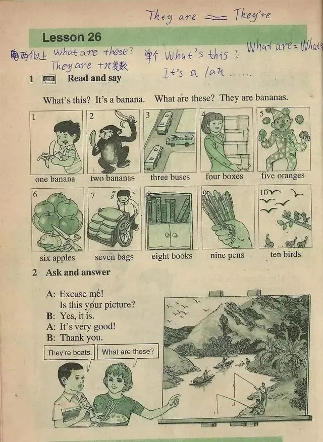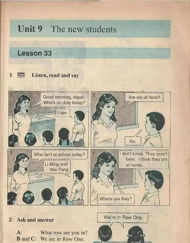 每次说到"Now , what row?"课堂就达到高潮 , 人声鼎沸 , 同桌或者前后桌一起表演课文小场景 , 一学期五六次 , 人人都会说几句。
