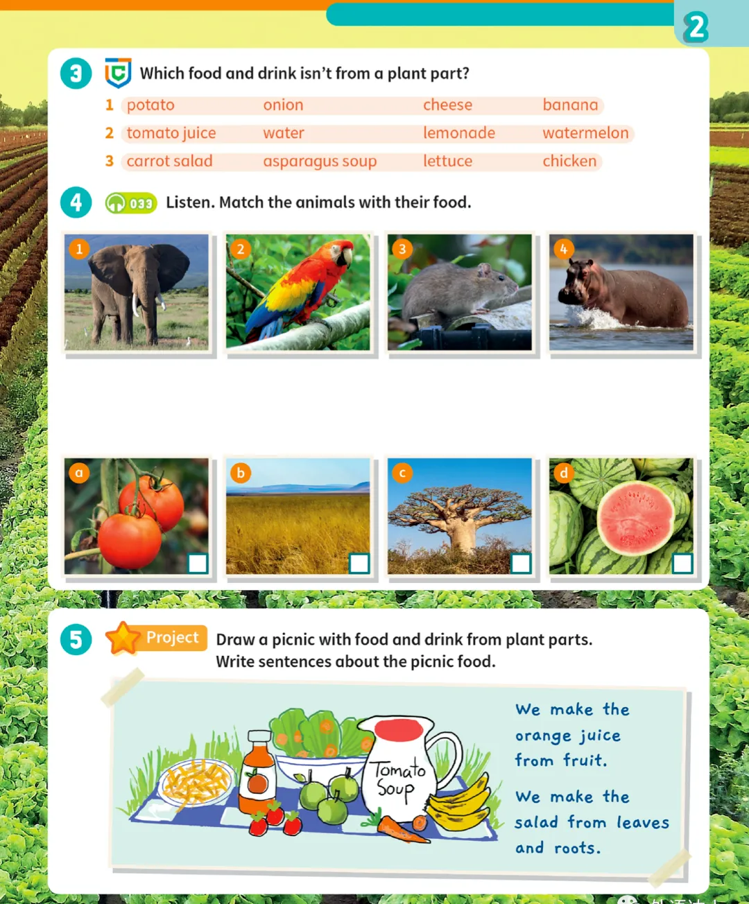然后通过给学生任务,让他们根据不同的食物的类别,匹配不同的动物。这既是锻炼孩子思维的过程,也涉及到我们现在最常见的环境话题的相关阅读。