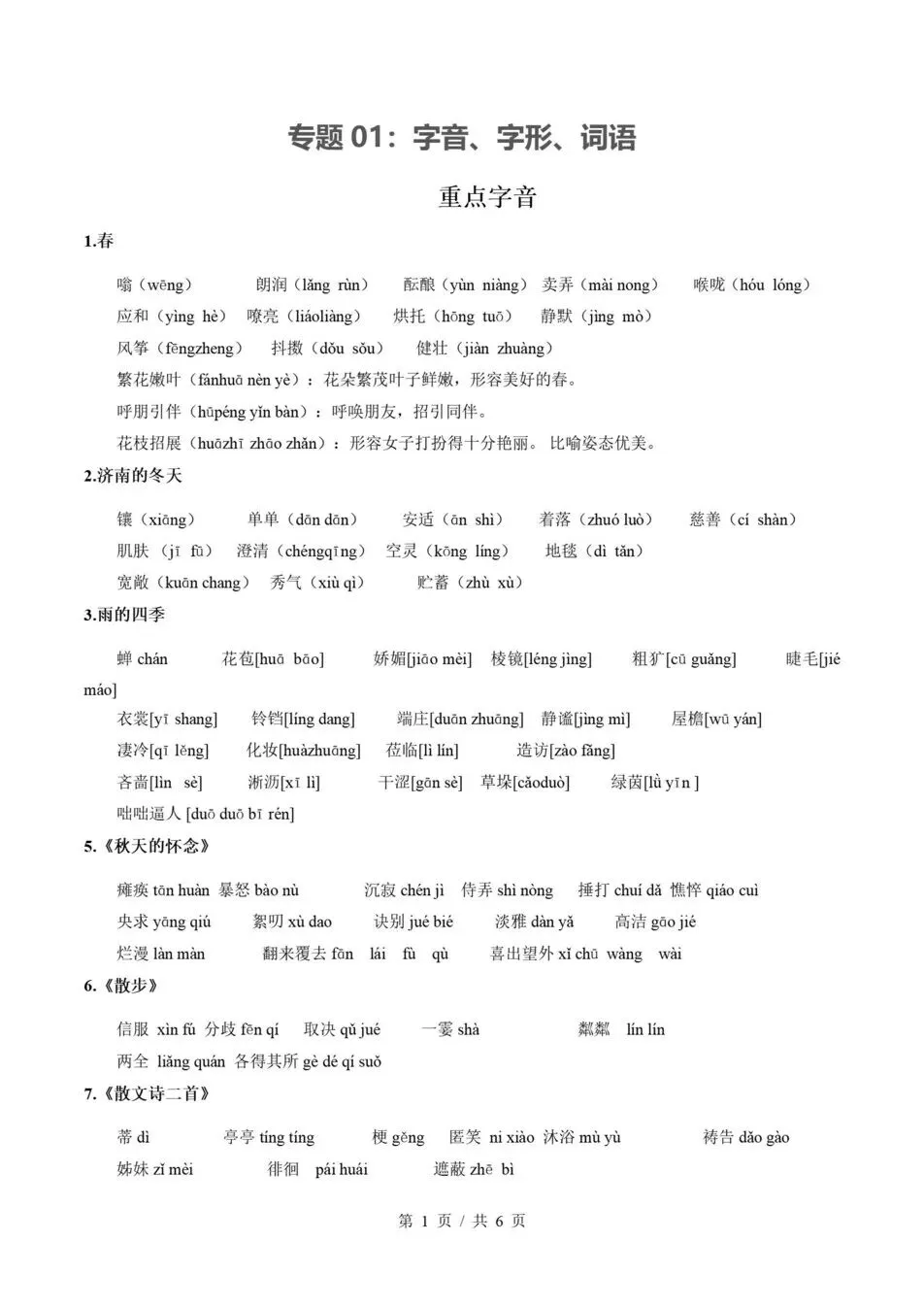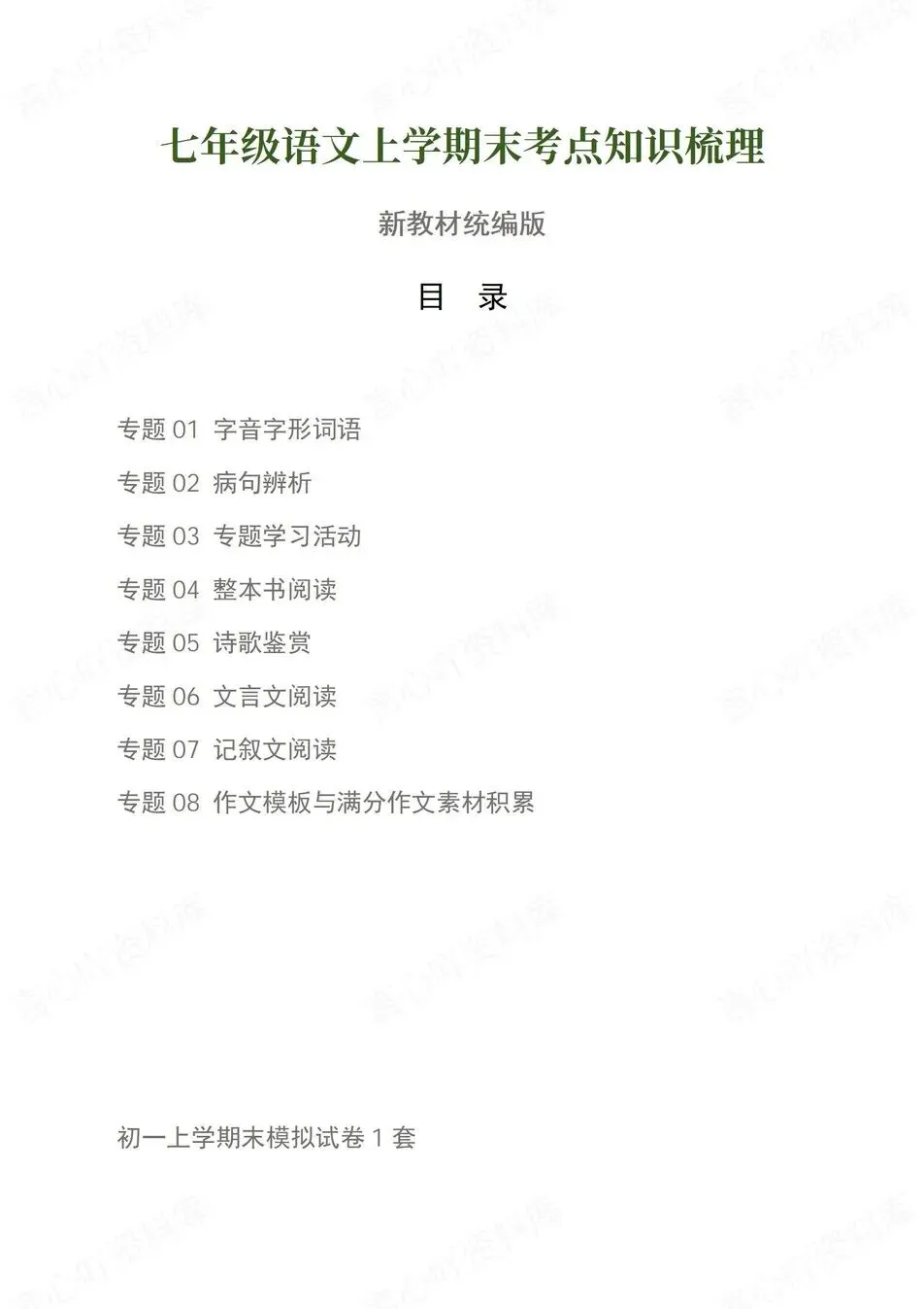 新教材初一上期末知识清单,· 字音字形词语/病句· 阅读/文言文/诗歌/作文统编版,