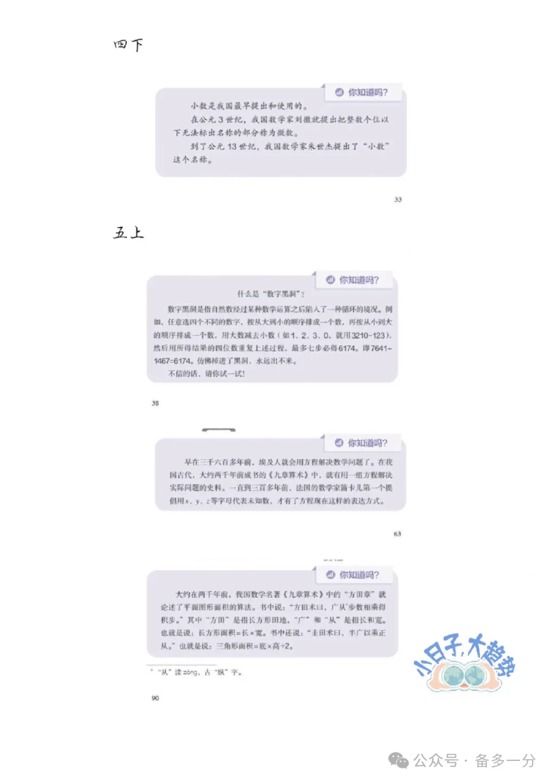 2.小数是我国最早提出和使用的。在公元 3 世纪,我国数学家刘徽就提出把整数个位以下无法标出名称的部分称为微数。到了公元 13 世纪,我国元代数学家朱世杰提出了小数的名称。