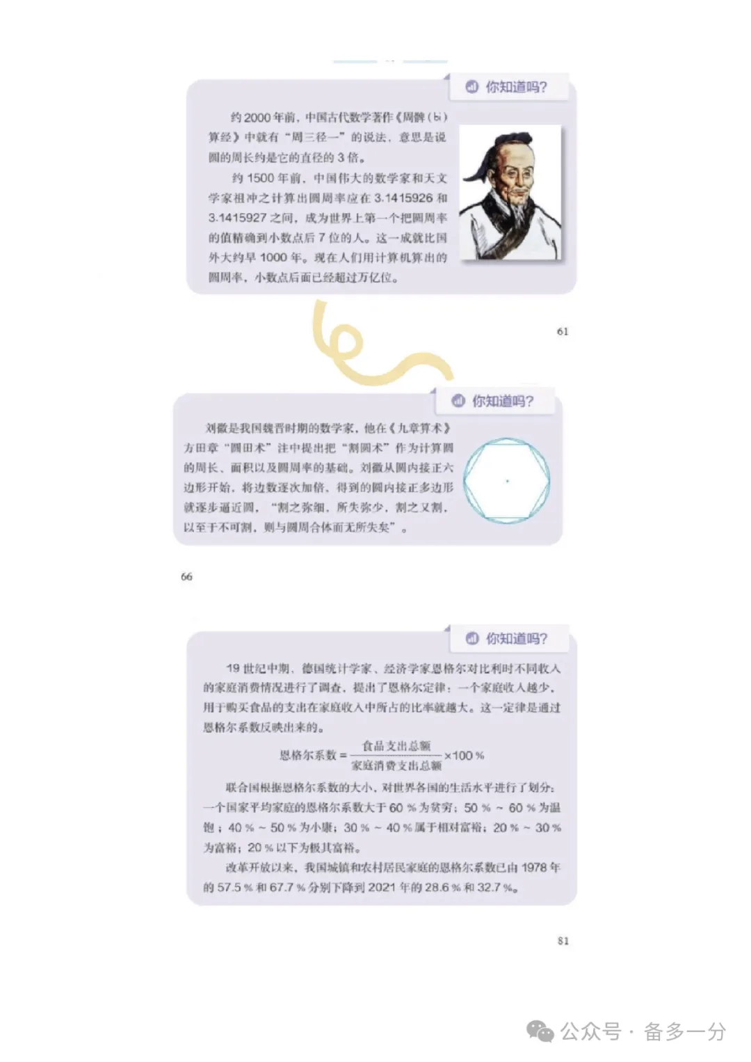 - 12. 刘徽是我国魏晋时期的数学家,他在《九章算术》方田章 “圆田术” 注中提出把割圆术作为计算圆的周长、面积以及圆周率的基础,求得 π 的近似值 3.1416。刘徽从圆内接六边形开始,将边数逐次加倍,得到的圆内接正多边形就逐步逼近圆,“割之弥细,所失弥少,割之又割,以至于不可割,则与圆周合体而无所失矣。”