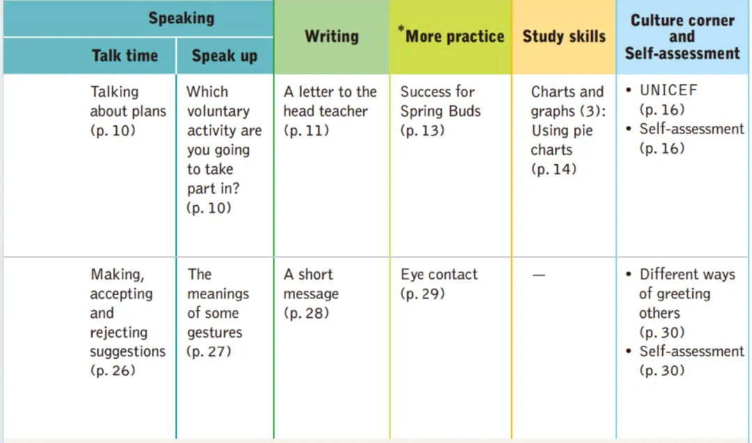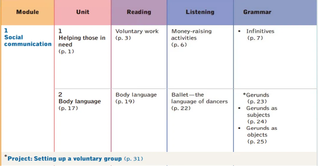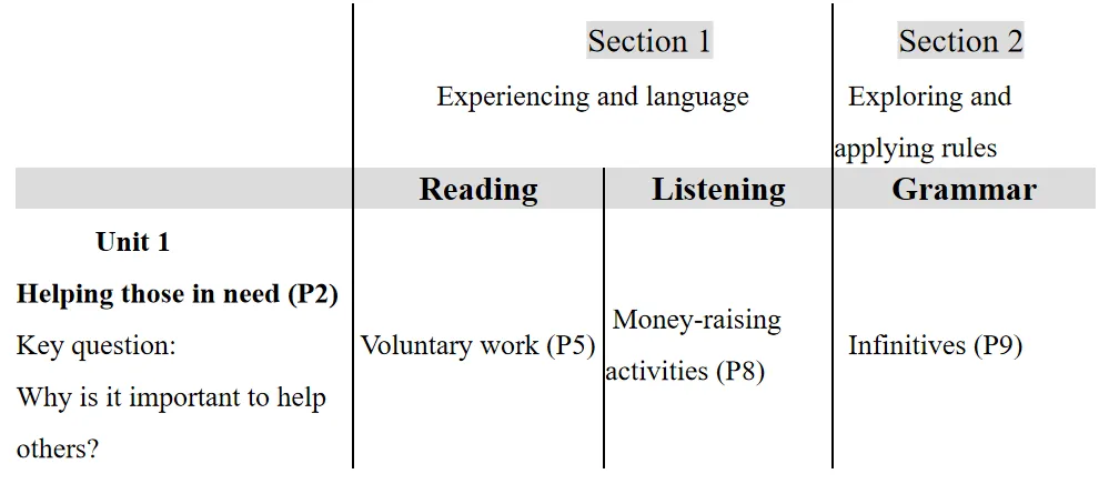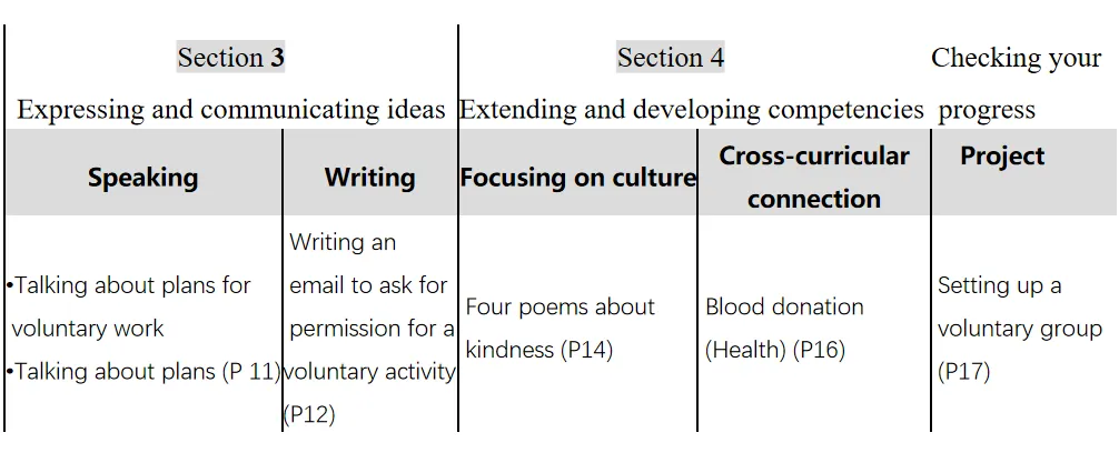 增加了“Project”板块(如“Setting up a voluntary group”),强调项目式学习。从“体验”到“拓展”,强调能力逐步提升。