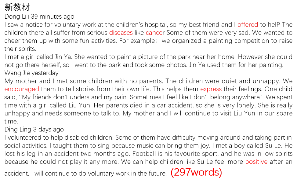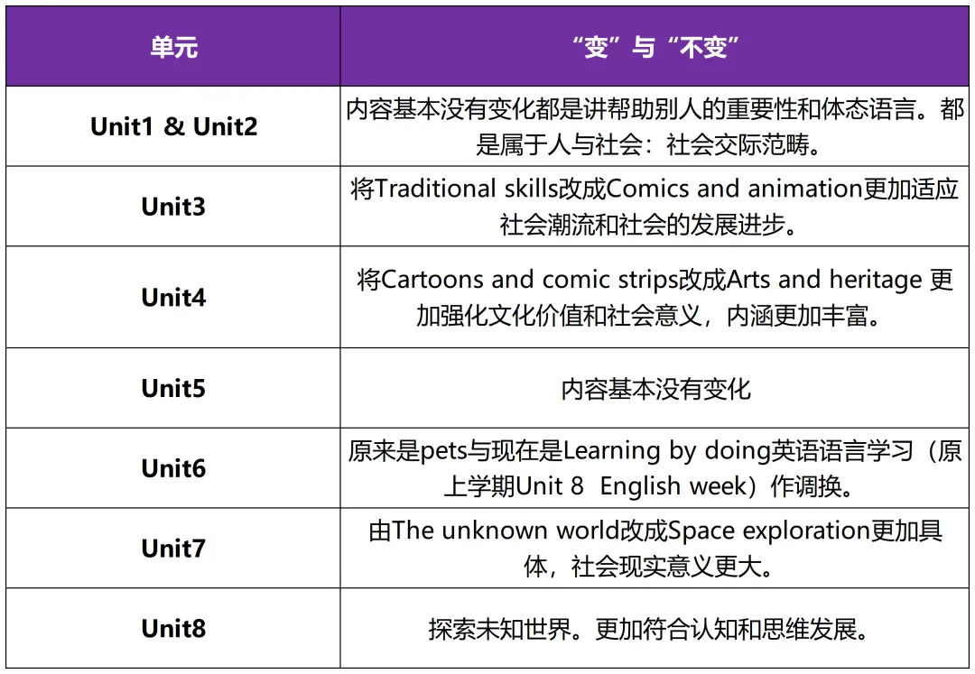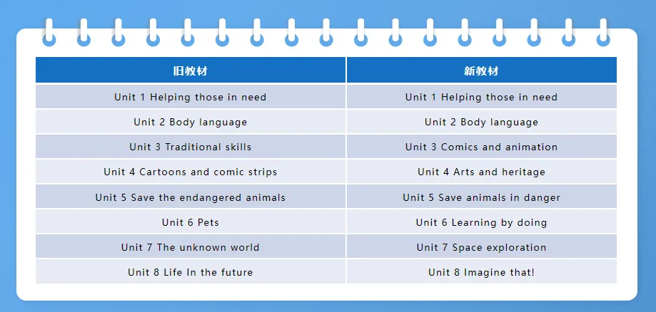 选材更贴近文章讨论的话题。更有深度和广度,有的文章虽然保持原来教材的部分内容,但教材的难度加大了,篇章中词汇量扩容不少,不少原来九年级甚至高中课本出现的单词,现在八年级都已经呈现。表述更加丰富了。如:Unit one