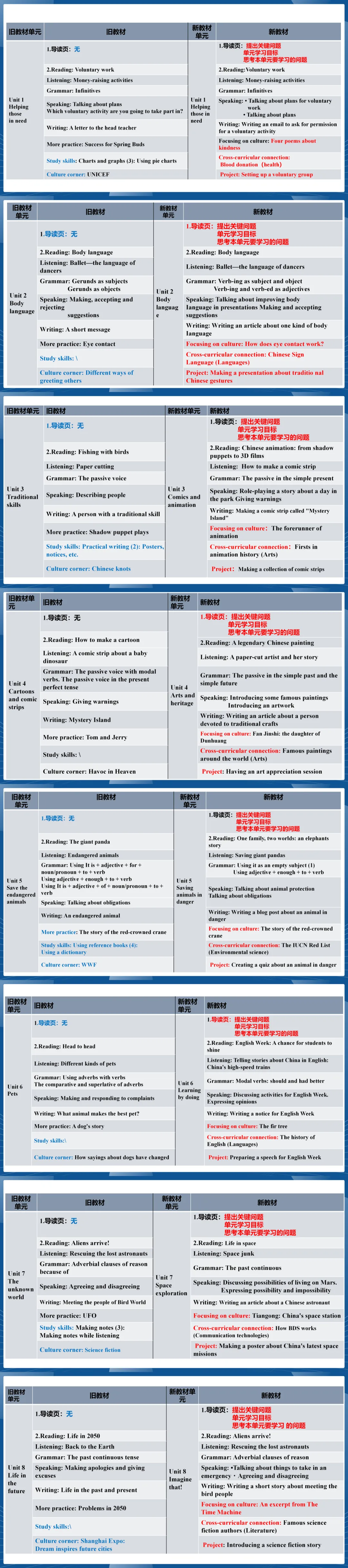 平缓改变但是对思维品质和文化意识的培养更为明显。简单来说,也就是语法内容充分吻合教材所学的主题。一切为文章语材积累服务。学习方式采用 “语境中习得” 模式。而旧版则依赖语法表格和机械操练学习。