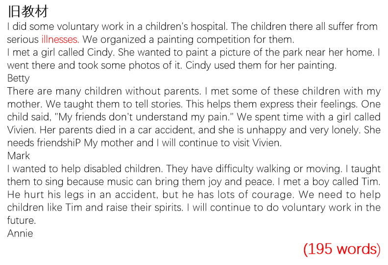 新版教材选材会更贴近文章讨论的话题。更有深度和广度,有的文章虽然保持原来教材的部分内容,但教材的难度加大了,篇章中词汇量扩容不少提前引入高年段内容阅读材料长度接近中考水平(200 词左右),包含说明文、科普文章等非虚构类文本。