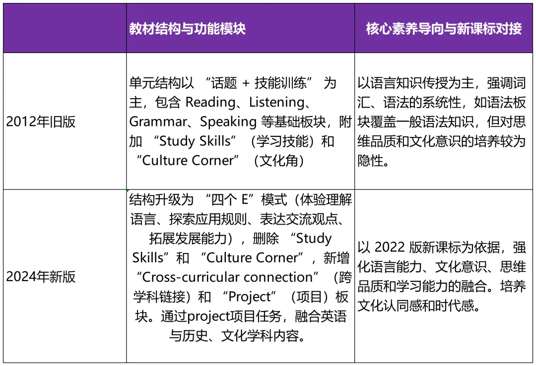 与 2012 年旧版相比,新版教材更强调真实情境应用、高阶思维培养和文化自信,同时通过技术融合和项目式学习提升学习深度。也就是说,面对新教材,学生需适应自主学习和综合能力要求,以应对教材变化带来的挑战。