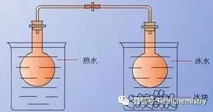②把NO2和N2O4的混合气体盛在两个联通的烧瓶里,用夹子夹住橡皮管。把一个烧瓶放在热水里,把另一个放在冰水(或冷水)里,如图下图所示,观察现象。