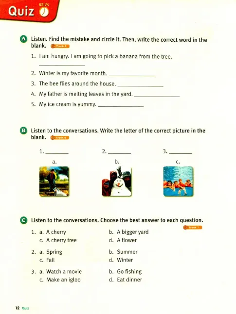 随后,在进行Part C的听力练习之前,先与孩子一起观察图片,并鼓励他们根据图片内容联想和预测可能听到的单词。这可以激活孩子的词汇库,并为接下来的听力活动做好准备。播放音频后,让孩子根据所听到的内容选择或写出合适的单词。