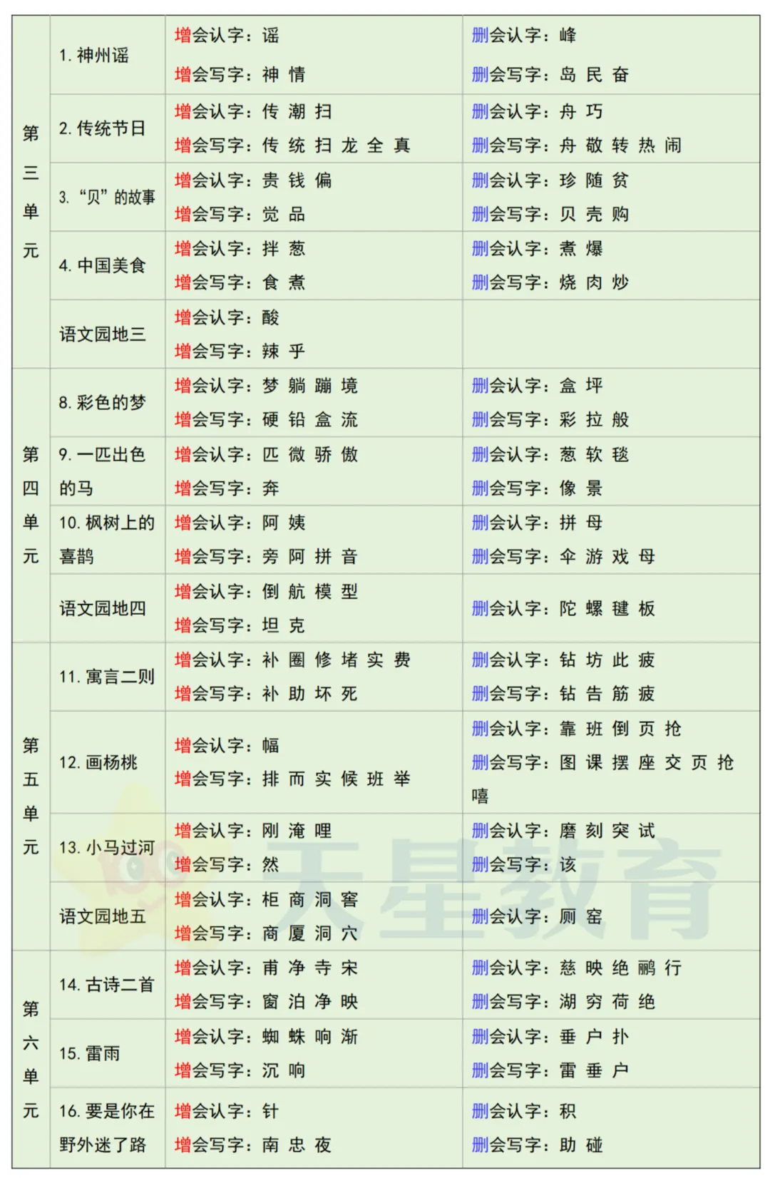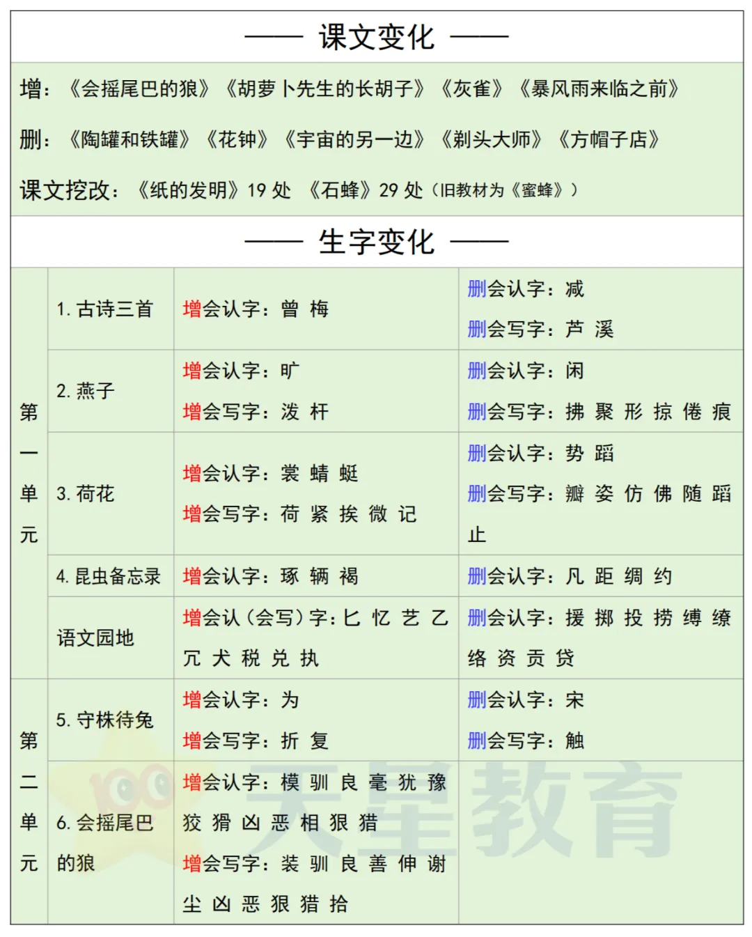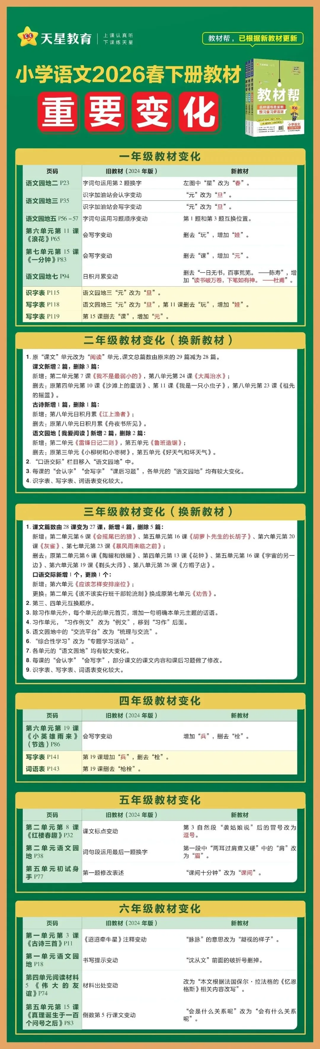 增:《会摇尾巴的狼》《胡萝卜先生的长胡子》《灰雀》《暴风雨来临之前》删:《陶罐和铁罐》《花钟》《宇宙的另一边》《剃头大师》《方帽子店》换:第二单元《该不该实行班干部轮流制》换成原第七单元《劝告》▲26春季语文《教材帮》已同步更新第三、四单元互换顺序;习作单元中“习作例文” 改为“例文”,移到“习作”后面;语文园地中的“交流平台”改为“梳理与交流”,各单元的“语文园地”均有较大变化。▲26春季语文《教材帮》已同步更新1-6年级语文教材变动情况
