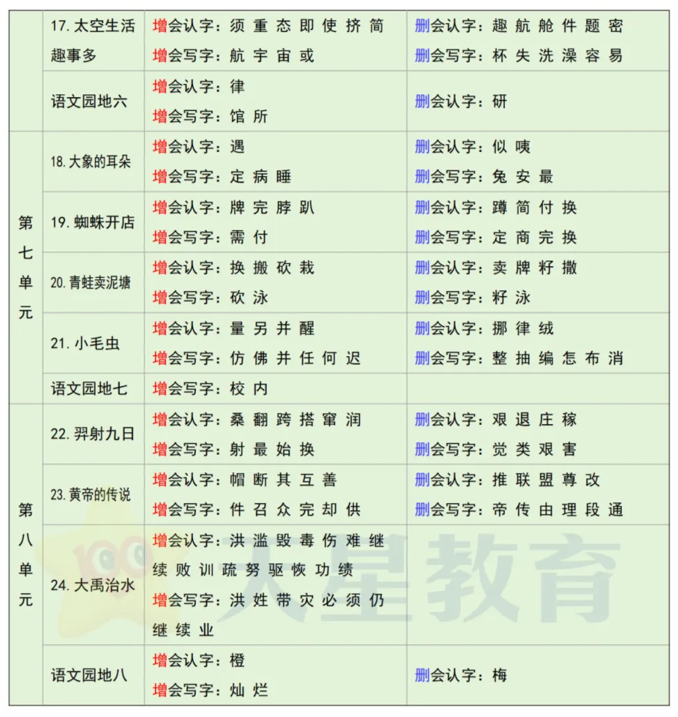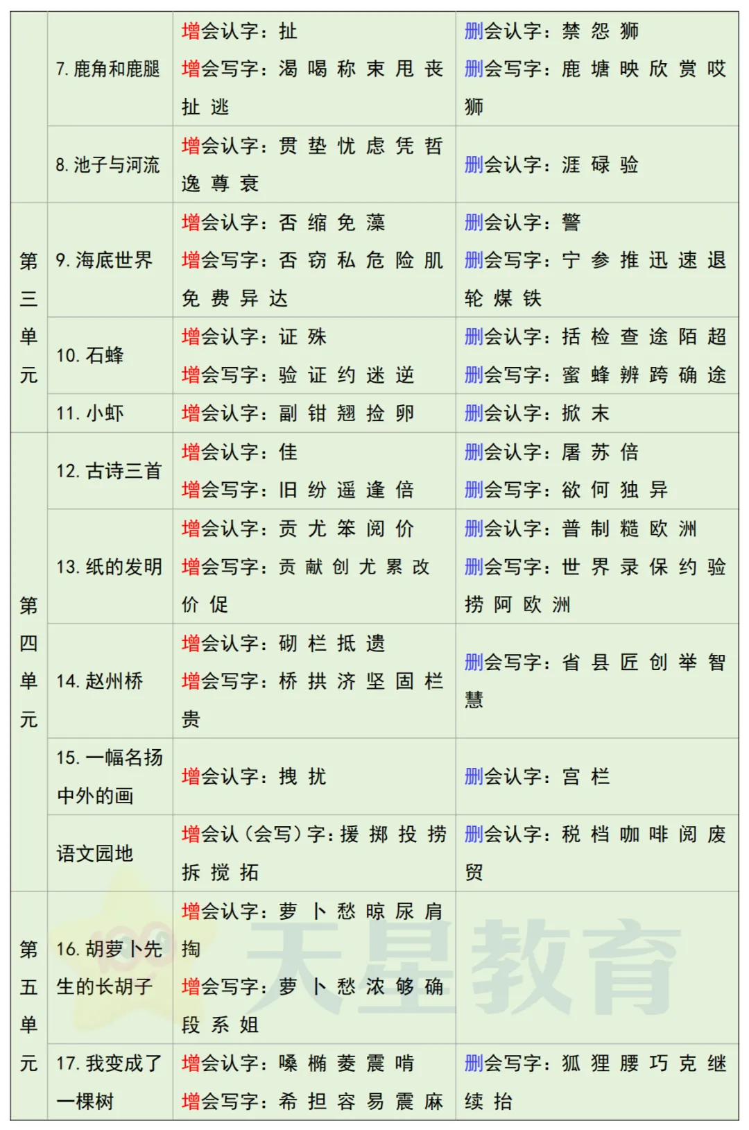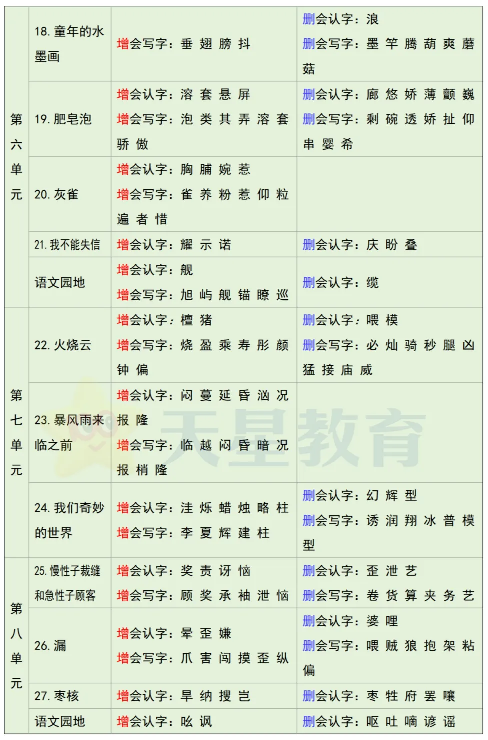 增:《会摇尾巴的狼》《胡萝卜先生的长胡子》《灰雀》《暴风雨来临之前》删:《陶罐和铁罐》《花钟》《宇宙的另一边》《剃头大师》《方帽子店》换:第二单元《该不该实行班干部轮流制》换成原第七单元《劝告》▲26春季语文《教材帮》已同步更新第三、四单元互换顺序;习作单元中“习作例文” 改为“例文”,移到“习作”后面;语文园地中的“交流平台”改为“梳理与交流”,各单元的“语文园地”均有较大变化。▲26春季语文《教材帮》已同步更新1-6年级语文教材变动情况