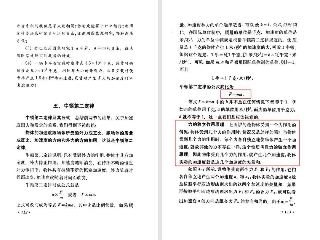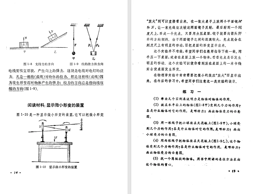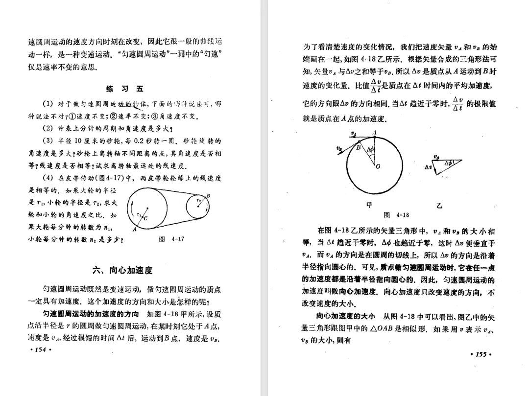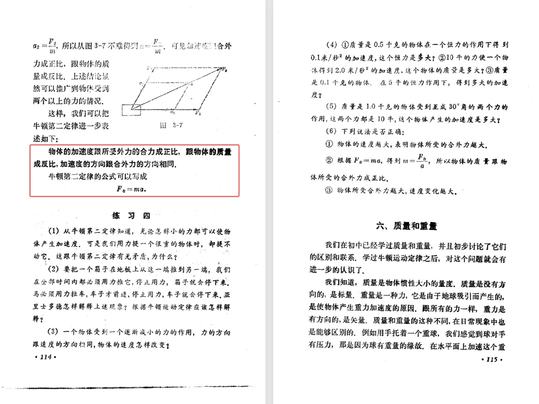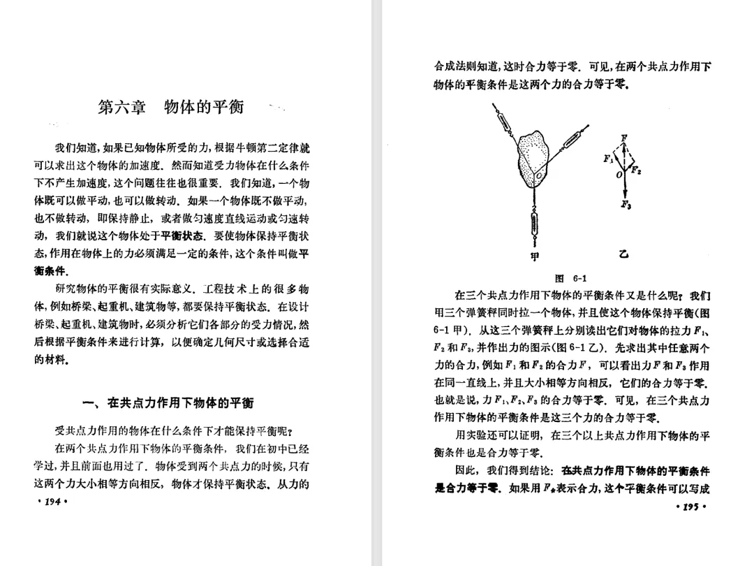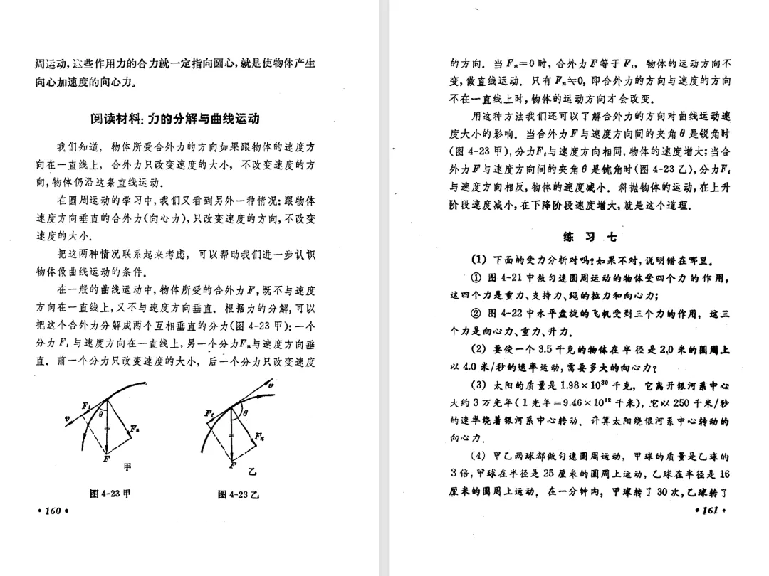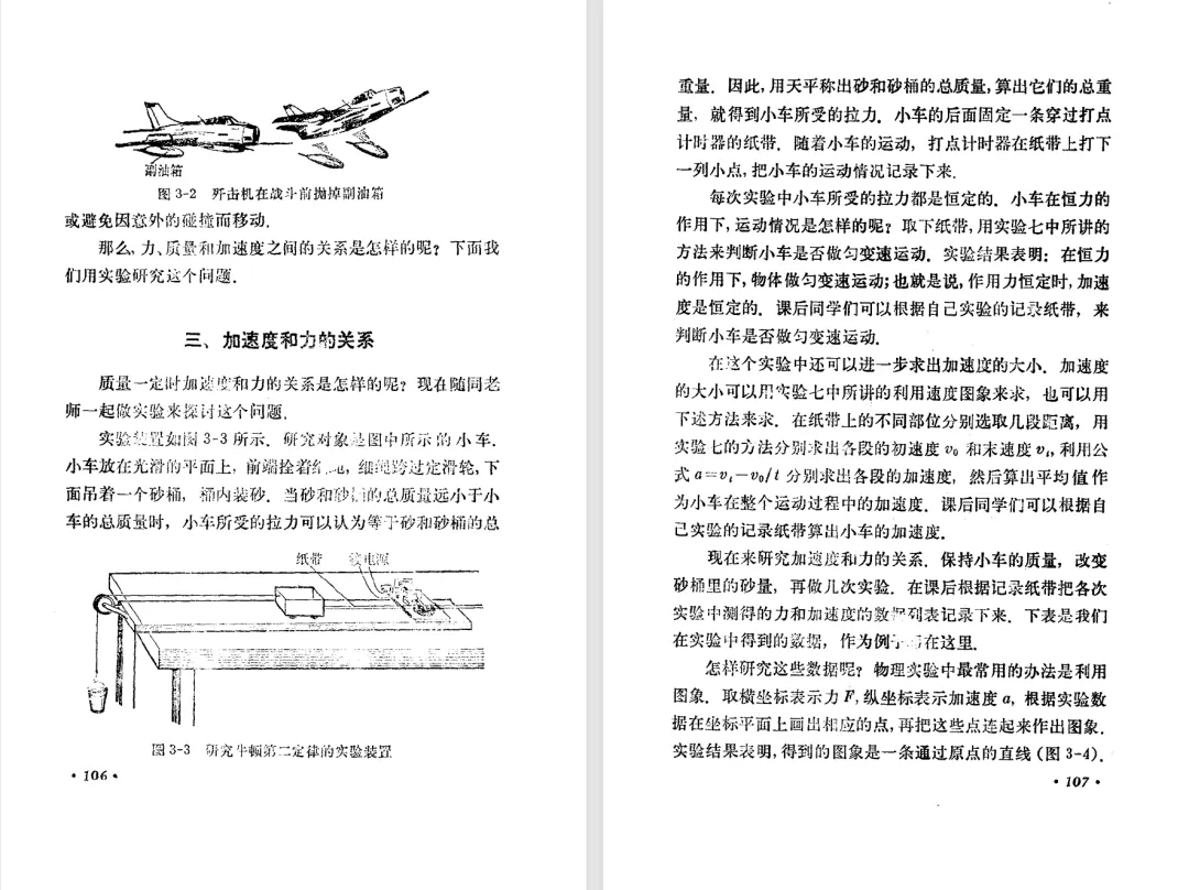 本文对高级中学课本 物理 甲种本 第一册进行详细介绍。本文将物理甲种本与上一版全日制十年制学校高中物理课本(简称旧教材)对比,展示两版教材的差异,从而了解教学要求和教材编写方式和风格的改变。通过本文的介绍,读者也可以认识到为什么人民教育出版社出版的《新中国中小学教材建设史 1949-2000 研究丛书 物理卷》(简称《物理教材建设史》)将全日制十年制学校高中物理称为20世纪最难的高中物理教材。下面再次展示旧教材和甲种本在力的部分的内容编排。左边一列是旧教材的,右边一列是甲种本的。值得注意的是,甲种本在第一章末尾才出现矢量和标量,最后一节仅介绍同一直线上的矢量的运算。旧教材在第一节 力,就说明力是矢量,并且介绍了矢量和标量的区别。下面是旧教材的相关页面。本节给出了力的平行四边形法则和三角形法则,但是没有给出力的合成的矢量表达式。显然,甲种本对矢量和矢量计算的要求相比旧教材降低了。旧教材不仅强调力的运算的矢量表达式,还强调力的运算的平行四边形法则和三角形法则;甲种本主要强调力的运算满足平行四边形法则和三角形法则。换句话说,甲种本弱化了力的运算的数学背景,降低了教学要求。先看甲种本增加的两个阅读材料。第一个阅读材料严格说是实验。第七节,教材给出了隔离法这一名词。旧教材在牛顿运动定律那一章才给出。下面是旧教材物体受力分析小节。旧教材给了三个例子,比甲种本还多。尽管教材没有提隔离法这个词,所使用的受力分析法同样是隔离法。下面看甲种本第六节 变速直线运动 平均速度 即时速度。甲种本同样采用极限法介绍即时速度。但是,甲种本删除了旧教材中利用位移-时间图象求即时速度的内容。下面展示旧教材对应的小节。下图第64页划线的文字开始,介绍利用位移-时间图象求即时速度。用位移-时间图象求即时速度,本质上是用函数图象求切线的斜率,这在全日十年制学制时期是高中二年级第二学期的内容,在高中一年级刚开学没多久在物理课提前接触这些数学知识,要求太高了。可能物理教材的编写者意识到了这个问题,所以在甲种本中删去了这部分内容。甲种本淡化了即时速度的数学背景,降低了即时速度的教学要求。如下图所示,由于教材将讨论的运动限制在了匀变速直线运动,所以只需要给出标量形式的加速度表达式。教材还增加了一个阅读材料,讲述速度和加速度的区别。如下图所示,旧教材没有将运动的讨论范围限定在匀变速,而是笼统地说变速,而且教材给出了矢量形式的加速度表达式。在运动定律这章,旧教材和甲种本差别最大的是牛顿第二定律。旧教材只有两节,甲种本有四节。甲种本分别用三个小节介绍引出牛顿第二定律的内容:物体运动状态的改变,加速度和力的关系,加速度和质量的关系,最后得出牛顿第二定律。而旧教材是在一节里完成对引出牛顿运动定律的实验,以及牛顿第二定律的介绍,在此基础上,再用一节对牛顿第二定律进行扩展补充。下面先看甲种本如何介绍牛顿第二定律。甲种本用第二、三、四三个小节做铺垫,到了第五节才真正介绍牛顿第二定律。下图第113页,教材给出了牛顿第二定律的标量表达式。后面介绍力的独立作用原理,讲物体在收到多个力的作用下的加速度如何计算。下图第114页,教材进一步给出物体在多个力的作用下的牛顿第二定律的表达式,这里用的也是标量表达式。再看旧教材 第二节 牛顿运动定律。本接开头教材仅仅用很短的一句话介绍力如何改变物体的运动状态,接下来教材仅仅通过定性地描述不同的实验结果,得出加速度和力的关系,以及加速度和质量的关系。如下图第114页所示,教材先给出标量形式的牛顿第二定律公式,再给出矢量形式的牛顿第二定律公式。有关牛顿第二定律的讨论,单独成节。如下图第116页所示,教材给出矢量形式的物体受多个外力情况下的牛顿第二定律。第117页的物体做曲线运动的条件,甲种本放在了曲线运动一章介绍。比较旧教材和甲种本牛顿第二定律的内容,我们可以发现,甲种本花了更多的篇幅介绍牛顿第二定律的背景,如何通过实验推导出牛顿第二定律,让学生经历牛顿第二定律发现的过程。旧教材对牛顿第二定律的介绍篇幅较少,更像是给学生灌输知识,但是旧教材给出了牛顿第二定律的矢量表达式,对学生的要求更高。下面展示甲种本增加了超重和失重的内容。旧教材是在讲人造地球卫星部分才介绍超重和失重的,而且篇幅很短。通过对比旧教材和甲种本,我们可以发现,甲种本对知识的讲解更详细,并且主要采用标量语言描述运动定律,几乎没有采用矢量语言。所以,甲种本的数学背景和教学要求是更低的。下面看甲种本的 第二节 运动的合成和分解,这节内容不多,而且没有分开介绍位移的合成和速度的合成,比较笼统。下面看旧教材对应的小节。旧教材的讲解非常详细,先讲平面上的位移,再讲位移的合成与分解,最后讲速度的合成与分解。本节全程使用矢量表达式。加下来看甲种本 第六节 向心加速度,本节给出了匀速圆周运动向心加速度的方向和大小的推导。需要注意的是,A点和B点速度的差值\Delta v的计算是矢量运算。旧教材对于向心加速度的推导更详细。旧教材对于匀速圆周运动向心加速度方向的推导更详细,有角度的计算,详细地说明