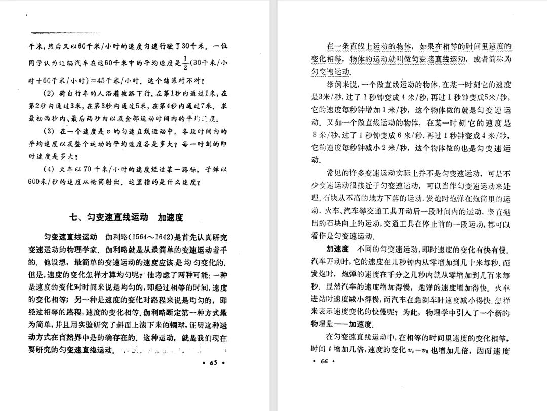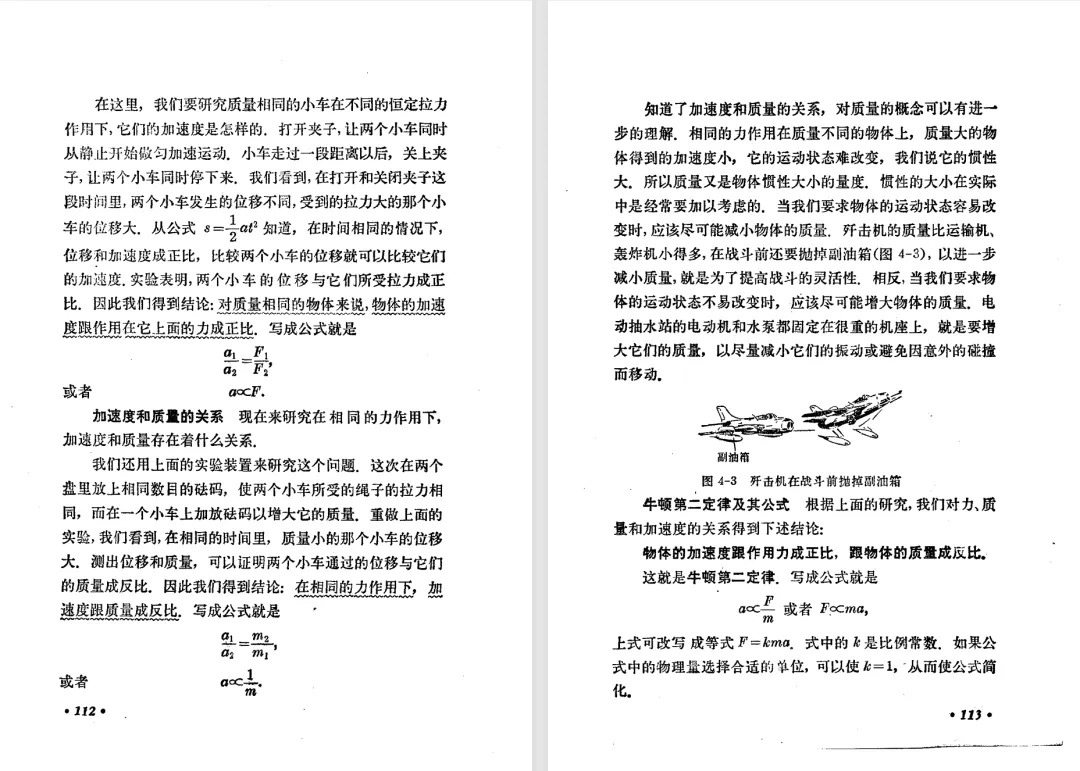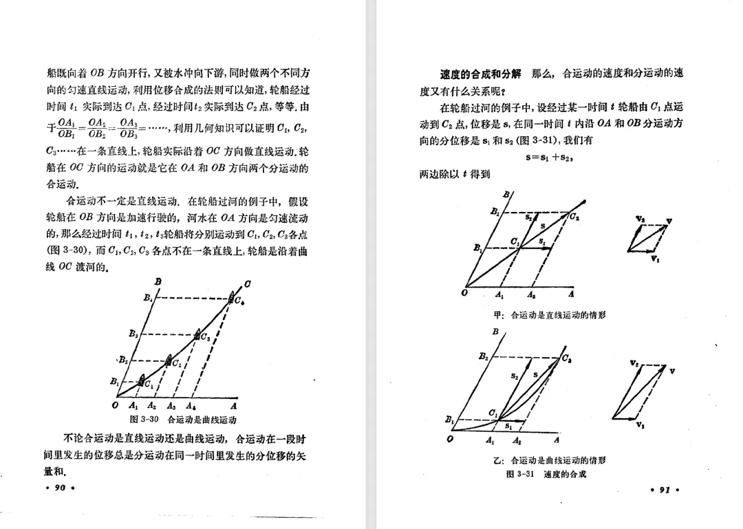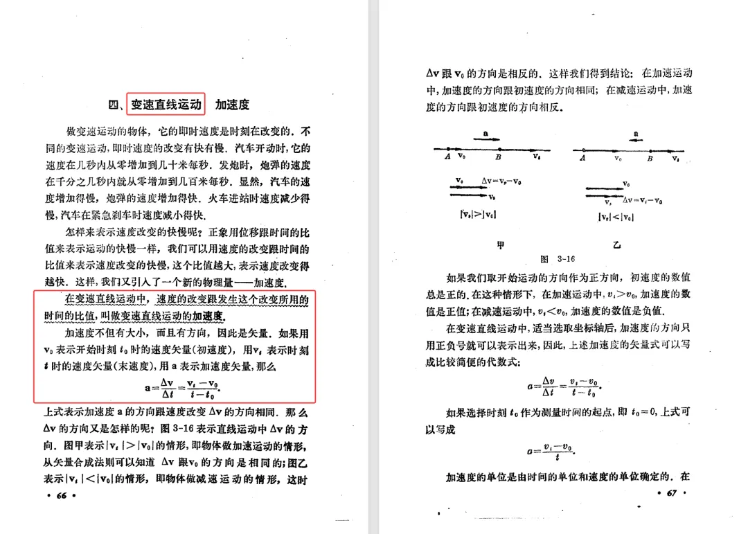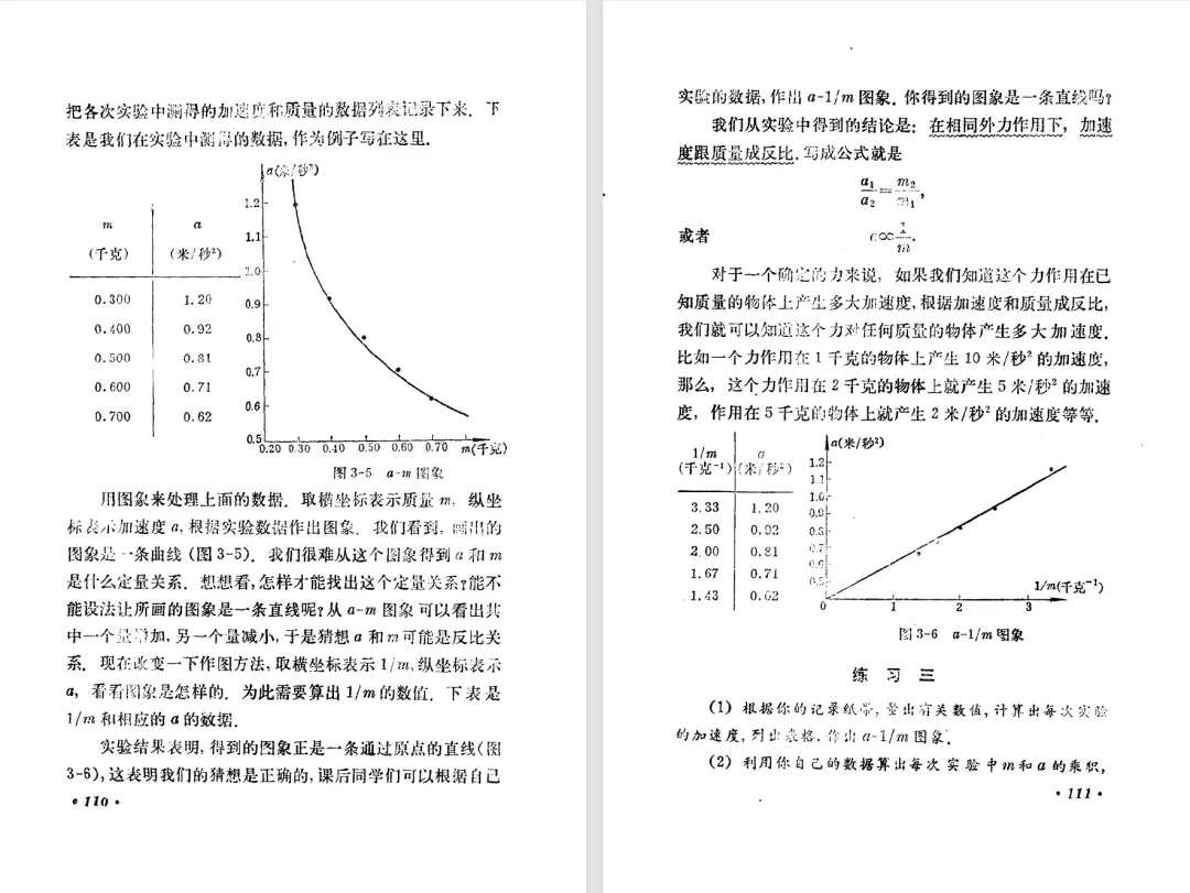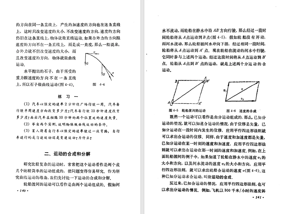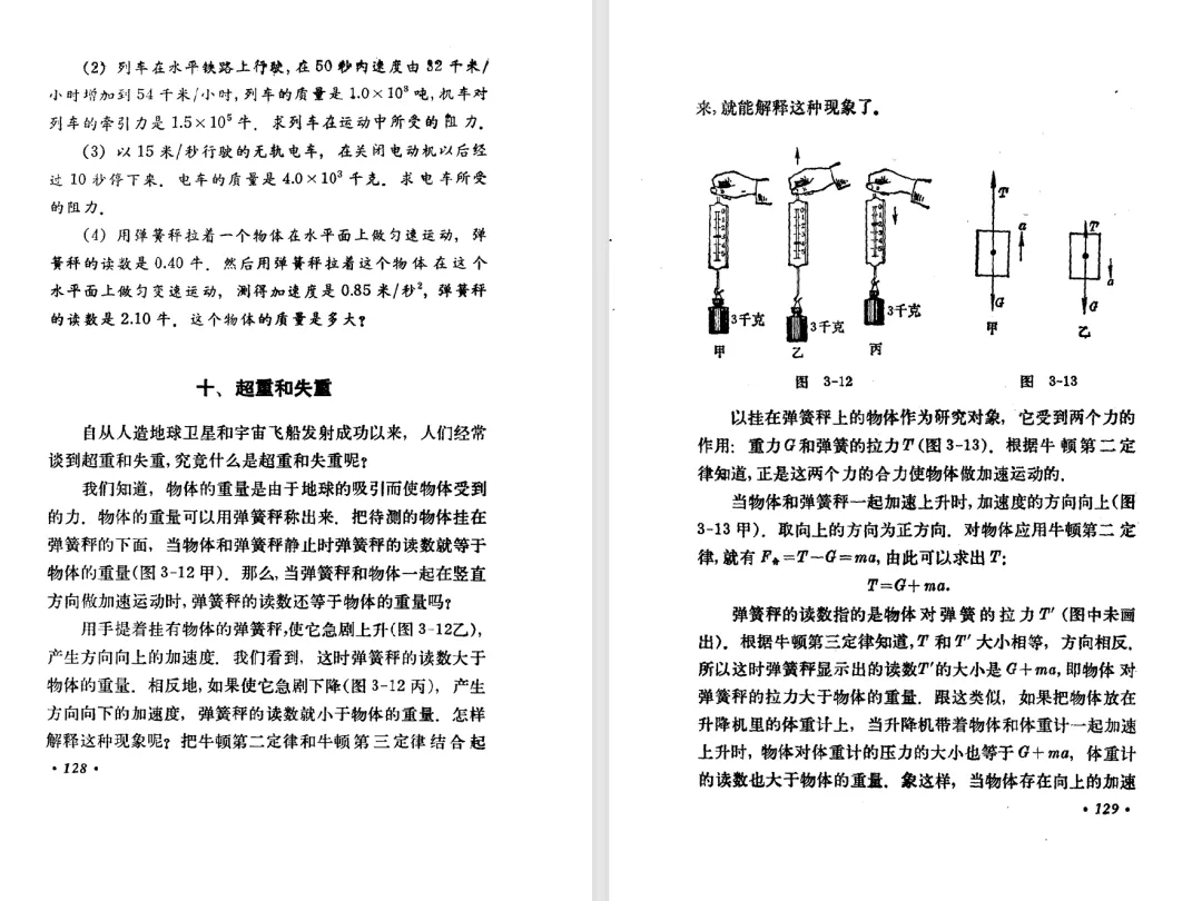 本文对高级中学课本 物理 甲种本 第一册进行详细介绍。本文将物理甲种本与上一版全日制十年制学校高中物理课本(简称旧教材)对比,展示两版教材的差异,从而了解教学要求和教材编写方式和风格的改变。通过本文的介绍,读者也可以认识到为什么人民教育出版社出版的《新中国中小学教材建设史 1949-2000 研究丛书 物理卷》(简称《物理教材建设史》)将全日制十年制学校高中物理称为20世纪最难的高中物理教材。下面再次展示旧教材和甲种本在力的部分的内容编排。左边一列是旧教材的,右边一列是甲种本的。值得注意的是,甲种本在第一章末尾才出现矢量和标量,最后一节仅介绍同一直线上的矢量的运算。旧教材在第一节 力,就说明力是矢量,并且介绍了矢量和标量的区别。下面是旧教材的相关页面。本节给出了力的平行四边形法则和三角形法则,但是没有给出力的合成的矢量表达式。显然,甲种本对矢量和矢量计算的要求相比旧教材降低了。旧教材不仅强调力的运算的矢量表达式,还强调力的运算的平行四边形法则和三角形法则;甲种本主要强调力的运算满足平行四边形法则和三角形法则。换句话说,甲种本弱化了力的运算的数学背景,降低了教学要求。先看甲种本增加的两个阅读材料。第一个阅读材料严格说是实验。第七节,教材给出了隔离法这一名词。旧教材在牛顿运动定律那一章才给出。下面是旧教材物体受力分析小节。旧教材给了三个例子,比甲种本还多。尽管教材没有提隔离法这个词,所使用的受力分析法同样是隔离法。下面看甲种本第六节 变速直线运动 平均速度 即时速度。甲种本同样采用极限法介绍即时速度。但是,甲种本删除了旧教材中利用位移-时间图象求即时速度的内容。下面展示旧教材对应的小节。下图第64页划线的文字开始,介绍利用位移-时间图象求即时速度。用位移-时间图象求即时速度,本质上是用函数图象求切线的斜率,这在全日十年制学制时期是高中二年级第二学期的内容,在高中一年级刚开学没多久在物理课提前接触这些数学知识,要求太高了。可能物理教材的编写者意识到了这个问题,所以在甲种本中删去了这部分内容。甲种本淡化了即时速度的数学背景,降低了即时速度的教学要求。如下图所示,由于教材将讨论的运动限制在了匀变速直线运动,所以只需要给出标量形式的加速度表达式。教材还增加了一个阅读材料,讲述速度和加速度的区别。如下图所示,旧教材没有将运动的讨论范围限定在匀变速,而是笼统地说变速,而且教材给出了矢量形式的加速度表达式。在运动定律这章,旧教材和甲种本差别最大的是牛顿第二定律。旧教材只有两节,甲种本有四节。甲种本分别用三个小节介绍引出牛顿第二定律的内容:物体运动状态的改变,加速度和力的关系,加速度和质量的关系,最后得出牛顿第二定律。而旧教材是在一节里完成对引出牛顿运动定律的实验,以及牛顿第二定律的介绍,在此基础上,再用一节对牛顿第二定律进行扩展补充。下面先看甲种本如何介绍牛顿第二定律。甲种本用第二、三、四三个小节做铺垫,到了第五节才真正介绍牛顿第二定律。下图第113页,教材给出了牛顿第二定律的标量表达式。后面介绍力的独立作用原理,讲物体在收到多个力的作用下的加速度如何计算。下图第114页,教材进一步给出物体在多个力的作用下的牛顿第二定律的表达式,这里用的也是标量表达式。再看旧教材 第二节 牛顿运动定律。本接开头教材仅仅用很短的一句话介绍力如何改变物体的运动状态,接下来教材仅仅通过定性地描述不同的实验结果,得出加速度和力的关系,以及加速度和质量的关系。如下图第114页所示,教材先给出标量形式的牛顿第二定律公式,再给出矢量形式的牛顿第二定律公式。有关牛顿第二定律的讨论,单独成节。如下图第116页所示,教材给出矢量形式的物体受多个外力情况下的牛顿第二定律。第117页的物体做曲线运动的条件,甲种本放在了曲线运动一章介绍。比较旧教材和甲种本牛顿第二定律的内容,我们可以发现,甲种本花了更多的篇幅介绍牛顿第二定律的背景,如何通过实验推导出牛顿第二定律,让学生经历牛顿第二定律发现的过程。旧教材对牛顿第二定律的介绍篇幅较少,更像是给学生灌输知识,但是旧教材给出了牛顿第二定律的矢量表达式,对学生的要求更高。下面展示甲种本增加了超重和失重的内容。旧教材是在讲人造地球卫星部分才介绍超重和失重的,而且篇幅很短。通过对比旧教材和甲种本,我们可以发现,甲种本对知识的讲解更详细,并且主要采用标量语言描述运动定律,几乎没有采用矢量语言。所以,甲种本的数学背景和教学要求是更低的。下面看甲种本的 第二节 运动的合成和分解,这节内容不多,而且没有分开介绍位移的合成和速度的合成,比较笼统。下面看旧教材对应的小节。旧教材的讲解非常详细,先讲平面上的位移,再讲位移的合成与分解,最后讲速度的合成与分解。本节全程使用矢量表达式。加下来看甲种本 第六节 向心加速度,本节给出了匀速圆周运动向心加速度的方向和大小的推导。需要注意的是,A点和B点速度的差值\Delta v的计算是矢量运算。旧教材对于向心加速度的推导更详细。旧教材对于匀速圆周运动向心加速度方向的推导更详细,有角度的计算,详细地说明