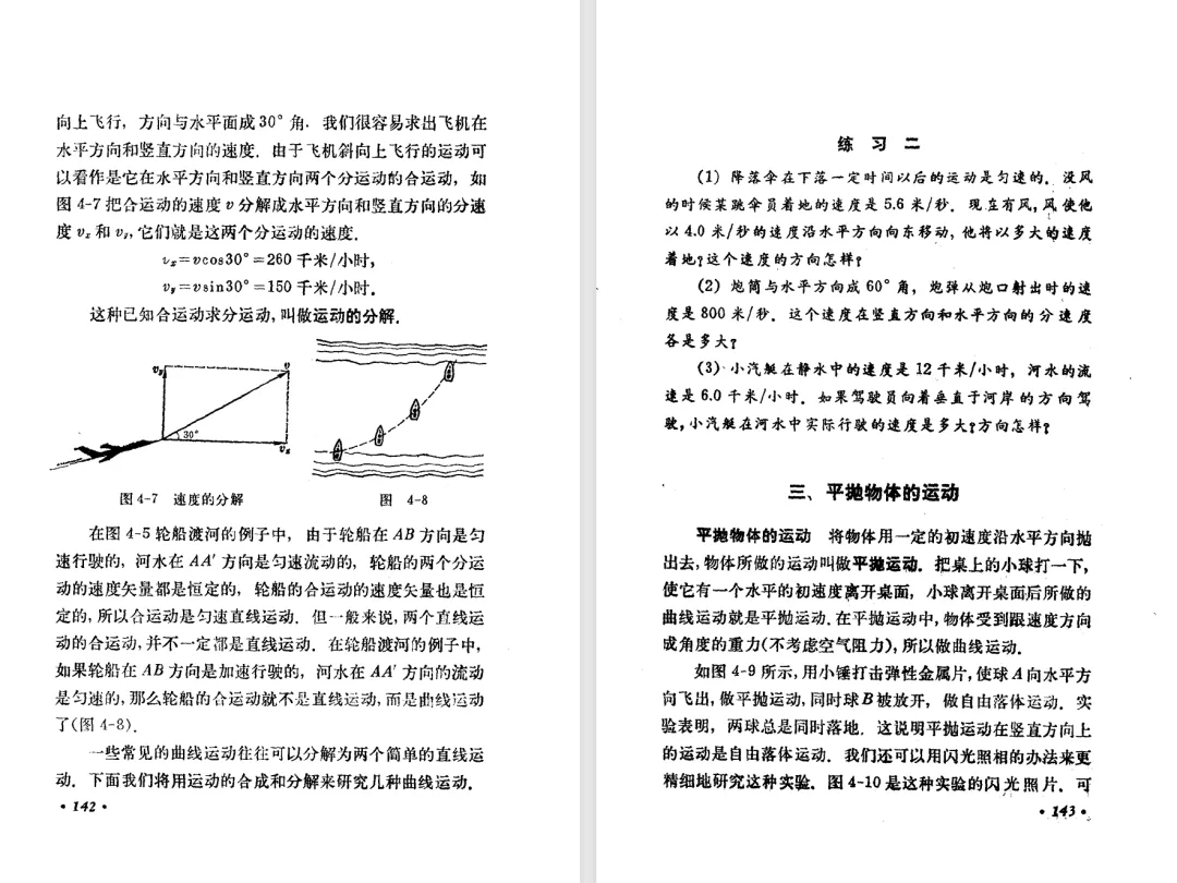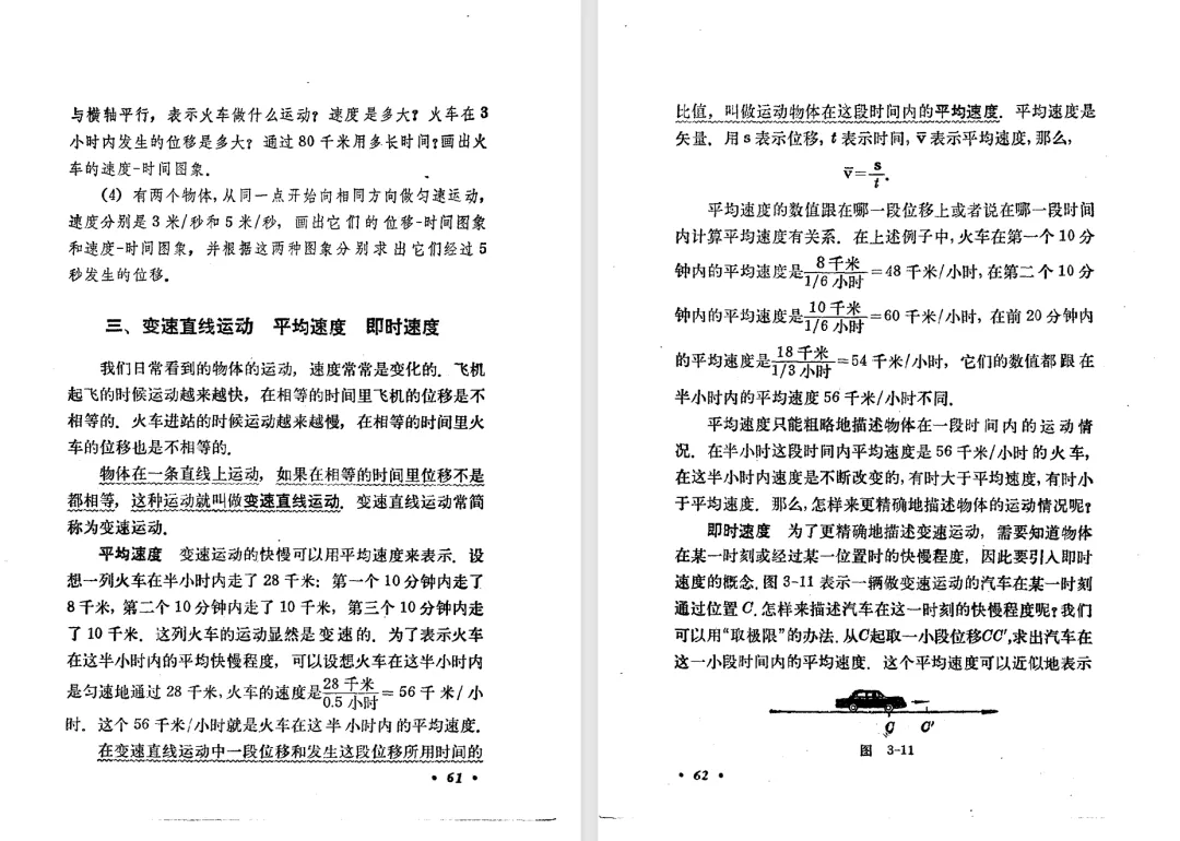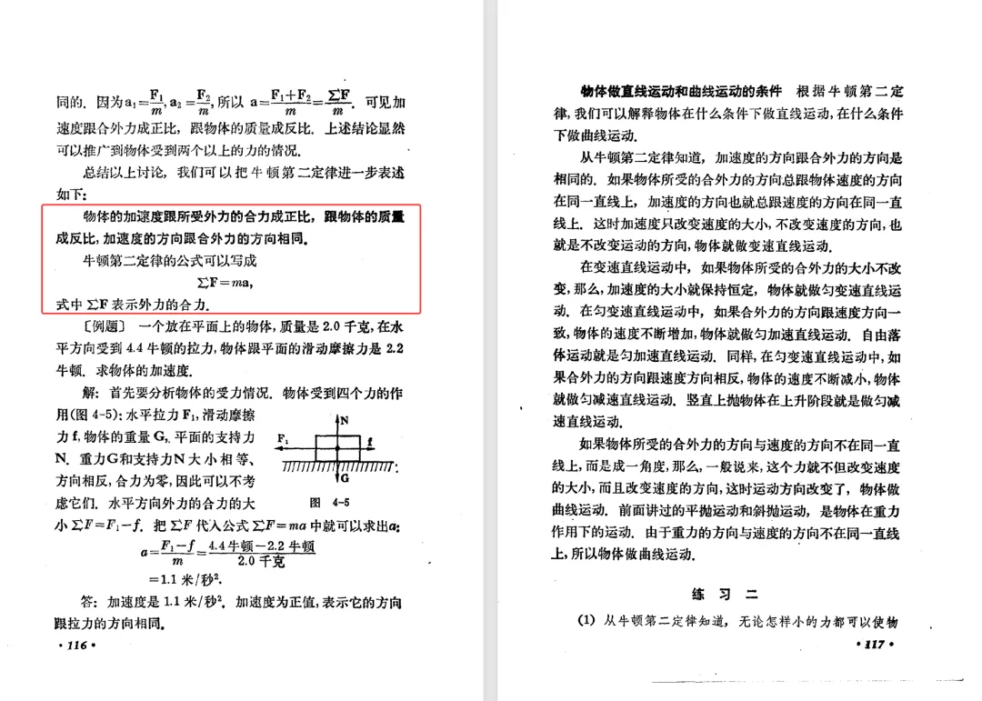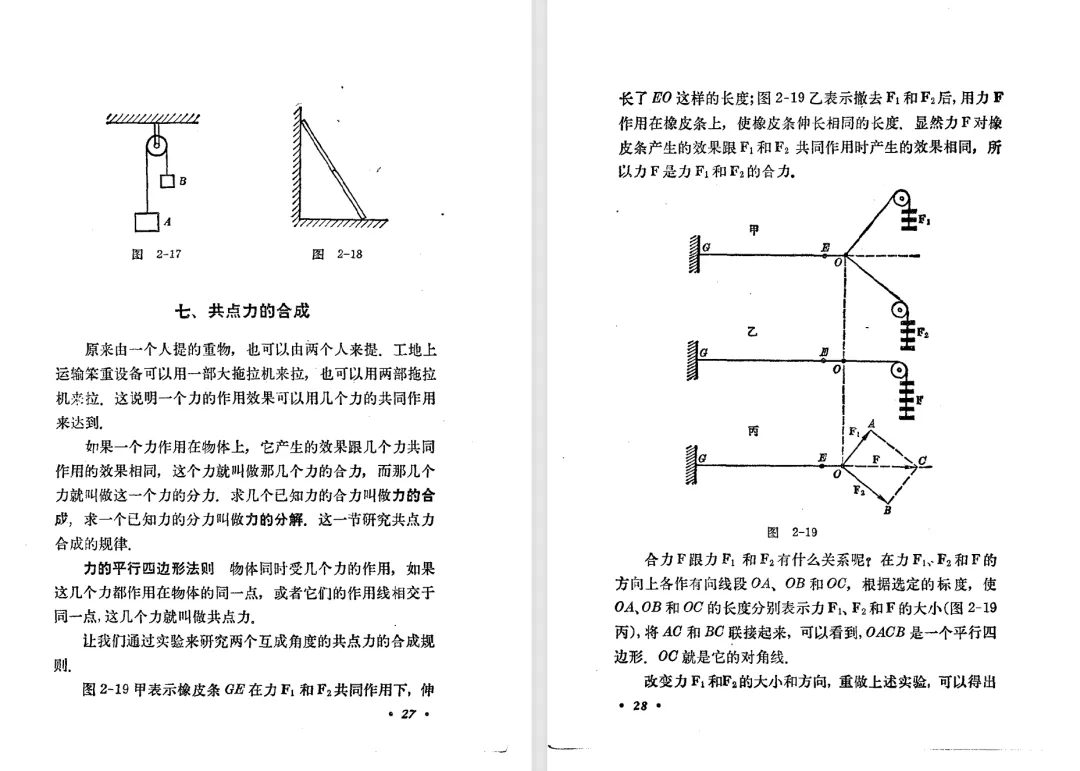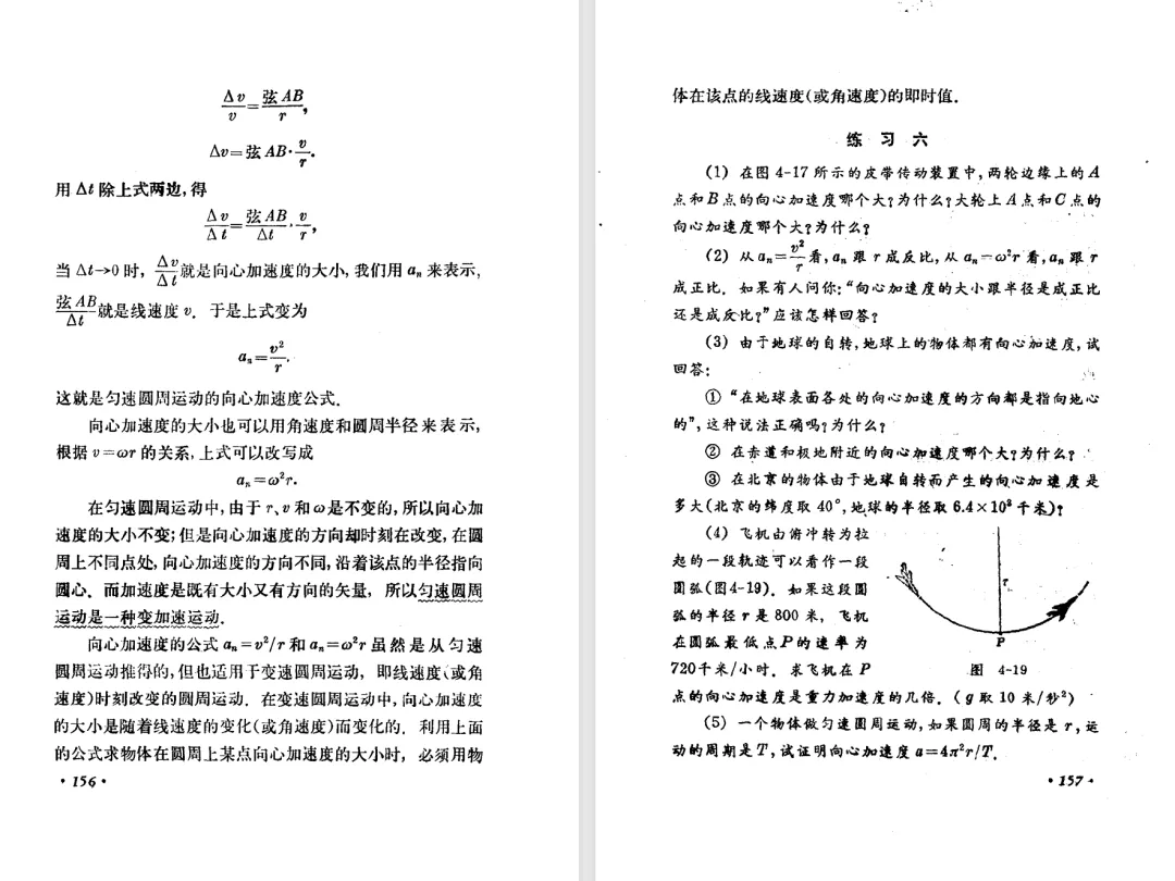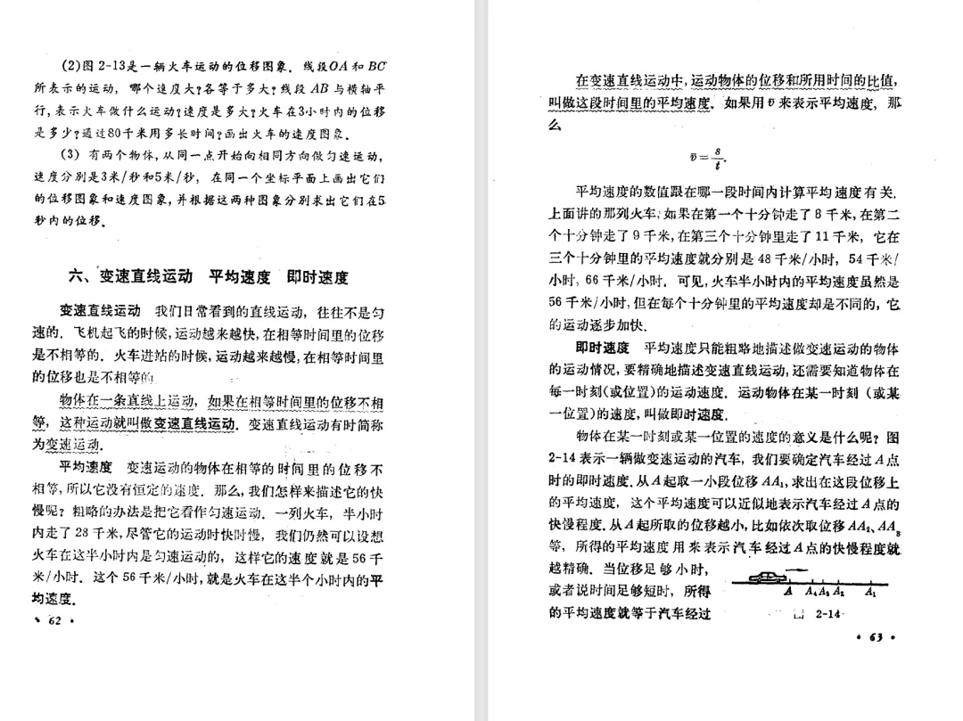 本文对高级中学课本 物理 甲种本 第一册进行详细介绍。本文将物理甲种本与上一版全日制十年制学校高中物理课本(简称旧教材)对比,展示两版教材的差异,从而了解教学要求和教材编写方式和风格的改变。通过本文的介绍,读者也可以认识到为什么人民教育出版社出版的《新中国中小学教材建设史 1949-2000 研究丛书 物理卷》(简称《物理教材建设史》)将全日制十年制学校高中物理称为20世纪最难的高中物理教材。下面再次展示旧教材和甲种本在力的部分的内容编排。左边一列是旧教材的,右边一列是甲种本的。值得注意的是,甲种本在第一章末尾才出现矢量和标量,最后一节仅介绍同一直线上的矢量的运算。旧教材在第一节 力,就说明力是矢量,并且介绍了矢量和标量的区别。下面是旧教材的相关页面。本节给出了力的平行四边形法则和三角形法则,但是没有给出力的合成的矢量表达式。显然,甲种本对矢量和矢量计算的要求相比旧教材降低了。旧教材不仅强调力的运算的矢量表达式,还强调力的运算的平行四边形法则和三角形法则;甲种本主要强调力的运算满足平行四边形法则和三角形法则。换句话说,甲种本弱化了力的运算的数学背景,降低了教学要求。先看甲种本增加的两个阅读材料。第一个阅读材料严格说是实验。第七节,教材给出了隔离法这一名词。旧教材在牛顿运动定律那一章才给出。下面是旧教材物体受力分析小节。旧教材给了三个例子,比甲种本还多。尽管教材没有提隔离法这个词,所使用的受力分析法同样是隔离法。下面看甲种本第六节 变速直线运动 平均速度 即时速度。甲种本同样采用极限法介绍即时速度。但是,甲种本删除了旧教材中利用位移-时间图象求即时速度的内容。下面展示旧教材对应的小节。下图第64页划线的文字开始,介绍利用位移-时间图象求即时速度。用位移-时间图象求即时速度,本质上是用函数图象求切线的斜率,这在全日十年制学制时期是高中二年级第二学期的内容,在高中一年级刚开学没多久在物理课提前接触这些数学知识,要求太高了。可能物理教材的编写者意识到了这个问题,所以在甲种本中删去了这部分内容。甲种本淡化了即时速度的数学背景,降低了即时速度的教学要求。如下图所示,由于教材将讨论的运动限制在了匀变速直线运动,所以只需要给出标量形式的加速度表达式。教材还增加了一个阅读材料,讲述速度和加速度的区别。如下图所示,旧教材没有将运动的讨论范围限定在匀变速,而是笼统地说变速,而且教材给出了矢量形式的加速度表达式。在运动定律这章,旧教材和甲种本差别最大的是牛顿第二定律。旧教材只有两节,甲种本有四节。甲种本分别用三个小节介绍引出牛顿第二定律的内容:物体运动状态的改变,加速度和力的关系,加速度和质量的关系,最后得出牛顿第二定律。而旧教材是在一节里完成对引出牛顿运动定律的实验,以及牛顿第二定律的介绍,在此基础上,再用一节对牛顿第二定律进行扩展补充。下面先看甲种本如何介绍牛顿第二定律。甲种本用第二、三、四三个小节做铺垫,到了第五节才真正介绍牛顿第二定律。下图第113页,教材给出了牛顿第二定律的标量表达式。后面介绍力的独立作用原理,讲物体在收到多个力的作用下的加速度如何计算。下图第114页,教材进一步给出物体在多个力的作用下的牛顿第二定律的表达式,这里用的也是标量表达式。再看旧教材 第二节 牛顿运动定律。本接开头教材仅仅用很短的一句话介绍力如何改变物体的运动状态,接下来教材仅仅通过定性地描述不同的实验结果,得出加速度和力的关系,以及加速度和质量的关系。如下图第114页所示,教材先给出标量形式的牛顿第二定律公式,再给出矢量形式的牛顿第二定律公式。有关牛顿第二定律的讨论,单独成节。如下图第116页所示,教材给出矢量形式的物体受多个外力情况下的牛顿第二定律。第117页的物体做曲线运动的条件,甲种本放在了曲线运动一章介绍。比较旧教材和甲种本牛顿第二定律的内容,我们可以发现,甲种本花了更多的篇幅介绍牛顿第二定律的背景,如何通过实验推导出牛顿第二定律,让学生经历牛顿第二定律发现的过程。旧教材对牛顿第二定律的介绍篇幅较少,更像是给学生灌输知识,但是旧教材给出了牛顿第二定律的矢量表达式,对学生的要求更高。下面展示甲种本增加了超重和失重的内容。旧教材是在讲人造地球卫星部分才介绍超重和失重的,而且篇幅很短。通过对比旧教材和甲种本,我们可以发现,甲种本对知识的讲解更详细,并且主要采用标量语言描述运动定律,几乎没有采用矢量语言。所以,甲种本的数学背景和教学要求是更低的。下面看甲种本的 第二节 运动的合成和分解,这节内容不多,而且没有分开介绍位移的合成和速度的合成,比较笼统。下面看旧教材对应的小节。旧教材的讲解非常详细,先讲平面上的位移,再讲位移的合成与分解,最后讲速度的合成与分解。本节全程使用矢量表达式。加下来看甲种本 第六节 向心加速度,本节给出了匀速圆周运动向心加速度的方向和大小的推导。需要注意的是,A点和B点速度的差值\Delta v的计算是矢量运算。旧教材对于向心加速度的推导更详细。旧教材对于匀速圆周运动向心加速度方向的推导更详细,有角度的计算,详细地说明