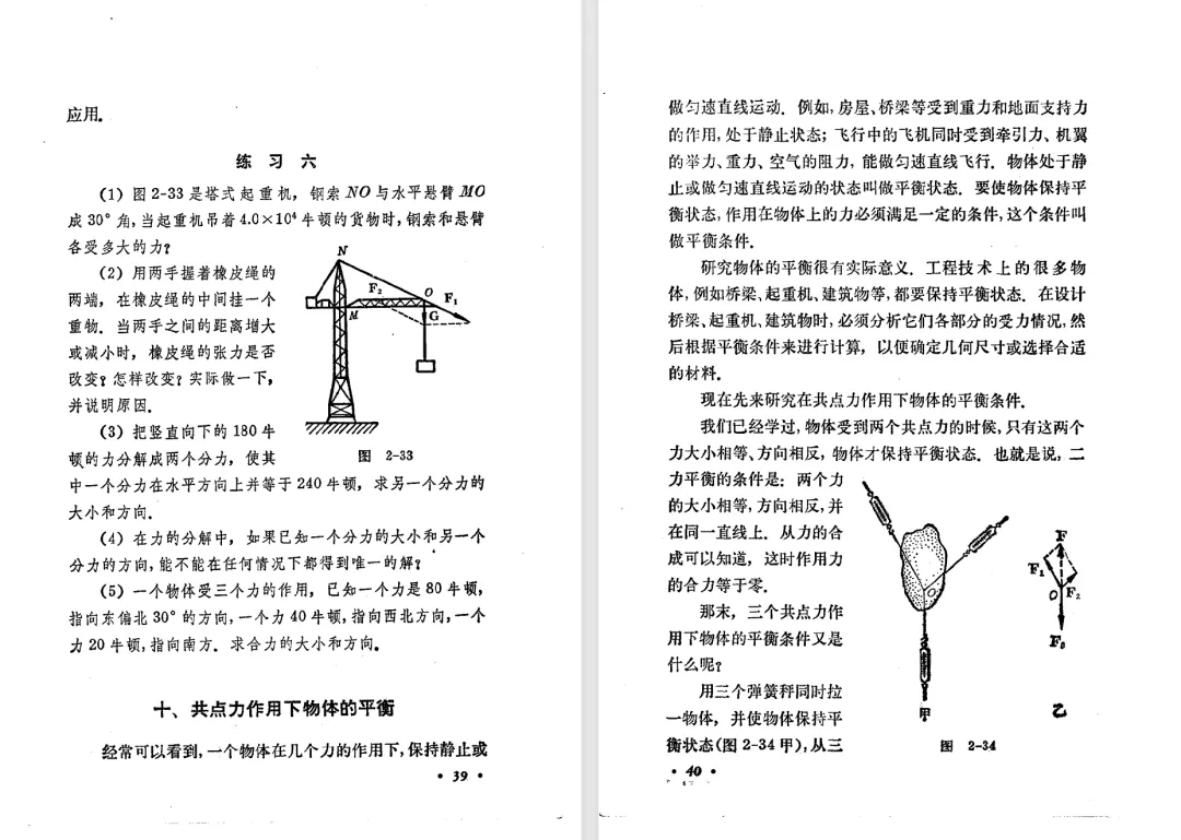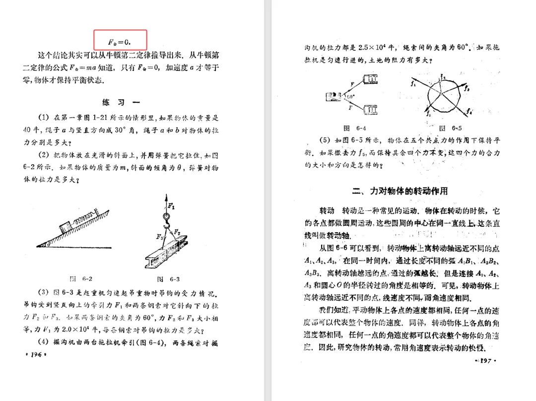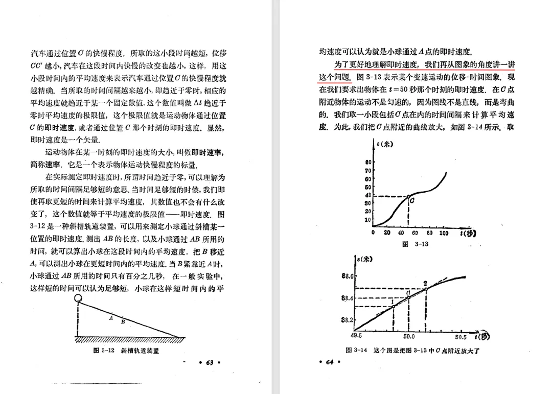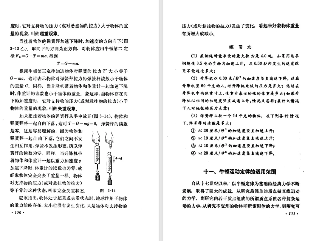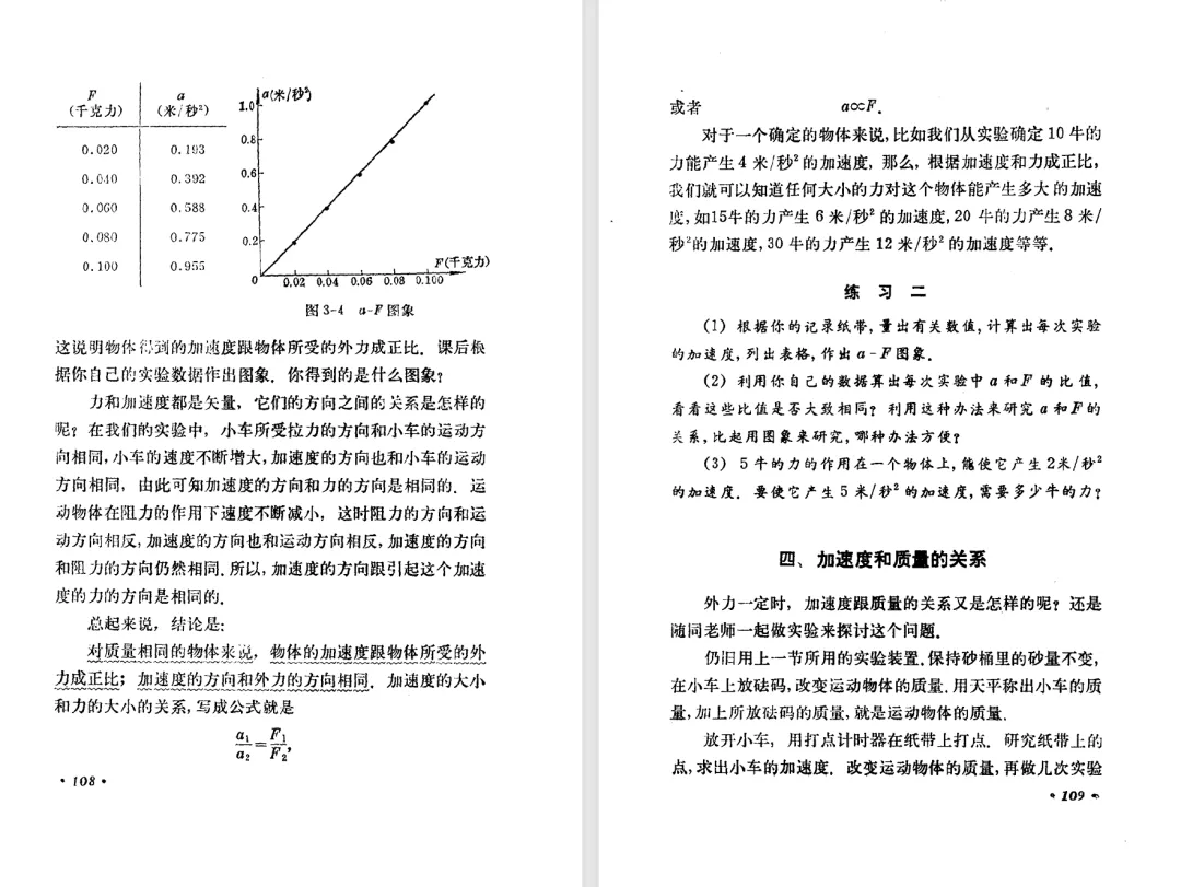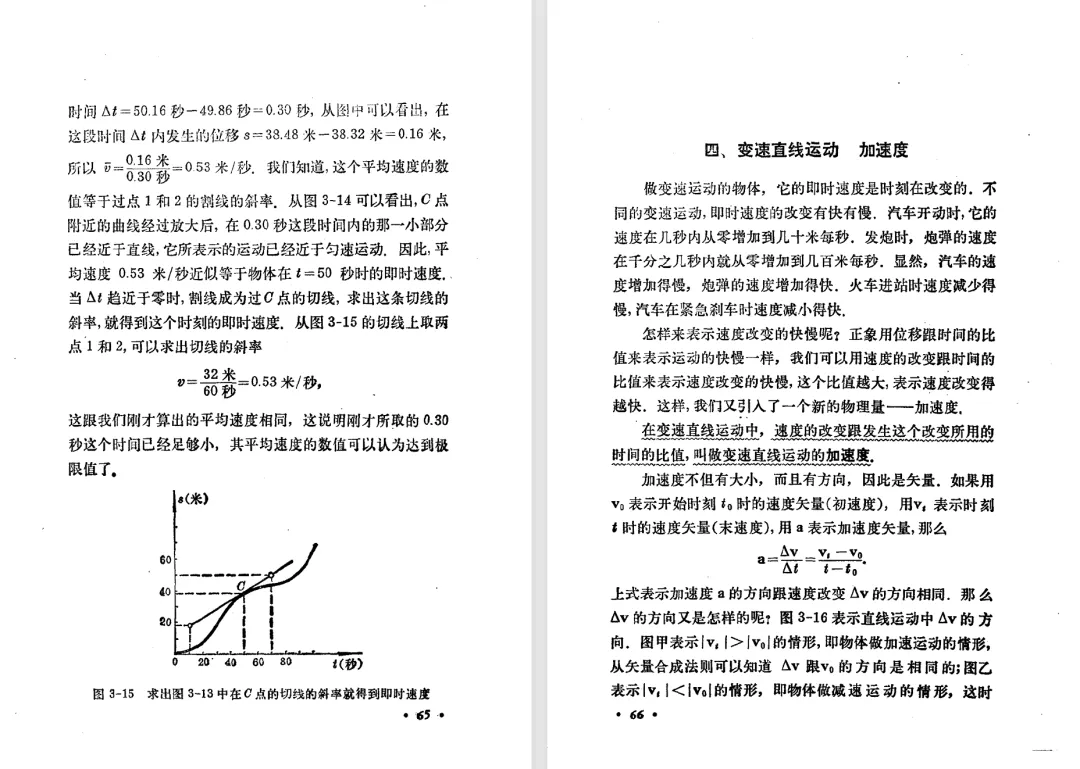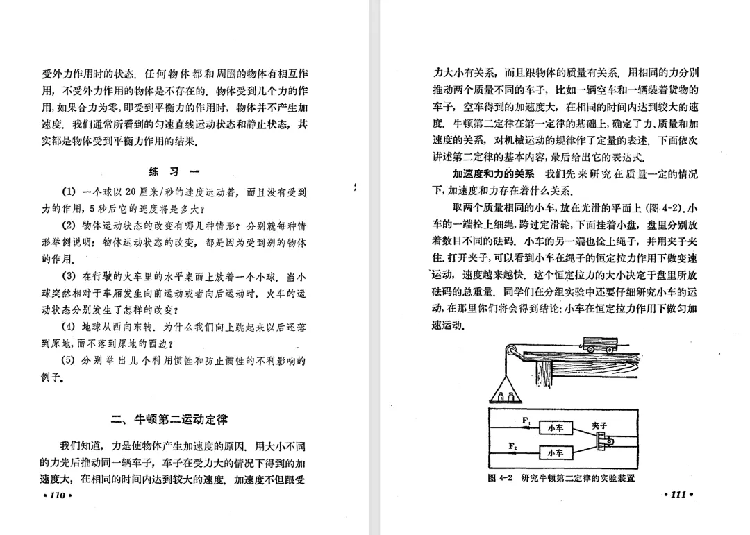 本文对高级中学课本 物理 甲种本 第一册进行详细介绍。本文将物理甲种本与上一版全日制十年制学校高中物理课本(简称旧教材)对比,展示两版教材的差异,从而了解教学要求和教材编写方式和风格的改变。通过本文的介绍,读者也可以认识到为什么人民教育出版社出版的《新中国中小学教材建设史 1949-2000 研究丛书 物理卷》(简称《物理教材建设史》)将全日制十年制学校高中物理称为20世纪最难的高中物理教材。下面再次展示旧教材和甲种本在力的部分的内容编排。左边一列是旧教材的,右边一列是甲种本的。值得注意的是,甲种本在第一章末尾才出现矢量和标量,最后一节仅介绍同一直线上的矢量的运算。旧教材在第一节 力,就说明力是矢量,并且介绍了矢量和标量的区别。下面是旧教材的相关页面。本节给出了力的平行四边形法则和三角形法则,但是没有给出力的合成的矢量表达式。显然,甲种本对矢量和矢量计算的要求相比旧教材降低了。旧教材不仅强调力的运算的矢量表达式,还强调力的运算的平行四边形法则和三角形法则;甲种本主要强调力的运算满足平行四边形法则和三角形法则。换句话说,甲种本弱化了力的运算的数学背景,降低了教学要求。先看甲种本增加的两个阅读材料。第一个阅读材料严格说是实验。第七节,教材给出了隔离法这一名词。旧教材在牛顿运动定律那一章才给出。下面是旧教材物体受力分析小节。旧教材给了三个例子,比甲种本还多。尽管教材没有提隔离法这个词,所使用的受力分析法同样是隔离法。下面看甲种本第六节 变速直线运动 平均速度 即时速度。甲种本同样采用极限法介绍即时速度。但是,甲种本删除了旧教材中利用位移-时间图象求即时速度的内容。下面展示旧教材对应的小节。下图第64页划线的文字开始,介绍利用位移-时间图象求即时速度。用位移-时间图象求即时速度,本质上是用函数图象求切线的斜率,这在全日十年制学制时期是高中二年级第二学期的内容,在高中一年级刚开学没多久在物理课提前接触这些数学知识,要求太高了。可能物理教材的编写者意识到了这个问题,所以在甲种本中删去了这部分内容。甲种本淡化了即时速度的数学背景,降低了即时速度的教学要求。如下图所示,由于教材将讨论的运动限制在了匀变速直线运动,所以只需要给出标量形式的加速度表达式。教材还增加了一个阅读材料,讲述速度和加速度的区别。如下图所示,旧教材没有将运动的讨论范围限定在匀变速,而是笼统地说变速,而且教材给出了矢量形式的加速度表达式。在运动定律这章,旧教材和甲种本差别最大的是牛顿第二定律。旧教材只有两节,甲种本有四节。甲种本分别用三个小节介绍引出牛顿第二定律的内容:物体运动状态的改变,加速度和力的关系,加速度和质量的关系,最后得出牛顿第二定律。而旧教材是在一节里完成对引出牛顿运动定律的实验,以及牛顿第二定律的介绍,在此基础上,再用一节对牛顿第二定律进行扩展补充。下面先看甲种本如何介绍牛顿第二定律。甲种本用第二、三、四三个小节做铺垫,到了第五节才真正介绍牛顿第二定律。下图第113页,教材给出了牛顿第二定律的标量表达式。后面介绍力的独立作用原理,讲物体在收到多个力的作用下的加速度如何计算。下图第114页,教材进一步给出物体在多个力的作用下的牛顿第二定律的表达式,这里用的也是标量表达式。再看旧教材 第二节 牛顿运动定律。本接开头教材仅仅用很短的一句话介绍力如何改变物体的运动状态,接下来教材仅仅通过定性地描述不同的实验结果,得出加速度和力的关系,以及加速度和质量的关系。如下图第114页所示,教材先给出标量形式的牛顿第二定律公式,再给出矢量形式的牛顿第二定律公式。有关牛顿第二定律的讨论,单独成节。如下图第116页所示,教材给出矢量形式的物体受多个外力情况下的牛顿第二定律。第117页的物体做曲线运动的条件,甲种本放在了曲线运动一章介绍。比较旧教材和甲种本牛顿第二定律的内容,我们可以发现,甲种本花了更多的篇幅介绍牛顿第二定律的背景,如何通过实验推导出牛顿第二定律,让学生经历牛顿第二定律发现的过程。旧教材对牛顿第二定律的介绍篇幅较少,更像是给学生灌输知识,但是旧教材给出了牛顿第二定律的矢量表达式,对学生的要求更高。下面展示甲种本增加了超重和失重的内容。旧教材是在讲人造地球卫星部分才介绍超重和失重的,而且篇幅很短。通过对比旧教材和甲种本,我们可以发现,甲种本对知识的讲解更详细,并且主要采用标量语言描述运动定律,几乎没有采用矢量语言。所以,甲种本的数学背景和教学要求是更低的。下面看甲种本的 第二节 运动的合成和分解,这节内容不多,而且没有分开介绍位移的合成和速度的合成,比较笼统。下面看旧教材对应的小节。旧教材的讲解非常详细,先讲平面上的位移,再讲位移的合成与分解,最后讲速度的合成与分解。本节全程使用矢量表达式。加下来看甲种本 第六节 向心加速度,本节给出了匀速圆周运动向心加速度的方向和大小的推导。需要注意的是,A点和B点速度的差值\Delta v的计算是矢量运算。旧教材对于向心加速度的推导更详细。旧教材对于匀速圆周运动向心加速度方向的推导更详细,有角度的计算,详细地说明