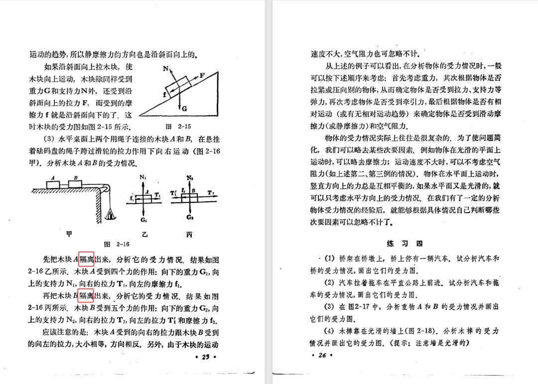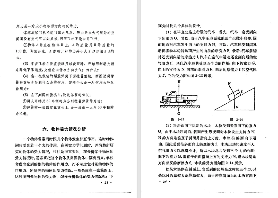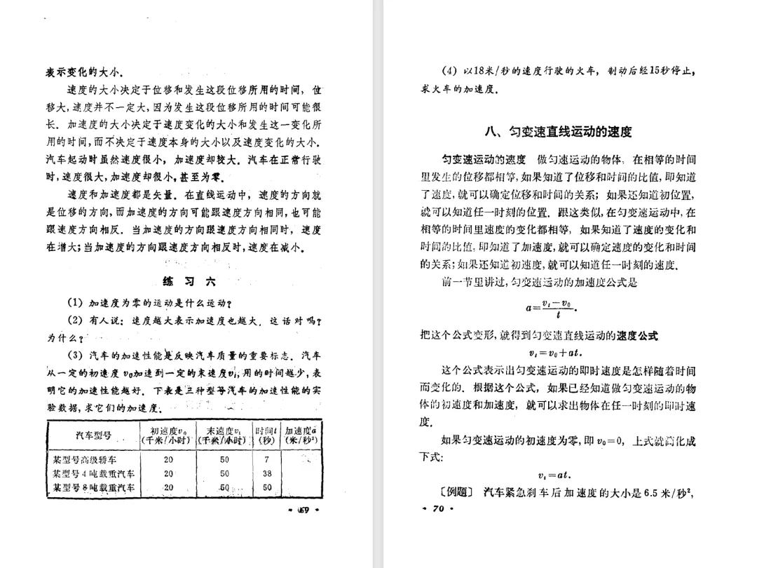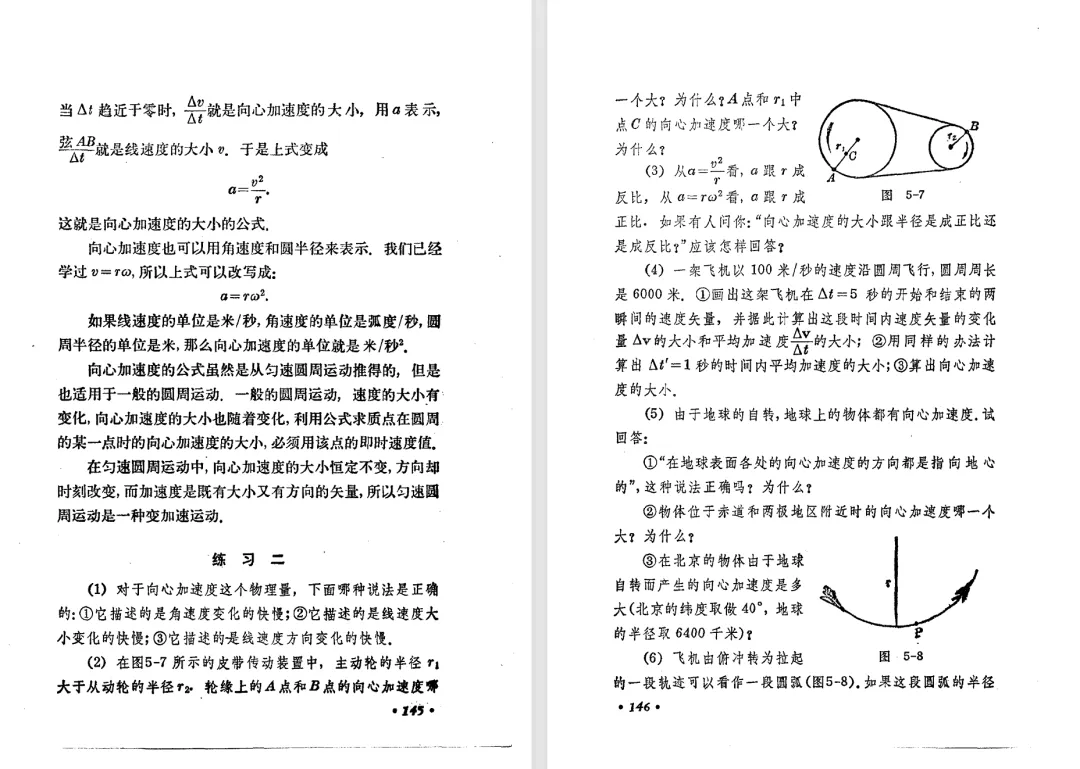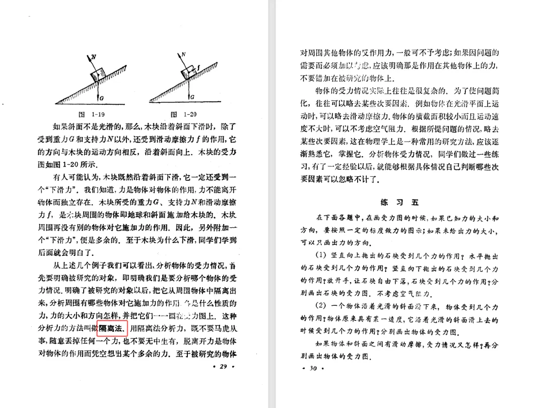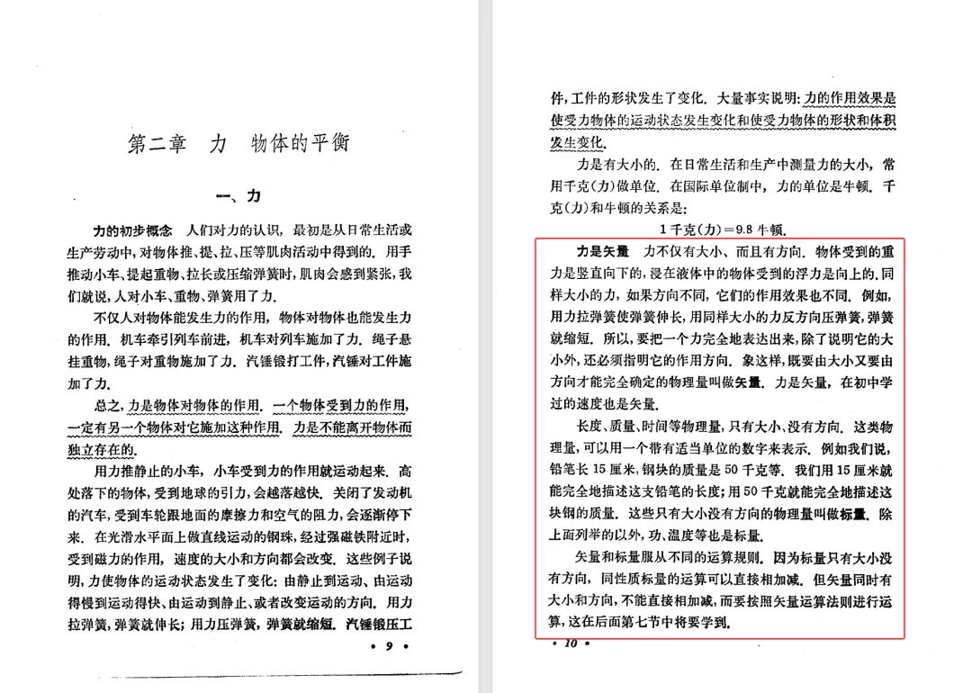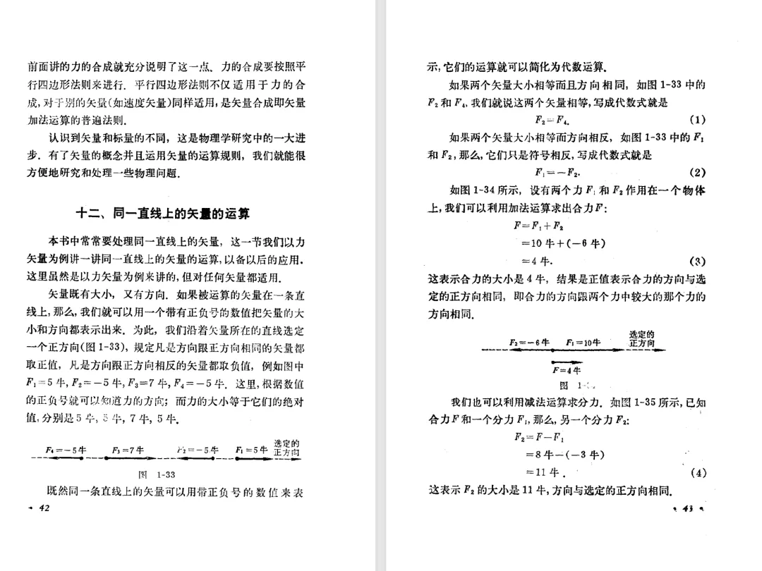 本文对高级中学课本 物理 甲种本 第一册进行详细介绍。本文将物理甲种本与上一版全日制十年制学校高中物理课本(简称旧教材)对比,展示两版教材的差异,从而了解教学要求和教材编写方式和风格的改变。通过本文的介绍,读者也可以认识到为什么人民教育出版社出版的《新中国中小学教材建设史 1949-2000 研究丛书 物理卷》(简称《物理教材建设史》)将全日制十年制学校高中物理称为20世纪最难的高中物理教材。下面再次展示旧教材和甲种本在力的部分的内容编排。左边一列是旧教材的,右边一列是甲种本的。值得注意的是,甲种本在第一章末尾才出现矢量和标量,最后一节仅介绍同一直线上的矢量的运算。旧教材在第一节 力,就说明力是矢量,并且介绍了矢量和标量的区别。下面是旧教材的相关页面。本节给出了力的平行四边形法则和三角形法则,但是没有给出力的合成的矢量表达式。显然,甲种本对矢量和矢量计算的要求相比旧教材降低了。旧教材不仅强调力的运算的矢量表达式,还强调力的运算的平行四边形法则和三角形法则;甲种本主要强调力的运算满足平行四边形法则和三角形法则。换句话说,甲种本弱化了力的运算的数学背景,降低了教学要求。先看甲种本增加的两个阅读材料。第一个阅读材料严格说是实验。第七节,教材给出了隔离法这一名词。旧教材在牛顿运动定律那一章才给出。下面是旧教材物体受力分析小节。旧教材给了三个例子,比甲种本还多。尽管教材没有提隔离法这个词,所使用的受力分析法同样是隔离法。下面看甲种本第六节 变速直线运动 平均速度 即时速度。甲种本同样采用极限法介绍即时速度。但是,甲种本删除了旧教材中利用位移-时间图象求即时速度的内容。下面展示旧教材对应的小节。下图第64页划线的文字开始,介绍利用位移-时间图象求即时速度。用位移-时间图象求即时速度,本质上是用函数图象求切线的斜率,这在全日十年制学制时期是高中二年级第二学期的内容,在高中一年级刚开学没多久在物理课提前接触这些数学知识,要求太高了。可能物理教材的编写者意识到了这个问题,所以在甲种本中删去了这部分内容。甲种本淡化了即时速度的数学背景,降低了即时速度的教学要求。如下图所示,由于教材将讨论的运动限制在了匀变速直线运动,所以只需要给出标量形式的加速度表达式。教材还增加了一个阅读材料,讲述速度和加速度的区别。如下图所示,旧教材没有将运动的讨论范围限定在匀变速,而是笼统地说变速,而且教材给出了矢量形式的加速度表达式。在运动定律这章,旧教材和甲种本差别最大的是牛顿第二定律。旧教材只有两节,甲种本有四节。甲种本分别用三个小节介绍引出牛顿第二定律的内容:物体运动状态的改变,加速度和力的关系,加速度和质量的关系,最后得出牛顿第二定律。而旧教材是在一节里完成对引出牛顿运动定律的实验,以及牛顿第二定律的介绍,在此基础上,再用一节对牛顿第二定律进行扩展补充。下面先看甲种本如何介绍牛顿第二定律。甲种本用第二、三、四三个小节做铺垫,到了第五节才真正介绍牛顿第二定律。下图第113页,教材给出了牛顿第二定律的标量表达式。后面介绍力的独立作用原理,讲物体在收到多个力的作用下的加速度如何计算。下图第114页,教材进一步给出物体在多个力的作用下的牛顿第二定律的表达式,这里用的也是标量表达式。再看旧教材 第二节 牛顿运动定律。本接开头教材仅仅用很短的一句话介绍力如何改变物体的运动状态,接下来教材仅仅通过定性地描述不同的实验结果,得出加速度和力的关系,以及加速度和质量的关系。如下图第114页所示,教材先给出标量形式的牛顿第二定律公式,再给出矢量形式的牛顿第二定律公式。有关牛顿第二定律的讨论,单独成节。如下图第116页所示,教材给出矢量形式的物体受多个外力情况下的牛顿第二定律。第117页的物体做曲线运动的条件,甲种本放在了曲线运动一章介绍。比较旧教材和甲种本牛顿第二定律的内容,我们可以发现,甲种本花了更多的篇幅介绍牛顿第二定律的背景,如何通过实验推导出牛顿第二定律,让学生经历牛顿第二定律发现的过程。旧教材对牛顿第二定律的介绍篇幅较少,更像是给学生灌输知识,但是旧教材给出了牛顿第二定律的矢量表达式,对学生的要求更高。下面展示甲种本增加了超重和失重的内容。旧教材是在讲人造地球卫星部分才介绍超重和失重的,而且篇幅很短。通过对比旧教材和甲种本,我们可以发现,甲种本对知识的讲解更详细,并且主要采用标量语言描述运动定律,几乎没有采用矢量语言。所以,甲种本的数学背景和教学要求是更低的。下面看甲种本的 第二节 运动的合成和分解,这节内容不多,而且没有分开介绍位移的合成和速度的合成,比较笼统。下面看旧教材对应的小节。旧教材的讲解非常详细,先讲平面上的位移,再讲位移的合成与分解,最后讲速度的合成与分解。本节全程使用矢量表达式。加下来看甲种本 第六节 向心加速度,本节给出了匀速圆周运动向心加速度的方向和大小的推导。需要注意的是,A点和B点速度的差值\Delta v的计算是矢量运算。旧教材对于向心加速度的推导更详细。旧教材对于匀速圆周运动向心加速度方向的推导更详细,有角度的计算,详细地说明