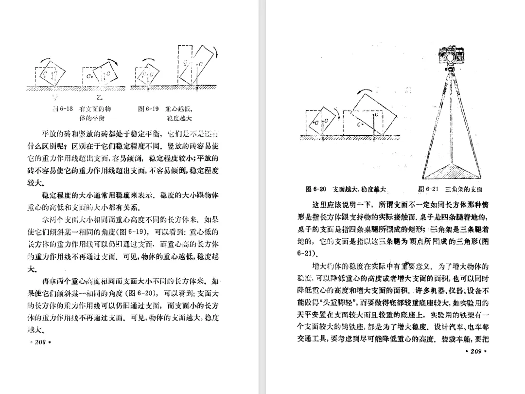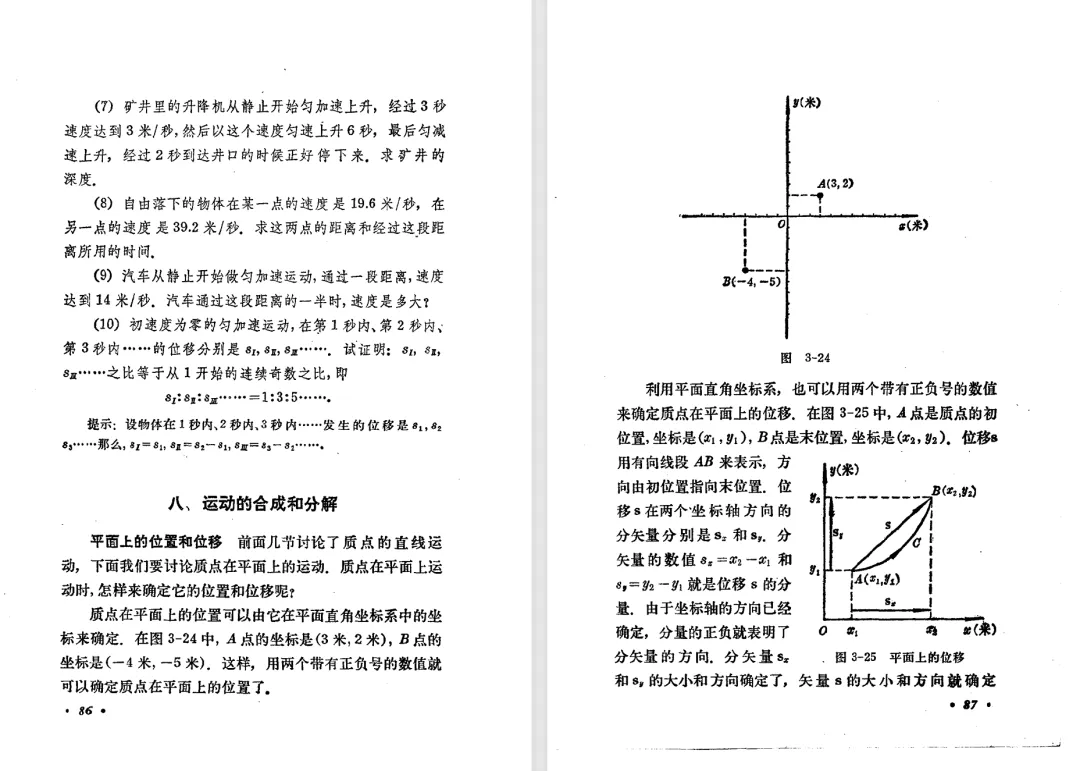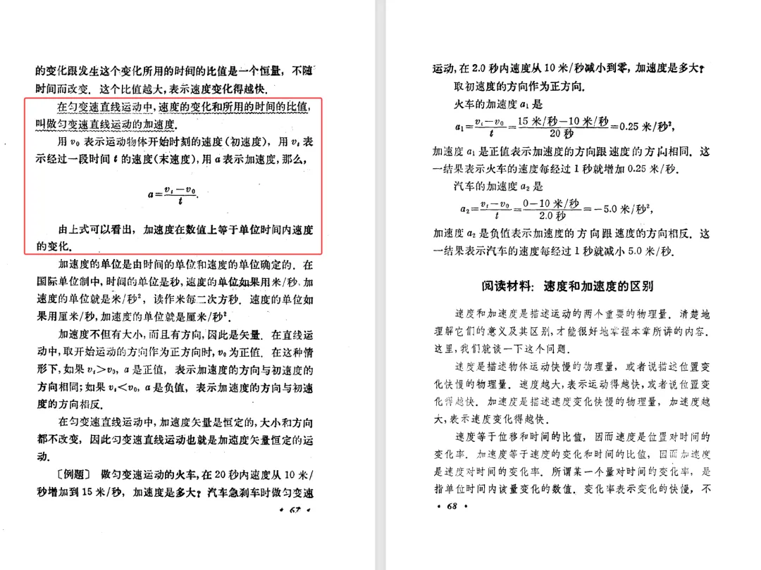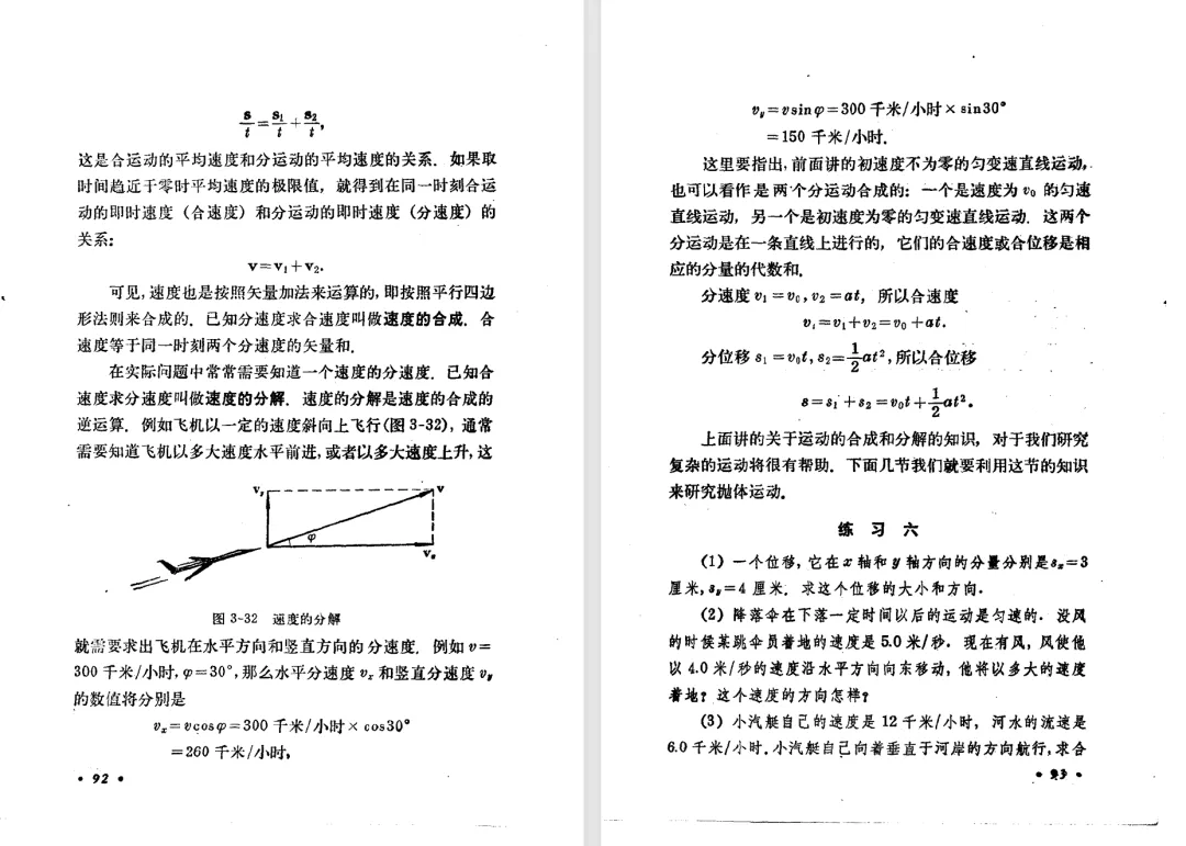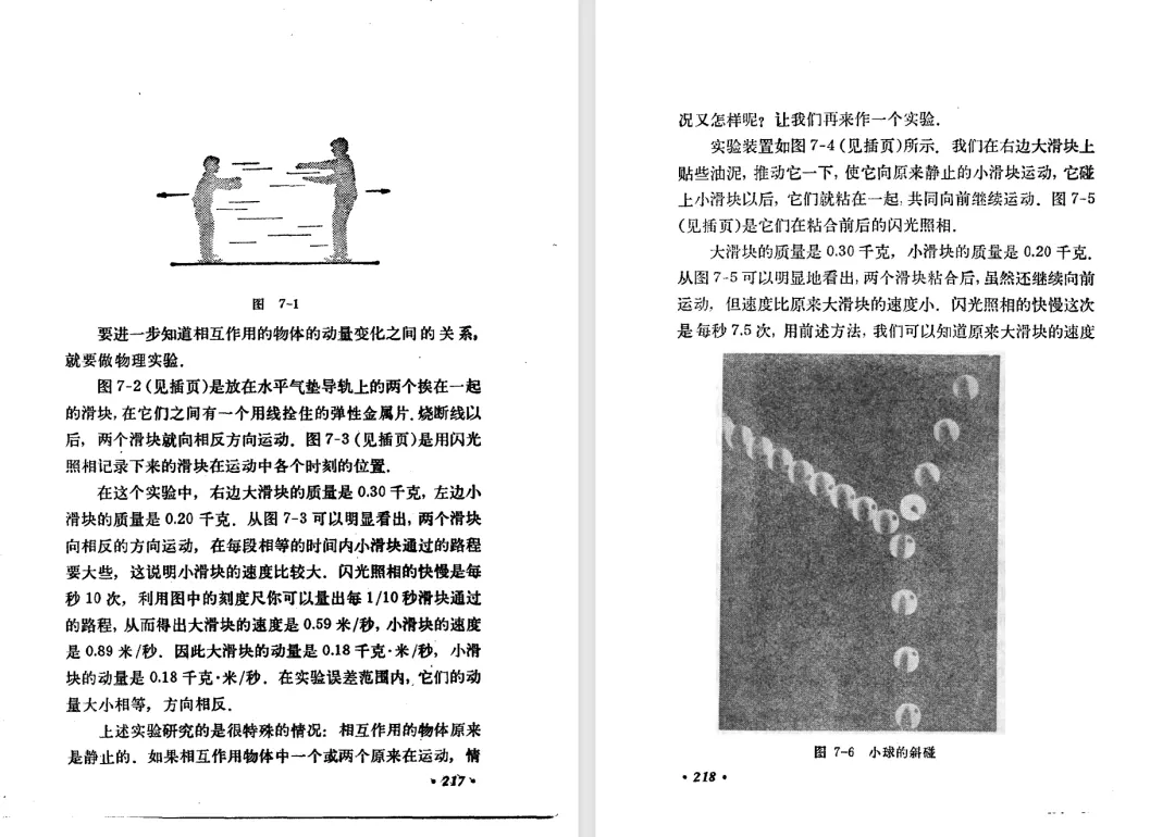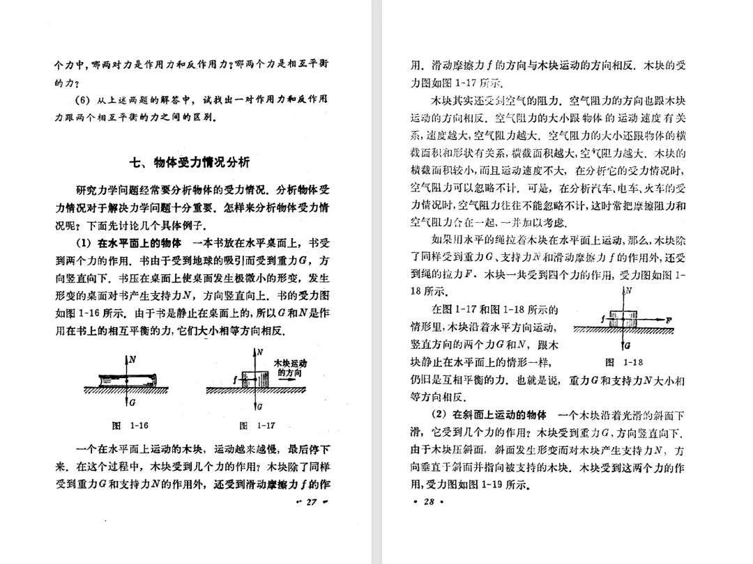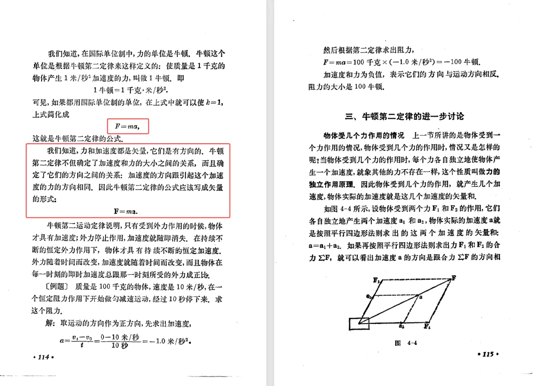 本文对高级中学课本 物理 甲种本 第一册进行详细介绍。本文将物理甲种本与上一版全日制十年制学校高中物理课本(简称旧教材)对比,展示两版教材的差异,从而了解教学要求和教材编写方式和风格的改变。通过本文的介绍,读者也可以认识到为什么人民教育出版社出版的《新中国中小学教材建设史 1949-2000 研究丛书 物理卷》(简称《物理教材建设史》)将全日制十年制学校高中物理称为20世纪最难的高中物理教材。下面再次展示旧教材和甲种本在力的部分的内容编排。左边一列是旧教材的,右边一列是甲种本的。值得注意的是,甲种本在第一章末尾才出现矢量和标量,最后一节仅介绍同一直线上的矢量的运算。旧教材在第一节 力,就说明力是矢量,并且介绍了矢量和标量的区别。下面是旧教材的相关页面。本节给出了力的平行四边形法则和三角形法则,但是没有给出力的合成的矢量表达式。显然,甲种本对矢量和矢量计算的要求相比旧教材降低了。旧教材不仅强调力的运算的矢量表达式,还强调力的运算的平行四边形法则和三角形法则;甲种本主要强调力的运算满足平行四边形法则和三角形法则。换句话说,甲种本弱化了力的运算的数学背景,降低了教学要求。先看甲种本增加的两个阅读材料。第一个阅读材料严格说是实验。第七节,教材给出了隔离法这一名词。旧教材在牛顿运动定律那一章才给出。下面是旧教材物体受力分析小节。旧教材给了三个例子,比甲种本还多。尽管教材没有提隔离法这个词,所使用的受力分析法同样是隔离法。下面看甲种本第六节 变速直线运动 平均速度 即时速度。甲种本同样采用极限法介绍即时速度。但是,甲种本删除了旧教材中利用位移-时间图象求即时速度的内容。下面展示旧教材对应的小节。下图第64页划线的文字开始,介绍利用位移-时间图象求即时速度。用位移-时间图象求即时速度,本质上是用函数图象求切线的斜率,这在全日十年制学制时期是高中二年级第二学期的内容,在高中一年级刚开学没多久在物理课提前接触这些数学知识,要求太高了。可能物理教材的编写者意识到了这个问题,所以在甲种本中删去了这部分内容。甲种本淡化了即时速度的数学背景,降低了即时速度的教学要求。如下图所示,由于教材将讨论的运动限制在了匀变速直线运动,所以只需要给出标量形式的加速度表达式。教材还增加了一个阅读材料,讲述速度和加速度的区别。如下图所示,旧教材没有将运动的讨论范围限定在匀变速,而是笼统地说变速,而且教材给出了矢量形式的加速度表达式。在运动定律这章,旧教材和甲种本差别最大的是牛顿第二定律。旧教材只有两节,甲种本有四节。甲种本分别用三个小节介绍引出牛顿第二定律的内容:物体运动状态的改变,加速度和力的关系,加速度和质量的关系,最后得出牛顿第二定律。而旧教材是在一节里完成对引出牛顿运动定律的实验,以及牛顿第二定律的介绍,在此基础上,再用一节对牛顿第二定律进行扩展补充。下面先看甲种本如何介绍牛顿第二定律。甲种本用第二、三、四三个小节做铺垫,到了第五节才真正介绍牛顿第二定律。下图第113页,教材给出了牛顿第二定律的标量表达式。后面介绍力的独立作用原理,讲物体在收到多个力的作用下的加速度如何计算。下图第114页,教材进一步给出物体在多个力的作用下的牛顿第二定律的表达式,这里用的也是标量表达式。再看旧教材 第二节 牛顿运动定律。本接开头教材仅仅用很短的一句话介绍力如何改变物体的运动状态,接下来教材仅仅通过定性地描述不同的实验结果,得出加速度和力的关系,以及加速度和质量的关系。如下图第114页所示,教材先给出标量形式的牛顿第二定律公式,再给出矢量形式的牛顿第二定律公式。有关牛顿第二定律的讨论,单独成节。如下图第116页所示,教材给出矢量形式的物体受多个外力情况下的牛顿第二定律。第117页的物体做曲线运动的条件,甲种本放在了曲线运动一章介绍。比较旧教材和甲种本牛顿第二定律的内容,我们可以发现,甲种本花了更多的篇幅介绍牛顿第二定律的背景,如何通过实验推导出牛顿第二定律,让学生经历牛顿第二定律发现的过程。旧教材对牛顿第二定律的介绍篇幅较少,更像是给学生灌输知识,但是旧教材给出了牛顿第二定律的矢量表达式,对学生的要求更高。下面展示甲种本增加了超重和失重的内容。旧教材是在讲人造地球卫星部分才介绍超重和失重的,而且篇幅很短。通过对比旧教材和甲种本,我们可以发现,甲种本对知识的讲解更详细,并且主要采用标量语言描述运动定律,几乎没有采用矢量语言。所以,甲种本的数学背景和教学要求是更低的。下面看甲种本的 第二节 运动的合成和分解,这节内容不多,而且没有分开介绍位移的合成和速度的合成,比较笼统。下面看旧教材对应的小节。旧教材的讲解非常详细,先讲平面上的位移,再讲位移的合成与分解,最后讲速度的合成与分解。本节全程使用矢量表达式。加下来看甲种本 第六节 向心加速度,本节给出了匀速圆周运动向心加速度的方向和大小的推导。需要注意的是,A点和B点速度的差值\Delta v的计算是矢量运算。旧教材对于向心加速度的推导更详细。旧教材对于匀速圆周运动向心加速度方向的推导更详细,有角度的计算,详细地说明