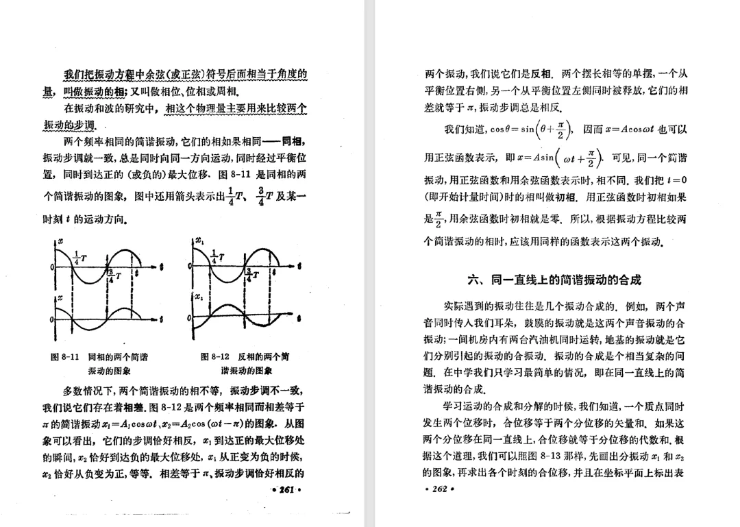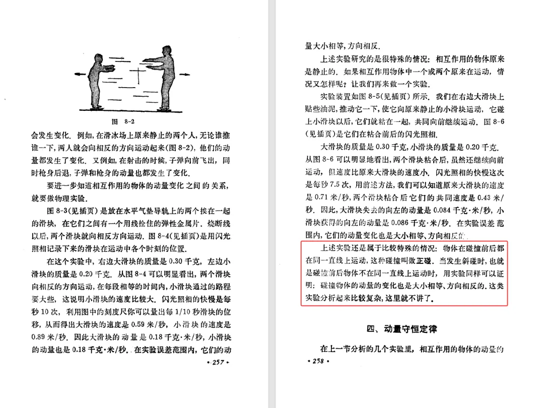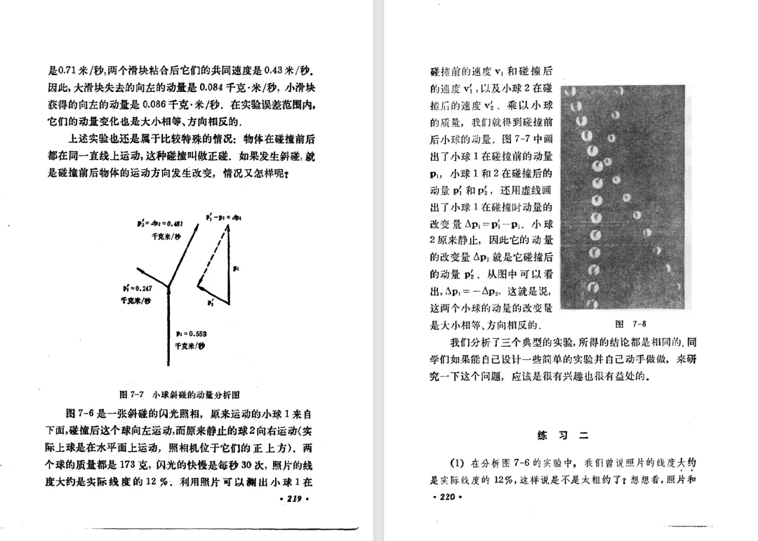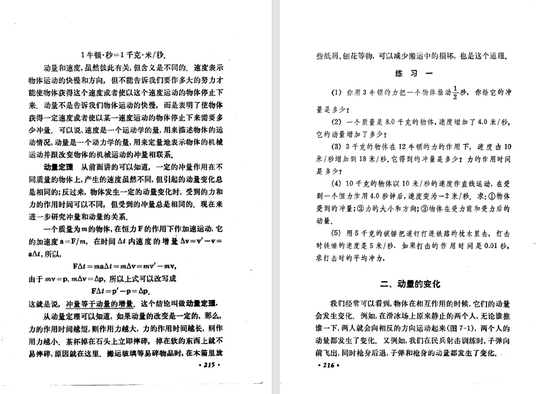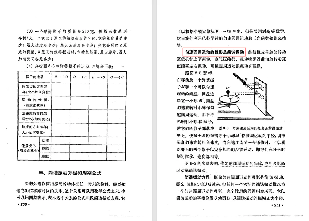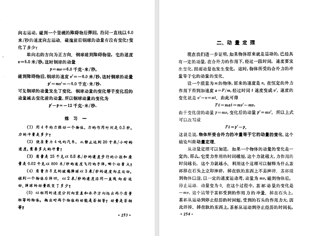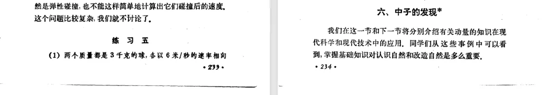 本文对高级中学课本 物理 甲种本 第一册进行详细介绍。本文将物理甲种本与上一版全日制十年制学校高中物理课本(简称旧教材)对比,展示两版教材的差异,从而了解教学要求和教材编写方式和风格的改变。通过本文的介绍,读者也可以认识到为什么人民教育出版社出版的《新中国中小学教材建设史 1949-2000 研究丛书 物理卷》(简称《物理教材建设史》)将全日制十年制学校高中物理称为20世纪最难的高中物理教材。下面再次展示旧教材和甲种本在力的部分的内容编排。左边一列是旧教材的,右边一列是甲种本的。值得注意的是,甲种本在第一章末尾才出现矢量和标量,最后一节仅介绍同一直线上的矢量的运算。旧教材在第一节 力,就说明力是矢量,并且介绍了矢量和标量的区别。下面是旧教材的相关页面。本节给出了力的平行四边形法则和三角形法则,但是没有给出力的合成的矢量表达式。显然,甲种本对矢量和矢量计算的要求相比旧教材降低了。旧教材不仅强调力的运算的矢量表达式,还强调力的运算的平行四边形法则和三角形法则;甲种本主要强调力的运算满足平行四边形法则和三角形法则。换句话说,甲种本弱化了力的运算的数学背景,降低了教学要求。先看甲种本增加的两个阅读材料。第一个阅读材料严格说是实验。第七节,教材给出了隔离法这一名词。旧教材在牛顿运动定律那一章才给出。下面是旧教材物体受力分析小节。旧教材给了三个例子,比甲种本还多。尽管教材没有提隔离法这个词,所使用的受力分析法同样是隔离法。下面看甲种本第六节 变速直线运动 平均速度 即时速度。甲种本同样采用极限法介绍即时速度。但是,甲种本删除了旧教材中利用位移-时间图象求即时速度的内容。下面展示旧教材对应的小节。下图第64页划线的文字开始,介绍利用位移-时间图象求即时速度。用位移-时间图象求即时速度,本质上是用函数图象求切线的斜率,这在全日十年制学制时期是高中二年级第二学期的内容,在高中一年级刚开学没多久在物理课提前接触这些数学知识,要求太高了。可能物理教材的编写者意识到了这个问题,所以在甲种本中删去了这部分内容。甲种本淡化了即时速度的数学背景,降低了即时速度的教学要求。如下图所示,由于教材将讨论的运动限制在了匀变速直线运动,所以只需要给出标量形式的加速度表达式。教材还增加了一个阅读材料,讲述速度和加速度的区别。如下图所示,旧教材没有将运动的讨论范围限定在匀变速,而是笼统地说变速,而且教材给出了矢量形式的加速度表达式。在运动定律这章,旧教材和甲种本差别最大的是牛顿第二定律。旧教材只有两节,甲种本有四节。甲种本分别用三个小节介绍引出牛顿第二定律的内容:物体运动状态的改变,加速度和力的关系,加速度和质量的关系,最后得出牛顿第二定律。而旧教材是在一节里完成对引出牛顿运动定律的实验,以及牛顿第二定律的介绍,在此基础上,再用一节对牛顿第二定律进行扩展补充。下面先看甲种本如何介绍牛顿第二定律。甲种本用第二、三、四三个小节做铺垫,到了第五节才真正介绍牛顿第二定律。下图第113页,教材给出了牛顿第二定律的标量表达式。后面介绍力的独立作用原理,讲物体在收到多个力的作用下的加速度如何计算。下图第114页,教材进一步给出物体在多个力的作用下的牛顿第二定律的表达式,这里用的也是标量表达式。再看旧教材 第二节 牛顿运动定律。本接开头教材仅仅用很短的一句话介绍力如何改变物体的运动状态,接下来教材仅仅通过定性地描述不同的实验结果,得出加速度和力的关系,以及加速度和质量的关系。如下图第114页所示,教材先给出标量形式的牛顿第二定律公式,再给出矢量形式的牛顿第二定律公式。有关牛顿第二定律的讨论,单独成节。如下图第116页所示,教材给出矢量形式的物体受多个外力情况下的牛顿第二定律。第117页的物体做曲线运动的条件,甲种本放在了曲线运动一章介绍。比较旧教材和甲种本牛顿第二定律的内容,我们可以发现,甲种本花了更多的篇幅介绍牛顿第二定律的背景,如何通过实验推导出牛顿第二定律,让学生经历牛顿第二定律发现的过程。旧教材对牛顿第二定律的介绍篇幅较少,更像是给学生灌输知识,但是旧教材给出了牛顿第二定律的矢量表达式,对学生的要求更高。下面展示甲种本增加了超重和失重的内容。旧教材是在讲人造地球卫星部分才介绍超重和失重的,而且篇幅很短。通过对比旧教材和甲种本,我们可以发现,甲种本对知识的讲解更详细,并且主要采用标量语言描述运动定律,几乎没有采用矢量语言。所以,甲种本的数学背景和教学要求是更低的。下面看甲种本的 第二节 运动的合成和分解,这节内容不多,而且没有分开介绍位移的合成和速度的合成,比较笼统。下面看旧教材对应的小节。旧教材的讲解非常详细,先讲平面上的位移,再讲位移的合成与分解,最后讲速度的合成与分解。本节全程使用矢量表达式。加下来看甲种本 第六节 向心加速度,本节给出了匀速圆周运动向心加速度的方向和大小的推导。需要注意的是,A点和B点速度的差值\Delta v的计算是矢量运算。旧教材对于向心加速度的推导更详细。旧教材对于匀速圆周运动向心加速度方向的推导更详细,有角度的计算,详细地说明