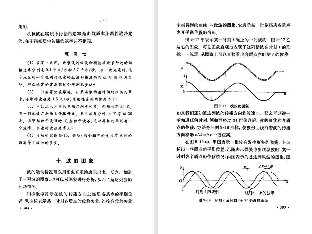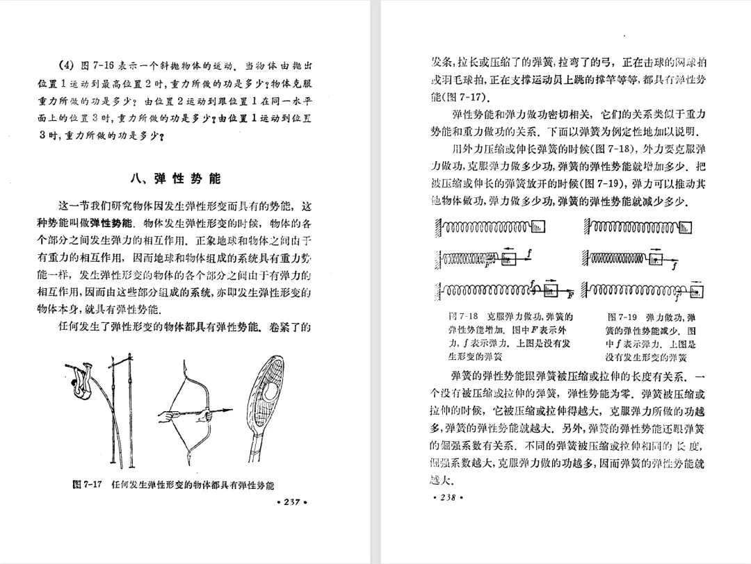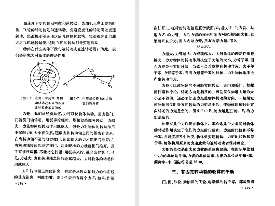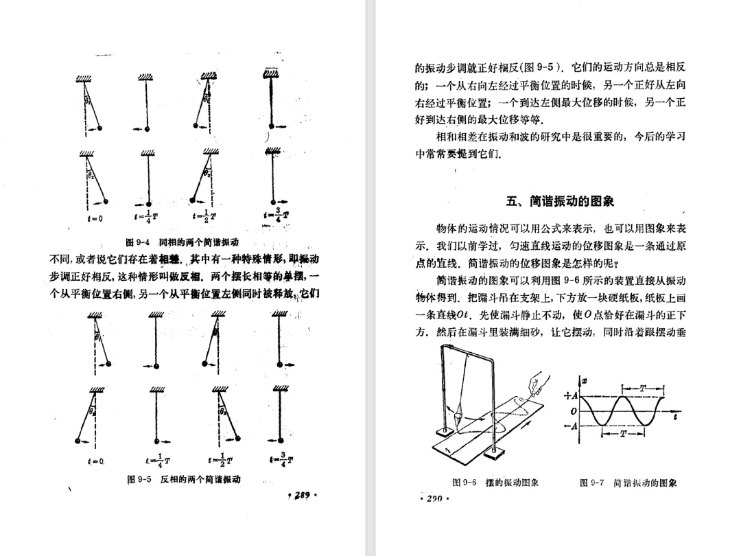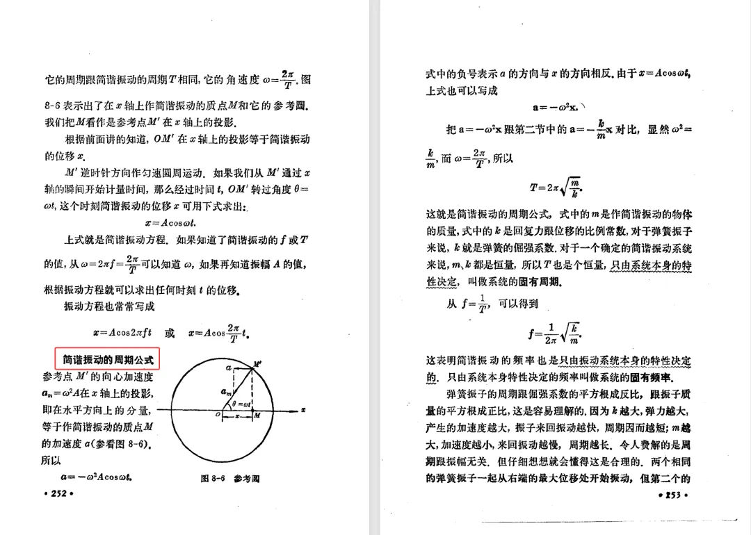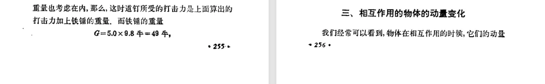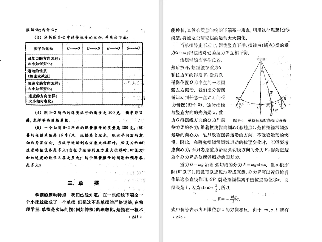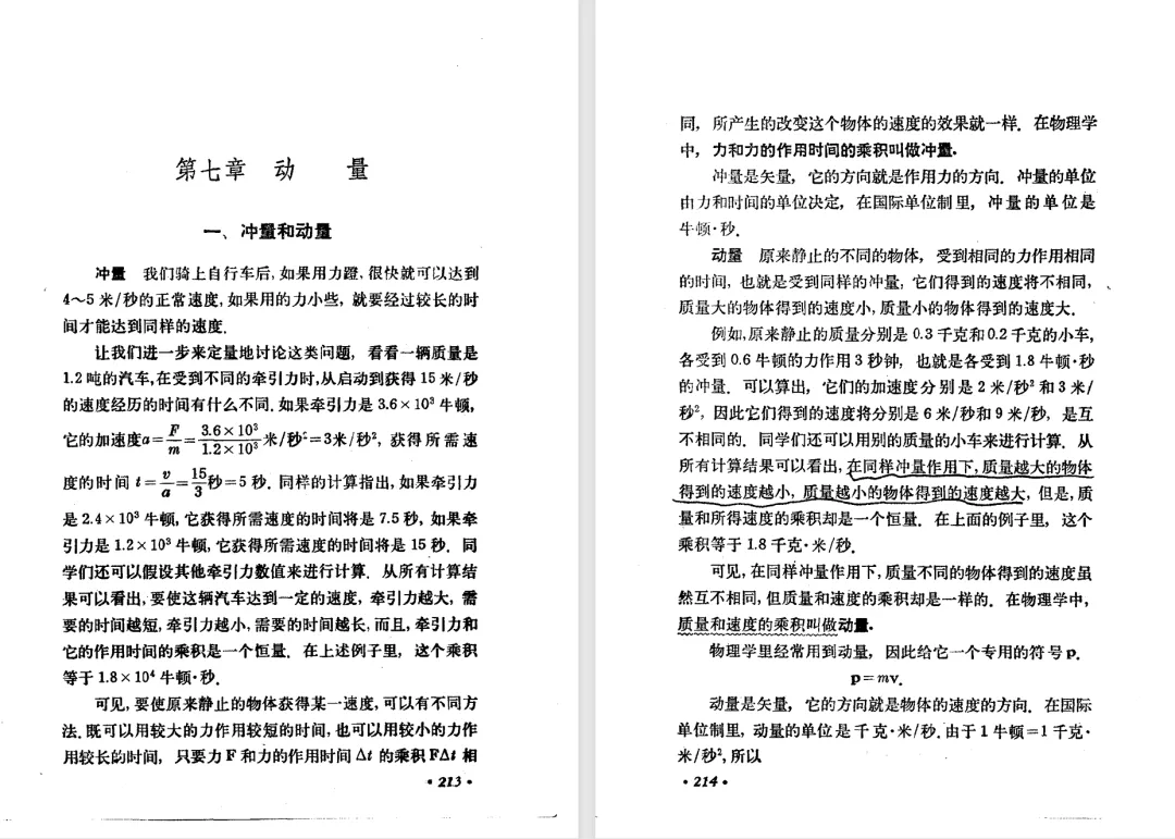 本文对高级中学课本 物理 甲种本 第一册进行详细介绍。本文将物理甲种本与上一版全日制十年制学校高中物理课本(简称旧教材)对比,展示两版教材的差异,从而了解教学要求和教材编写方式和风格的改变。通过本文的介绍,读者也可以认识到为什么人民教育出版社出版的《新中国中小学教材建设史 1949-2000 研究丛书 物理卷》(简称《物理教材建设史》)将全日制十年制学校高中物理称为20世纪最难的高中物理教材。下面再次展示旧教材和甲种本在力的部分的内容编排。左边一列是旧教材的,右边一列是甲种本的。值得注意的是,甲种本在第一章末尾才出现矢量和标量,最后一节仅介绍同一直线上的矢量的运算。旧教材在第一节 力,就说明力是矢量,并且介绍了矢量和标量的区别。下面是旧教材的相关页面。本节给出了力的平行四边形法则和三角形法则,但是没有给出力的合成的矢量表达式。显然,甲种本对矢量和矢量计算的要求相比旧教材降低了。旧教材不仅强调力的运算的矢量表达式,还强调力的运算的平行四边形法则和三角形法则;甲种本主要强调力的运算满足平行四边形法则和三角形法则。换句话说,甲种本弱化了力的运算的数学背景,降低了教学要求。先看甲种本增加的两个阅读材料。第一个阅读材料严格说是实验。第七节,教材给出了隔离法这一名词。旧教材在牛顿运动定律那一章才给出。下面是旧教材物体受力分析小节。旧教材给了三个例子,比甲种本还多。尽管教材没有提隔离法这个词,所使用的受力分析法同样是隔离法。下面看甲种本第六节 变速直线运动 平均速度 即时速度。甲种本同样采用极限法介绍即时速度。但是,甲种本删除了旧教材中利用位移-时间图象求即时速度的内容。下面展示旧教材对应的小节。下图第64页划线的文字开始,介绍利用位移-时间图象求即时速度。用位移-时间图象求即时速度,本质上是用函数图象求切线的斜率,这在全日十年制学制时期是高中二年级第二学期的内容,在高中一年级刚开学没多久在物理课提前接触这些数学知识,要求太高了。可能物理教材的编写者意识到了这个问题,所以在甲种本中删去了这部分内容。甲种本淡化了即时速度的数学背景,降低了即时速度的教学要求。如下图所示,由于教材将讨论的运动限制在了匀变速直线运动,所以只需要给出标量形式的加速度表达式。教材还增加了一个阅读材料,讲述速度和加速度的区别。如下图所示,旧教材没有将运动的讨论范围限定在匀变速,而是笼统地说变速,而且教材给出了矢量形式的加速度表达式。在运动定律这章,旧教材和甲种本差别最大的是牛顿第二定律。旧教材只有两节,甲种本有四节。甲种本分别用三个小节介绍引出牛顿第二定律的内容:物体运动状态的改变,加速度和力的关系,加速度和质量的关系,最后得出牛顿第二定律。而旧教材是在一节里完成对引出牛顿运动定律的实验,以及牛顿第二定律的介绍,在此基础上,再用一节对牛顿第二定律进行扩展补充。下面先看甲种本如何介绍牛顿第二定律。甲种本用第二、三、四三个小节做铺垫,到了第五节才真正介绍牛顿第二定律。下图第113页,教材给出了牛顿第二定律的标量表达式。后面介绍力的独立作用原理,讲物体在收到多个力的作用下的加速度如何计算。下图第114页,教材进一步给出物体在多个力的作用下的牛顿第二定律的表达式,这里用的也是标量表达式。再看旧教材 第二节 牛顿运动定律。本接开头教材仅仅用很短的一句话介绍力如何改变物体的运动状态,接下来教材仅仅通过定性地描述不同的实验结果,得出加速度和力的关系,以及加速度和质量的关系。如下图第114页所示,教材先给出标量形式的牛顿第二定律公式,再给出矢量形式的牛顿第二定律公式。有关牛顿第二定律的讨论,单独成节。如下图第116页所示,教材给出矢量形式的物体受多个外力情况下的牛顿第二定律。第117页的物体做曲线运动的条件,甲种本放在了曲线运动一章介绍。比较旧教材和甲种本牛顿第二定律的内容,我们可以发现,甲种本花了更多的篇幅介绍牛顿第二定律的背景,如何通过实验推导出牛顿第二定律,让学生经历牛顿第二定律发现的过程。旧教材对牛顿第二定律的介绍篇幅较少,更像是给学生灌输知识,但是旧教材给出了牛顿第二定律的矢量表达式,对学生的要求更高。下面展示甲种本增加了超重和失重的内容。旧教材是在讲人造地球卫星部分才介绍超重和失重的,而且篇幅很短。通过对比旧教材和甲种本,我们可以发现,甲种本对知识的讲解更详细,并且主要采用标量语言描述运动定律,几乎没有采用矢量语言。所以,甲种本的数学背景和教学要求是更低的。下面看甲种本的 第二节 运动的合成和分解,这节内容不多,而且没有分开介绍位移的合成和速度的合成,比较笼统。下面看旧教材对应的小节。旧教材的讲解非常详细,先讲平面上的位移,再讲位移的合成与分解,最后讲速度的合成与分解。本节全程使用矢量表达式。加下来看甲种本 第六节 向心加速度,本节给出了匀速圆周运动向心加速度的方向和大小的推导。需要注意的是,A点和B点速度的差值\Delta v的计算是矢量运算。旧教材对于向心加速度的推导更详细。旧教材对于匀速圆周运动向心加速度方向的推导更详细,有角度的计算,详细地说明
