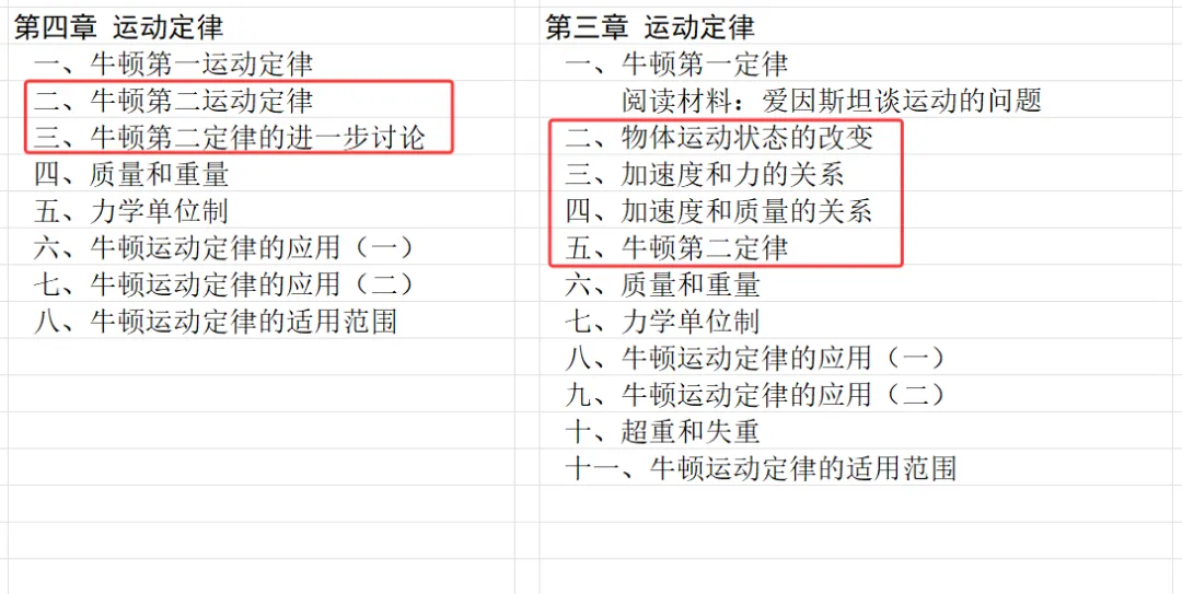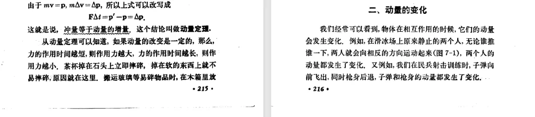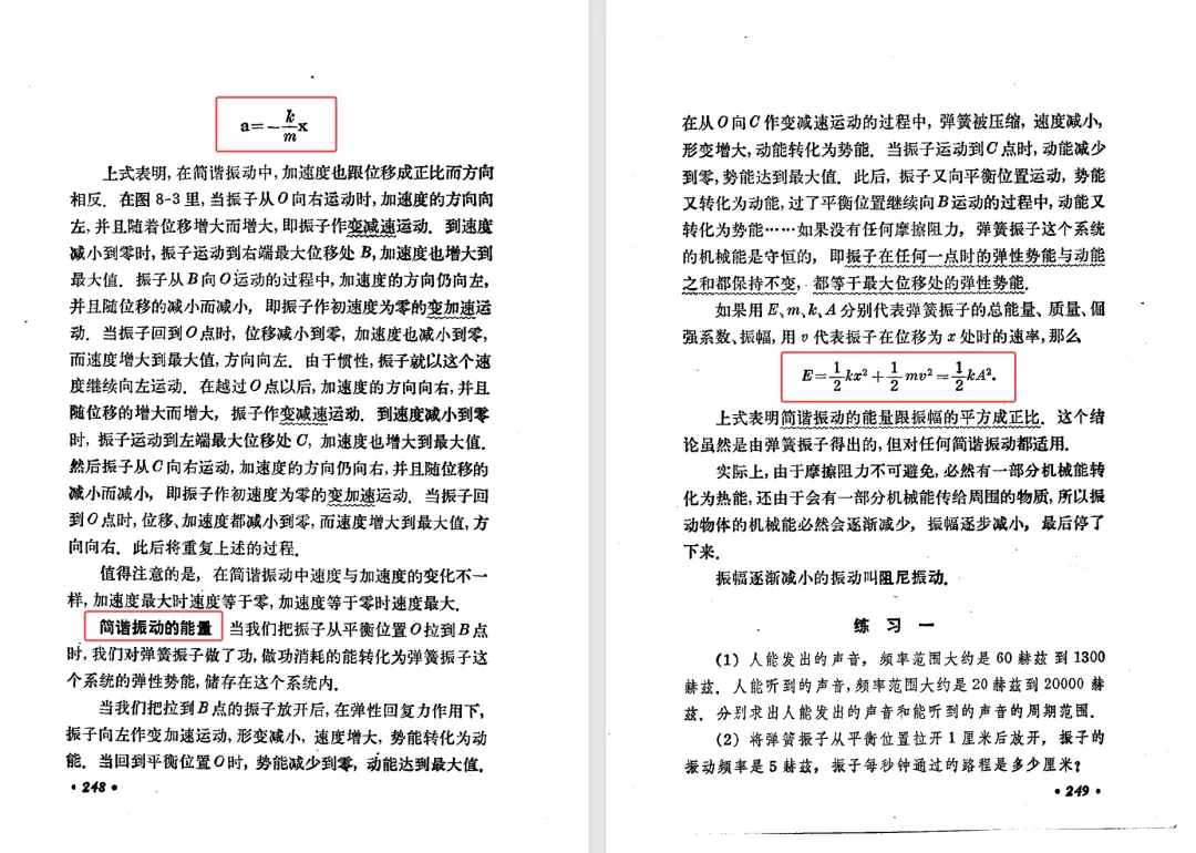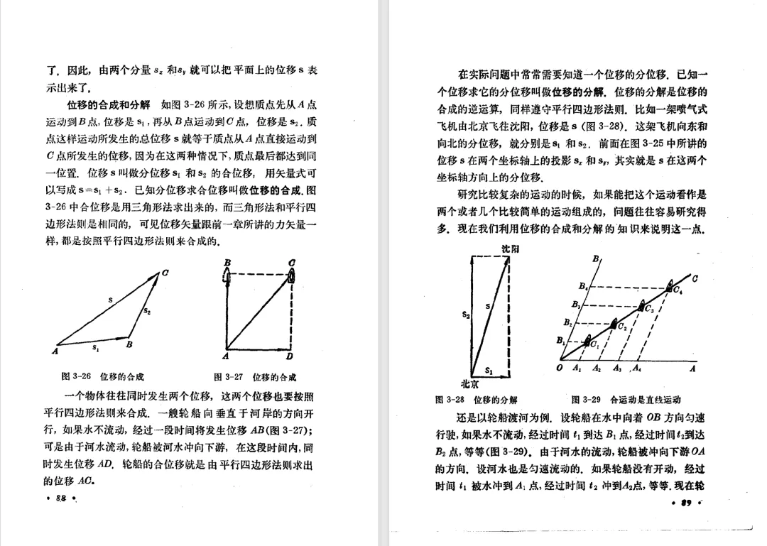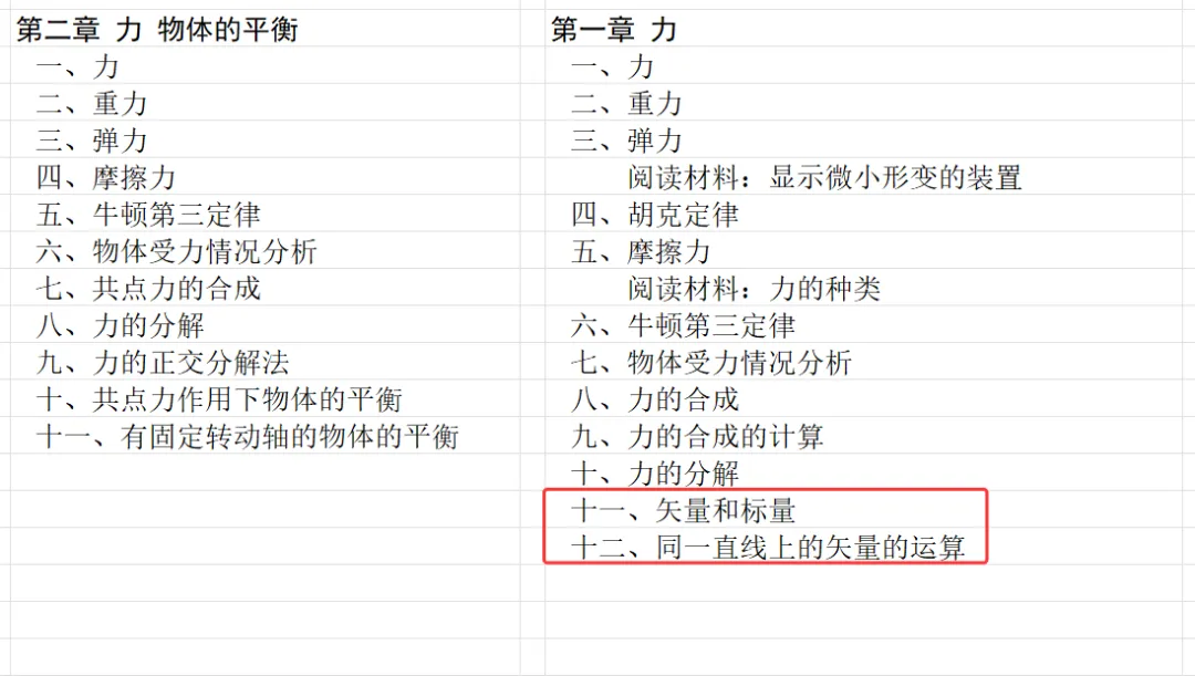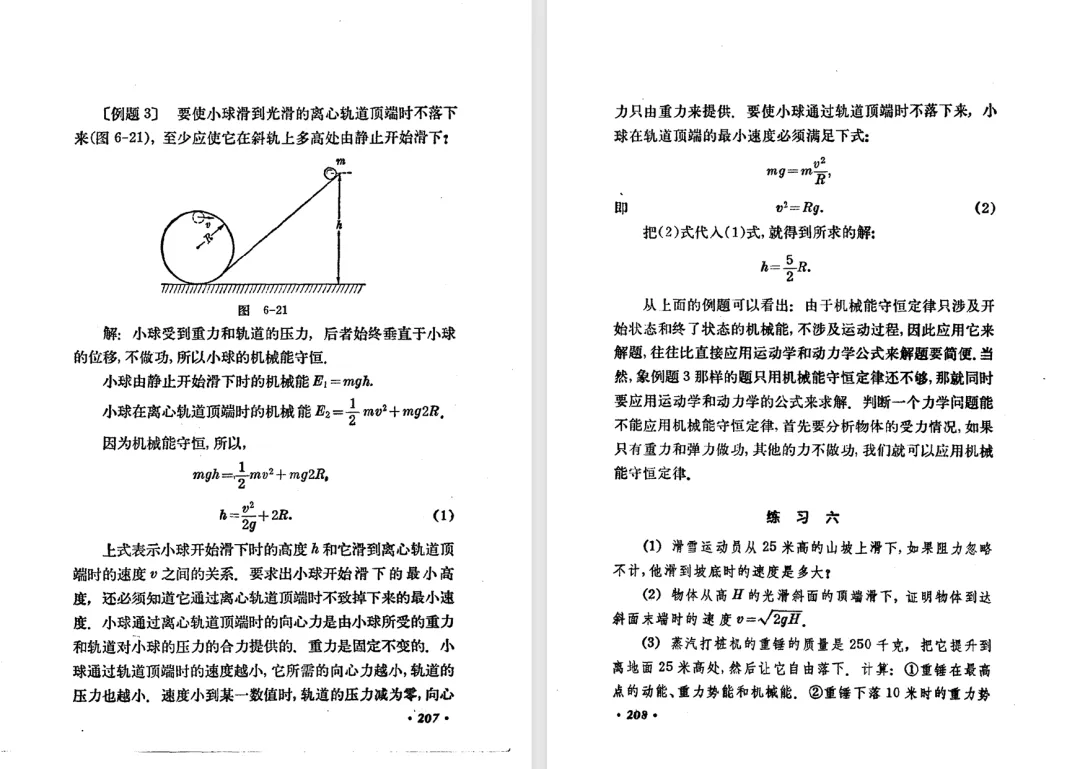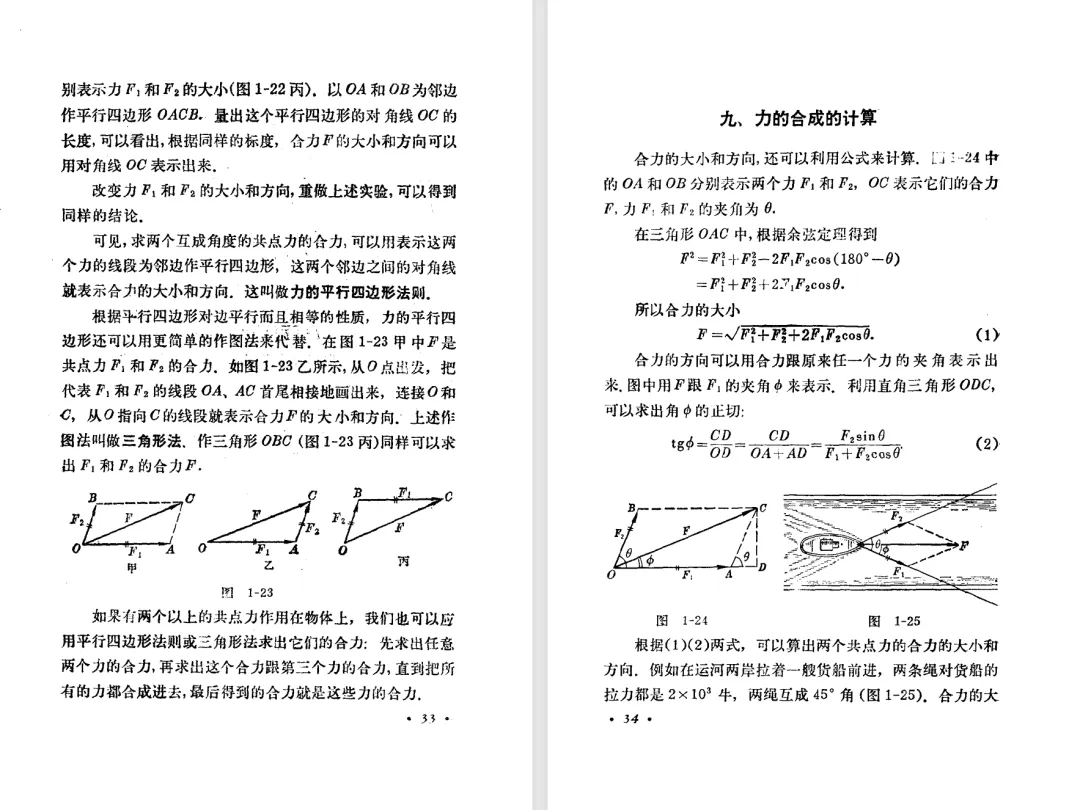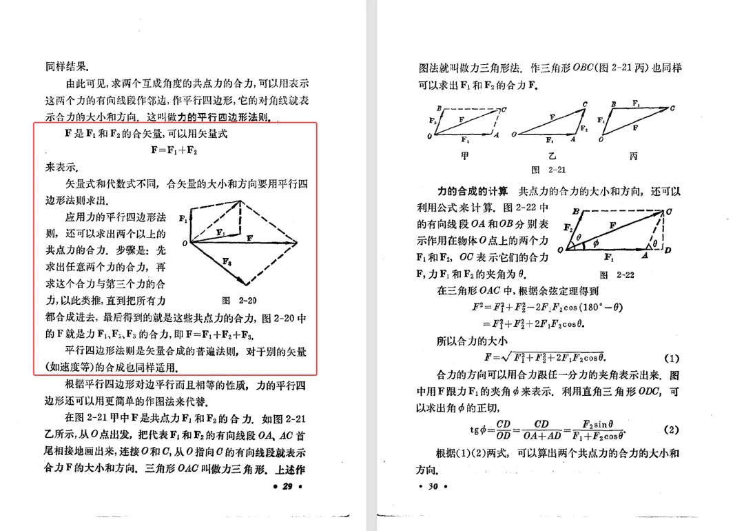 本文对高级中学课本 物理 甲种本 第一册进行详细介绍。本文将物理甲种本与上一版全日制十年制学校高中物理课本(简称旧教材)对比,展示两版教材的差异,从而了解教学要求和教材编写方式和风格的改变。通过本文的介绍,读者也可以认识到为什么人民教育出版社出版的《新中国中小学教材建设史 1949-2000 研究丛书 物理卷》(简称《物理教材建设史》)将全日制十年制学校高中物理称为20世纪最难的高中物理教材。下面再次展示旧教材和甲种本在力的部分的内容编排。左边一列是旧教材的,右边一列是甲种本的。值得注意的是,甲种本在第一章末尾才出现矢量和标量,最后一节仅介绍同一直线上的矢量的运算。旧教材在第一节 力,就说明力是矢量,并且介绍了矢量和标量的区别。下面是旧教材的相关页面。本节给出了力的平行四边形法则和三角形法则,但是没有给出力的合成的矢量表达式。显然,甲种本对矢量和矢量计算的要求相比旧教材降低了。旧教材不仅强调力的运算的矢量表达式,还强调力的运算的平行四边形法则和三角形法则;甲种本主要强调力的运算满足平行四边形法则和三角形法则。换句话说,甲种本弱化了力的运算的数学背景,降低了教学要求。先看甲种本增加的两个阅读材料。第一个阅读材料严格说是实验。第七节,教材给出了隔离法这一名词。旧教材在牛顿运动定律那一章才给出。下面是旧教材物体受力分析小节。旧教材给了三个例子,比甲种本还多。尽管教材没有提隔离法这个词,所使用的受力分析法同样是隔离法。下面看甲种本第六节 变速直线运动 平均速度 即时速度。甲种本同样采用极限法介绍即时速度。但是,甲种本删除了旧教材中利用位移-时间图象求即时速度的内容。下面展示旧教材对应的小节。下图第64页划线的文字开始,介绍利用位移-时间图象求即时速度。用位移-时间图象求即时速度,本质上是用函数图象求切线的斜率,这在全日十年制学制时期是高中二年级第二学期的内容,在高中一年级刚开学没多久在物理课提前接触这些数学知识,要求太高了。可能物理教材的编写者意识到了这个问题,所以在甲种本中删去了这部分内容。甲种本淡化了即时速度的数学背景,降低了即时速度的教学要求。如下图所示,由于教材将讨论的运动限制在了匀变速直线运动,所以只需要给出标量形式的加速度表达式。教材还增加了一个阅读材料,讲述速度和加速度的区别。如下图所示,旧教材没有将运动的讨论范围限定在匀变速,而是笼统地说变速,而且教材给出了矢量形式的加速度表达式。在运动定律这章,旧教材和甲种本差别最大的是牛顿第二定律。旧教材只有两节,甲种本有四节。甲种本分别用三个小节介绍引出牛顿第二定律的内容:物体运动状态的改变,加速度和力的关系,加速度和质量的关系,最后得出牛顿第二定律。而旧教材是在一节里完成对引出牛顿运动定律的实验,以及牛顿第二定律的介绍,在此基础上,再用一节对牛顿第二定律进行扩展补充。下面先看甲种本如何介绍牛顿第二定律。甲种本用第二、三、四三个小节做铺垫,到了第五节才真正介绍牛顿第二定律。下图第113页,教材给出了牛顿第二定律的标量表达式。后面介绍力的独立作用原理,讲物体在收到多个力的作用下的加速度如何计算。下图第114页,教材进一步给出物体在多个力的作用下的牛顿第二定律的表达式,这里用的也是标量表达式。再看旧教材 第二节 牛顿运动定律。本接开头教材仅仅用很短的一句话介绍力如何改变物体的运动状态,接下来教材仅仅通过定性地描述不同的实验结果,得出加速度和力的关系,以及加速度和质量的关系。如下图第114页所示,教材先给出标量形式的牛顿第二定律公式,再给出矢量形式的牛顿第二定律公式。有关牛顿第二定律的讨论,单独成节。如下图第116页所示,教材给出矢量形式的物体受多个外力情况下的牛顿第二定律。第117页的物体做曲线运动的条件,甲种本放在了曲线运动一章介绍。比较旧教材和甲种本牛顿第二定律的内容,我们可以发现,甲种本花了更多的篇幅介绍牛顿第二定律的背景,如何通过实验推导出牛顿第二定律,让学生经历牛顿第二定律发现的过程。旧教材对牛顿第二定律的介绍篇幅较少,更像是给学生灌输知识,但是旧教材给出了牛顿第二定律的矢量表达式,对学生的要求更高。下面展示甲种本增加了超重和失重的内容。旧教材是在讲人造地球卫星部分才介绍超重和失重的,而且篇幅很短。通过对比旧教材和甲种本,我们可以发现,甲种本对知识的讲解更详细,并且主要采用标量语言描述运动定律,几乎没有采用矢量语言。所以,甲种本的数学背景和教学要求是更低的。下面看甲种本的 第二节 运动的合成和分解,这节内容不多,而且没有分开介绍位移的合成和速度的合成,比较笼统。下面看旧教材对应的小节。旧教材的讲解非常详细,先讲平面上的位移,再讲位移的合成与分解,最后讲速度的合成与分解。本节全程使用矢量表达式。加下来看甲种本 第六节 向心加速度,本节给出了匀速圆周运动向心加速度的方向和大小的推导。需要注意的是,A点和B点速度的差值\Delta v的计算是矢量运算。旧教材对于向心加速度的推导更详细。旧教材对于匀速圆周运动向心加速度方向的推导更详细,有角度的计算,详细地说明