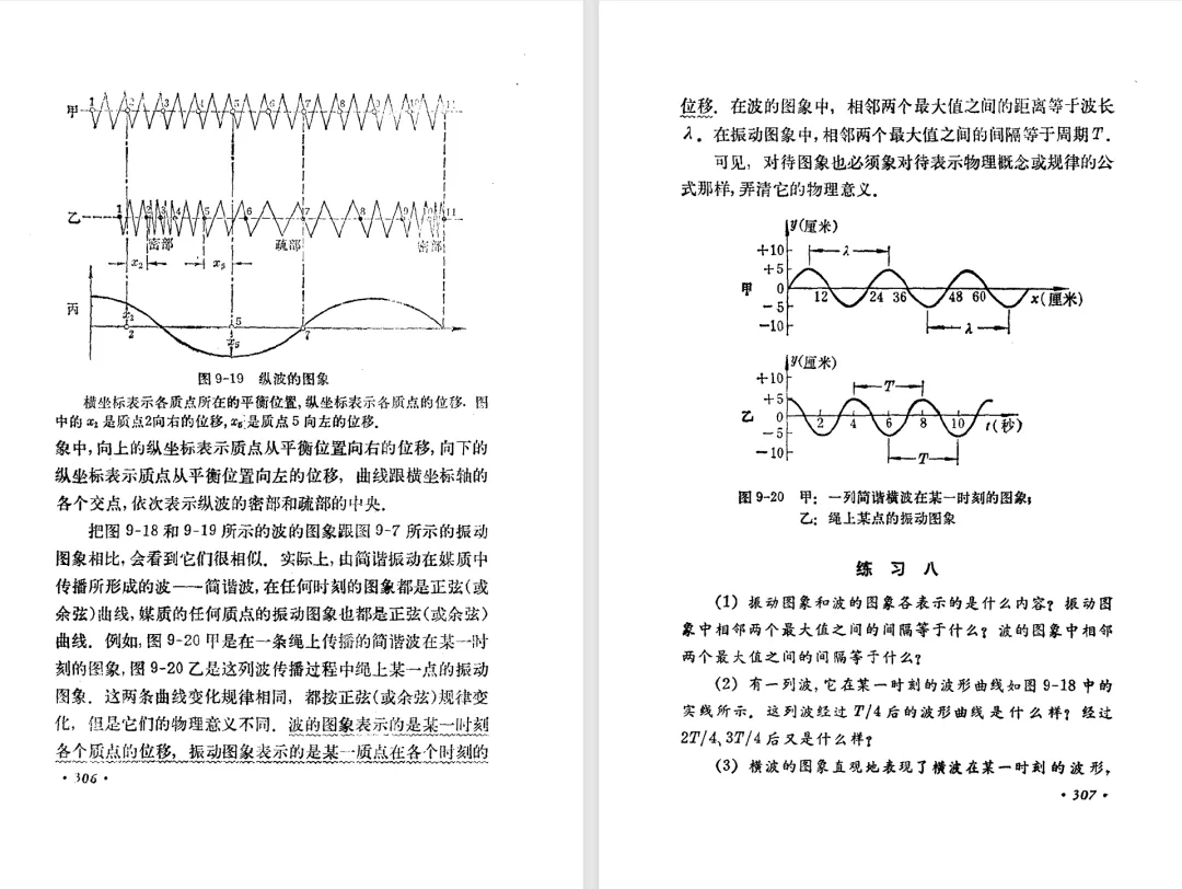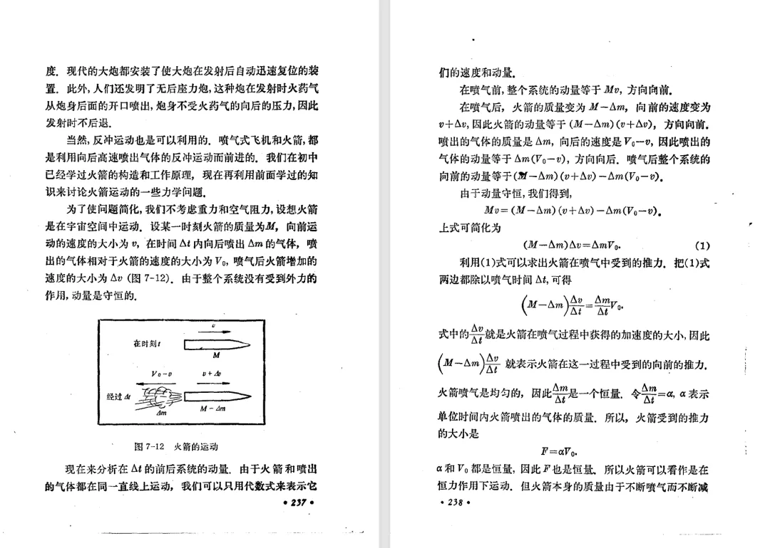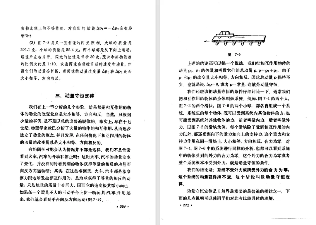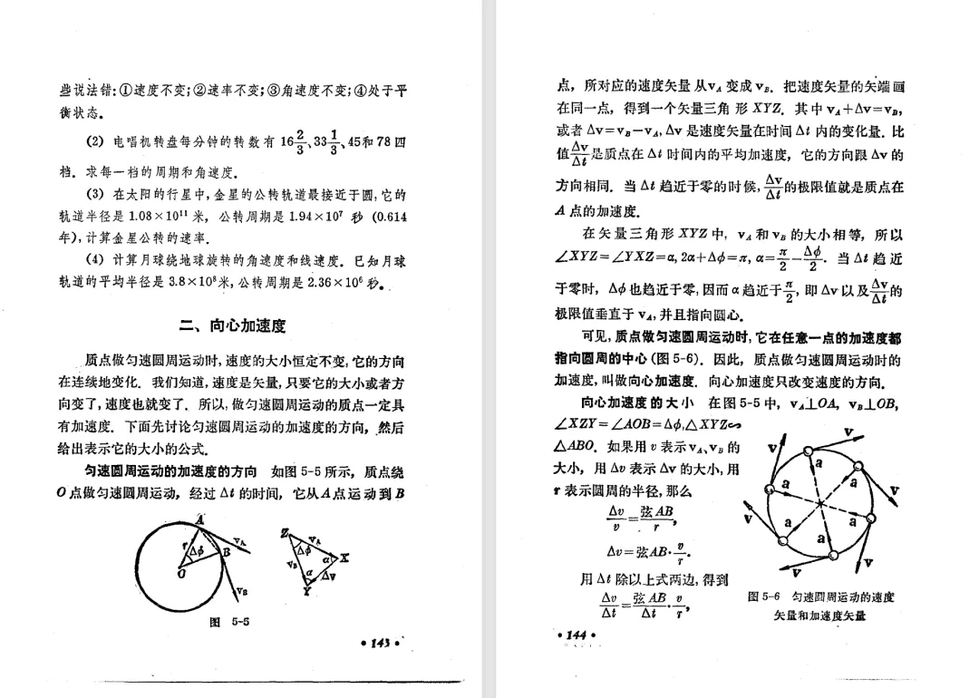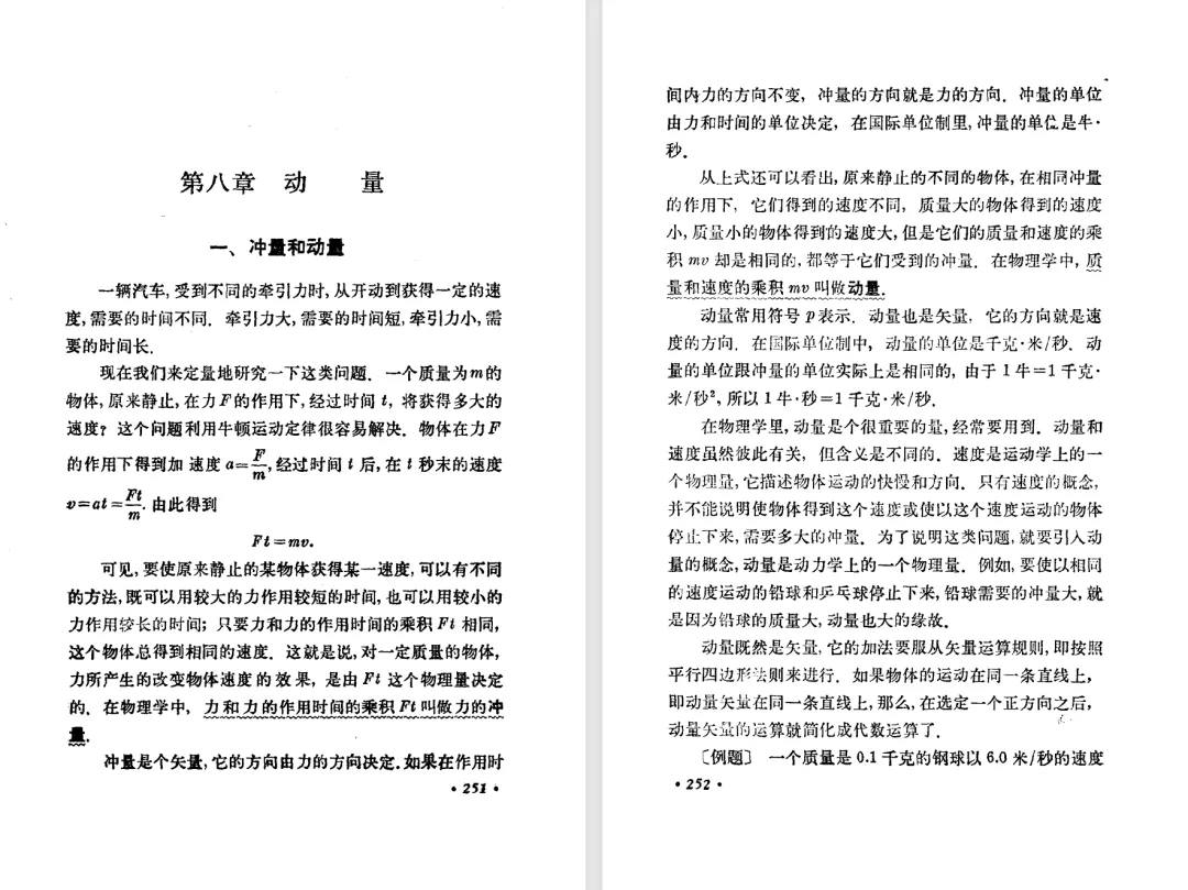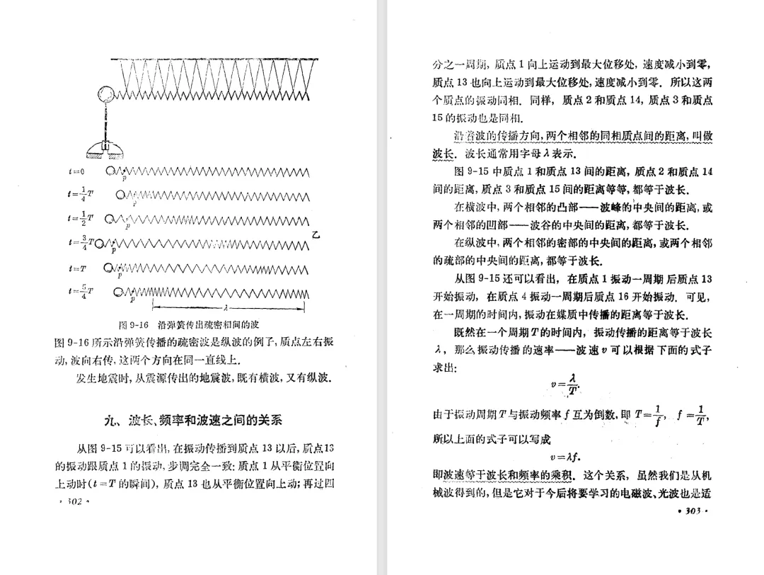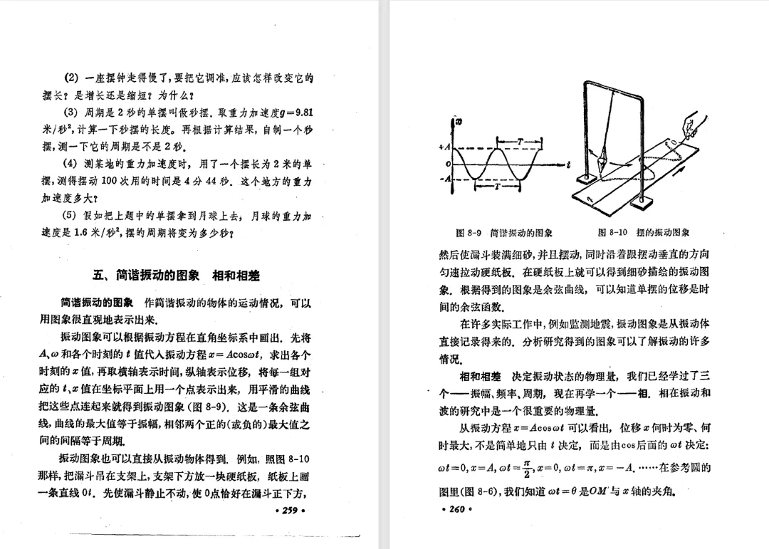 本文对高级中学课本 物理 甲种本 第一册进行详细介绍。本文将物理甲种本与上一版全日制十年制学校高中物理课本(简称旧教材)对比,展示两版教材的差异,从而了解教学要求和教材编写方式和风格的改变。通过本文的介绍,读者也可以认识到为什么人民教育出版社出版的《新中国中小学教材建设史 1949-2000 研究丛书 物理卷》(简称《物理教材建设史》)将全日制十年制学校高中物理称为20世纪最难的高中物理教材。下面再次展示旧教材和甲种本在力的部分的内容编排。左边一列是旧教材的,右边一列是甲种本的。值得注意的是,甲种本在第一章末尾才出现矢量和标量,最后一节仅介绍同一直线上的矢量的运算。旧教材在第一节 力,就说明力是矢量,并且介绍了矢量和标量的区别。下面是旧教材的相关页面。本节给出了力的平行四边形法则和三角形法则,但是没有给出力的合成的矢量表达式。显然,甲种本对矢量和矢量计算的要求相比旧教材降低了。旧教材不仅强调力的运算的矢量表达式,还强调力的运算的平行四边形法则和三角形法则;甲种本主要强调力的运算满足平行四边形法则和三角形法则。换句话说,甲种本弱化了力的运算的数学背景,降低了教学要求。先看甲种本增加的两个阅读材料。第一个阅读材料严格说是实验。第七节,教材给出了隔离法这一名词。旧教材在牛顿运动定律那一章才给出。下面是旧教材物体受力分析小节。旧教材给了三个例子,比甲种本还多。尽管教材没有提隔离法这个词,所使用的受力分析法同样是隔离法。下面看甲种本第六节 变速直线运动 平均速度 即时速度。甲种本同样采用极限法介绍即时速度。但是,甲种本删除了旧教材中利用位移-时间图象求即时速度的内容。下面展示旧教材对应的小节。下图第64页划线的文字开始,介绍利用位移-时间图象求即时速度。用位移-时间图象求即时速度,本质上是用函数图象求切线的斜率,这在全日十年制学制时期是高中二年级第二学期的内容,在高中一年级刚开学没多久在物理课提前接触这些数学知识,要求太高了。可能物理教材的编写者意识到了这个问题,所以在甲种本中删去了这部分内容。甲种本淡化了即时速度的数学背景,降低了即时速度的教学要求。如下图所示,由于教材将讨论的运动限制在了匀变速直线运动,所以只需要给出标量形式的加速度表达式。教材还增加了一个阅读材料,讲述速度和加速度的区别。如下图所示,旧教材没有将运动的讨论范围限定在匀变速,而是笼统地说变速,而且教材给出了矢量形式的加速度表达式。在运动定律这章,旧教材和甲种本差别最大的是牛顿第二定律。旧教材只有两节,甲种本有四节。甲种本分别用三个小节介绍引出牛顿第二定律的内容:物体运动状态的改变,加速度和力的关系,加速度和质量的关系,最后得出牛顿第二定律。而旧教材是在一节里完成对引出牛顿运动定律的实验,以及牛顿第二定律的介绍,在此基础上,再用一节对牛顿第二定律进行扩展补充。下面先看甲种本如何介绍牛顿第二定律。甲种本用第二、三、四三个小节做铺垫,到了第五节才真正介绍牛顿第二定律。下图第113页,教材给出了牛顿第二定律的标量表达式。后面介绍力的独立作用原理,讲物体在收到多个力的作用下的加速度如何计算。下图第114页,教材进一步给出物体在多个力的作用下的牛顿第二定律的表达式,这里用的也是标量表达式。再看旧教材 第二节 牛顿运动定律。本接开头教材仅仅用很短的一句话介绍力如何改变物体的运动状态,接下来教材仅仅通过定性地描述不同的实验结果,得出加速度和力的关系,以及加速度和质量的关系。如下图第114页所示,教材先给出标量形式的牛顿第二定律公式,再给出矢量形式的牛顿第二定律公式。有关牛顿第二定律的讨论,单独成节。如下图第116页所示,教材给出矢量形式的物体受多个外力情况下的牛顿第二定律。第117页的物体做曲线运动的条件,甲种本放在了曲线运动一章介绍。比较旧教材和甲种本牛顿第二定律的内容,我们可以发现,甲种本花了更多的篇幅介绍牛顿第二定律的背景,如何通过实验推导出牛顿第二定律,让学生经历牛顿第二定律发现的过程。旧教材对牛顿第二定律的介绍篇幅较少,更像是给学生灌输知识,但是旧教材给出了牛顿第二定律的矢量表达式,对学生的要求更高。下面展示甲种本增加了超重和失重的内容。旧教材是在讲人造地球卫星部分才介绍超重和失重的,而且篇幅很短。通过对比旧教材和甲种本,我们可以发现,甲种本对知识的讲解更详细,并且主要采用标量语言描述运动定律,几乎没有采用矢量语言。所以,甲种本的数学背景和教学要求是更低的。下面看甲种本的 第二节 运动的合成和分解,这节内容不多,而且没有分开介绍位移的合成和速度的合成,比较笼统。下面看旧教材对应的小节。旧教材的讲解非常详细,先讲平面上的位移,再讲位移的合成与分解,最后讲速度的合成与分解。本节全程使用矢量表达式。加下来看甲种本 第六节 向心加速度,本节给出了匀速圆周运动向心加速度的方向和大小的推导。需要注意的是,A点和B点速度的差值\Delta v的计算是矢量运算。旧教材对于向心加速度的推导更详细。旧教材对于匀速圆周运动向心加速度方向的推导更详细,有角度的计算,详细地说明