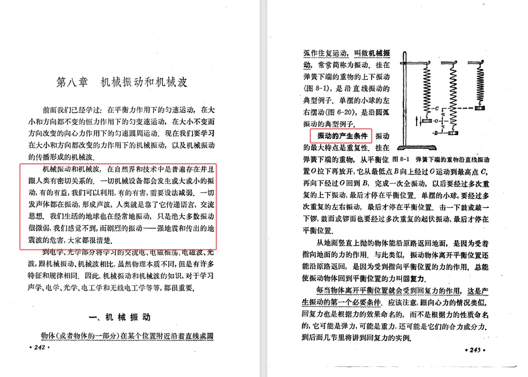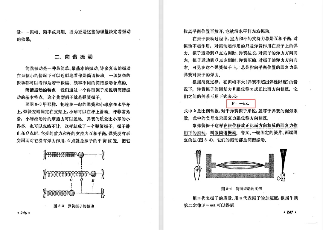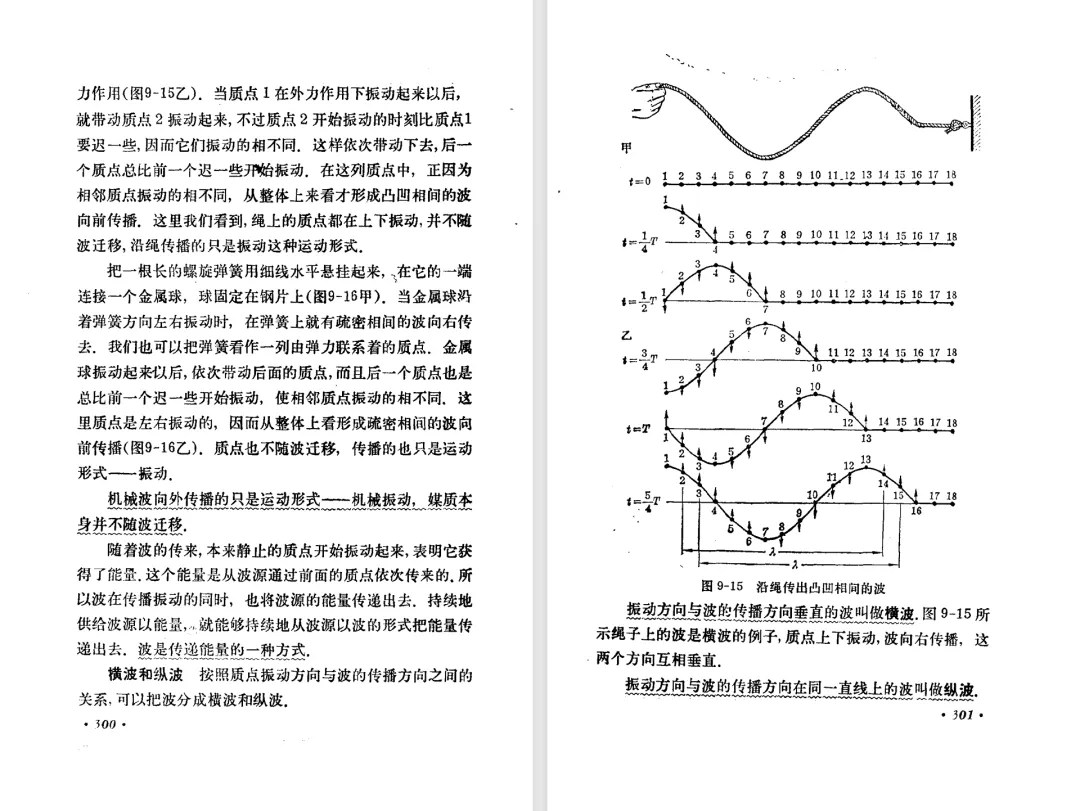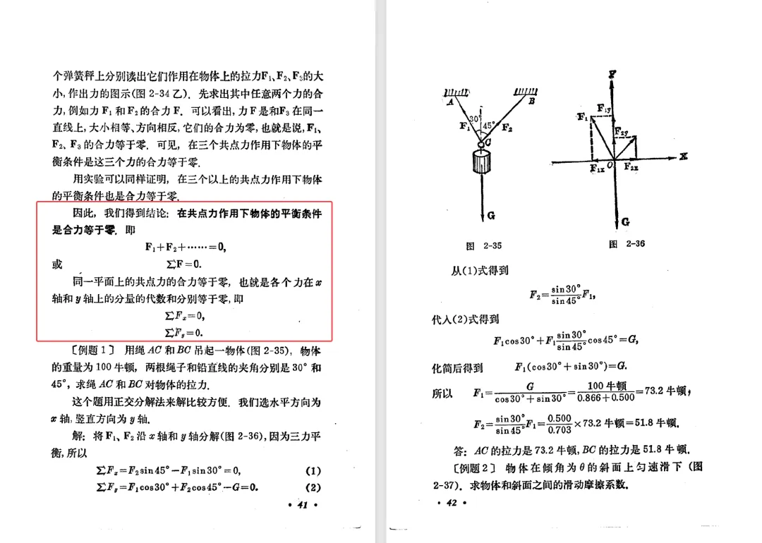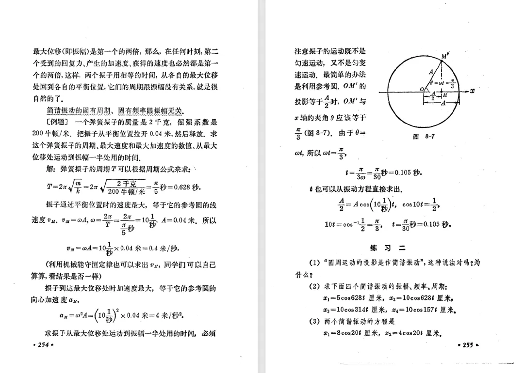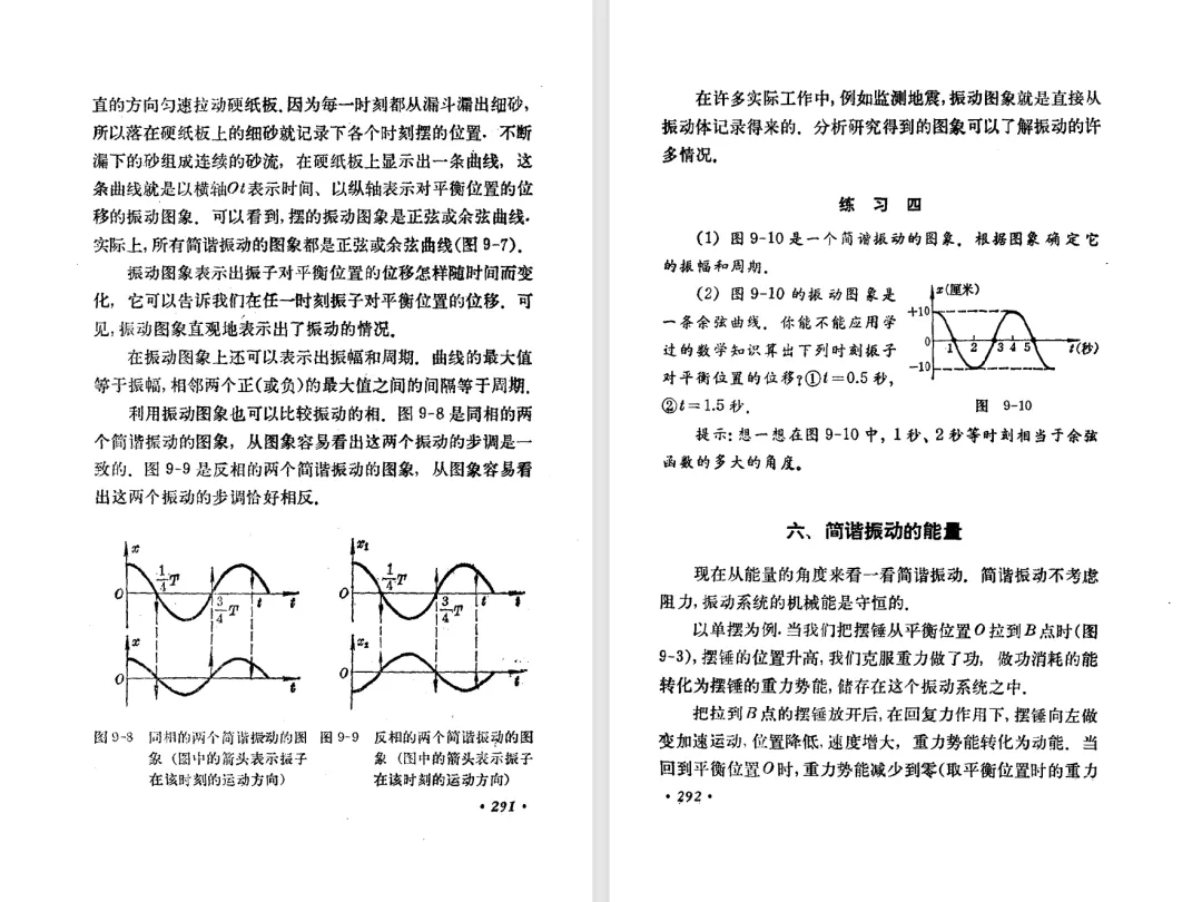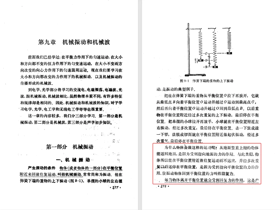 本文对高级中学课本 物理 甲种本 第一册进行详细介绍。本文将物理甲种本与上一版全日制十年制学校高中物理课本(简称旧教材)对比,展示两版教材的差异,从而了解教学要求和教材编写方式和风格的改变。通过本文的介绍,读者也可以认识到为什么人民教育出版社出版的《新中国中小学教材建设史 1949-2000 研究丛书 物理卷》(简称《物理教材建设史》)将全日制十年制学校高中物理称为20世纪最难的高中物理教材。下面再次展示旧教材和甲种本在力的部分的内容编排。左边一列是旧教材的,右边一列是甲种本的。值得注意的是,甲种本在第一章末尾才出现矢量和标量,最后一节仅介绍同一直线上的矢量的运算。旧教材在第一节 力,就说明力是矢量,并且介绍了矢量和标量的区别。下面是旧教材的相关页面。本节给出了力的平行四边形法则和三角形法则,但是没有给出力的合成的矢量表达式。显然,甲种本对矢量和矢量计算的要求相比旧教材降低了。旧教材不仅强调力的运算的矢量表达式,还强调力的运算的平行四边形法则和三角形法则;甲种本主要强调力的运算满足平行四边形法则和三角形法则。换句话说,甲种本弱化了力的运算的数学背景,降低了教学要求。先看甲种本增加的两个阅读材料。第一个阅读材料严格说是实验。第七节,教材给出了隔离法这一名词。旧教材在牛顿运动定律那一章才给出。下面是旧教材物体受力分析小节。旧教材给了三个例子,比甲种本还多。尽管教材没有提隔离法这个词,所使用的受力分析法同样是隔离法。下面看甲种本第六节 变速直线运动 平均速度 即时速度。甲种本同样采用极限法介绍即时速度。但是,甲种本删除了旧教材中利用位移-时间图象求即时速度的内容。下面展示旧教材对应的小节。下图第64页划线的文字开始,介绍利用位移-时间图象求即时速度。用位移-时间图象求即时速度,本质上是用函数图象求切线的斜率,这在全日十年制学制时期是高中二年级第二学期的内容,在高中一年级刚开学没多久在物理课提前接触这些数学知识,要求太高了。可能物理教材的编写者意识到了这个问题,所以在甲种本中删去了这部分内容。甲种本淡化了即时速度的数学背景,降低了即时速度的教学要求。如下图所示,由于教材将讨论的运动限制在了匀变速直线运动,所以只需要给出标量形式的加速度表达式。教材还增加了一个阅读材料,讲述速度和加速度的区别。如下图所示,旧教材没有将运动的讨论范围限定在匀变速,而是笼统地说变速,而且教材给出了矢量形式的加速度表达式。在运动定律这章,旧教材和甲种本差别最大的是牛顿第二定律。旧教材只有两节,甲种本有四节。甲种本分别用三个小节介绍引出牛顿第二定律的内容:物体运动状态的改变,加速度和力的关系,加速度和质量的关系,最后得出牛顿第二定律。而旧教材是在一节里完成对引出牛顿运动定律的实验,以及牛顿第二定律的介绍,在此基础上,再用一节对牛顿第二定律进行扩展补充。下面先看甲种本如何介绍牛顿第二定律。甲种本用第二、三、四三个小节做铺垫,到了第五节才真正介绍牛顿第二定律。下图第113页,教材给出了牛顿第二定律的标量表达式。后面介绍力的独立作用原理,讲物体在收到多个力的作用下的加速度如何计算。下图第114页,教材进一步给出物体在多个力的作用下的牛顿第二定律的表达式,这里用的也是标量表达式。再看旧教材 第二节 牛顿运动定律。本接开头教材仅仅用很短的一句话介绍力如何改变物体的运动状态,接下来教材仅仅通过定性地描述不同的实验结果,得出加速度和力的关系,以及加速度和质量的关系。如下图第114页所示,教材先给出标量形式的牛顿第二定律公式,再给出矢量形式的牛顿第二定律公式。有关牛顿第二定律的讨论,单独成节。如下图第116页所示,教材给出矢量形式的物体受多个外力情况下的牛顿第二定律。第117页的物体做曲线运动的条件,甲种本放在了曲线运动一章介绍。比较旧教材和甲种本牛顿第二定律的内容,我们可以发现,甲种本花了更多的篇幅介绍牛顿第二定律的背景,如何通过实验推导出牛顿第二定律,让学生经历牛顿第二定律发现的过程。旧教材对牛顿第二定律的介绍篇幅较少,更像是给学生灌输知识,但是旧教材给出了牛顿第二定律的矢量表达式,对学生的要求更高。下面展示甲种本增加了超重和失重的内容。旧教材是在讲人造地球卫星部分才介绍超重和失重的,而且篇幅很短。通过对比旧教材和甲种本,我们可以发现,甲种本对知识的讲解更详细,并且主要采用标量语言描述运动定律,几乎没有采用矢量语言。所以,甲种本的数学背景和教学要求是更低的。下面看甲种本的 第二节 运动的合成和分解,这节内容不多,而且没有分开介绍位移的合成和速度的合成,比较笼统。下面看旧教材对应的小节。旧教材的讲解非常详细,先讲平面上的位移,再讲位移的合成与分解,最后讲速度的合成与分解。本节全程使用矢量表达式。加下来看甲种本 第六节 向心加速度,本节给出了匀速圆周运动向心加速度的方向和大小的推导。需要注意的是,A点和B点速度的差值\Delta v的计算是矢量运算。旧教材对于向心加速度的推导更详细。旧教材对于匀速圆周运动向心加速度方向的推导更详细,有角度的计算,详细地说明