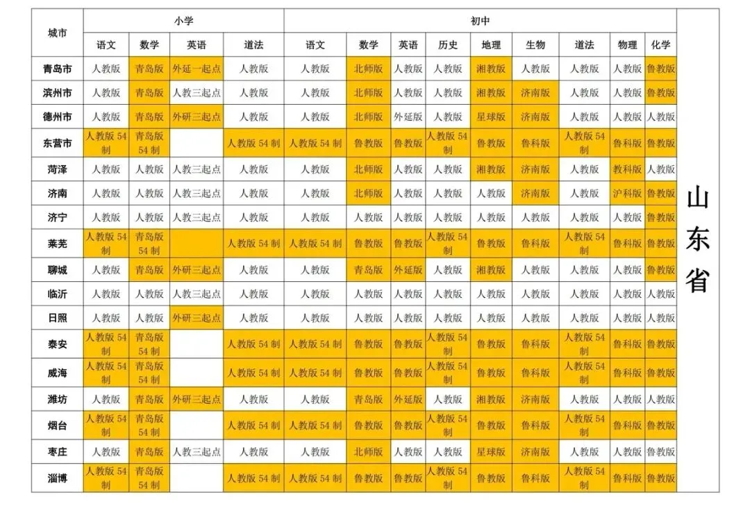 >山东省各地市小学、初中教材版本