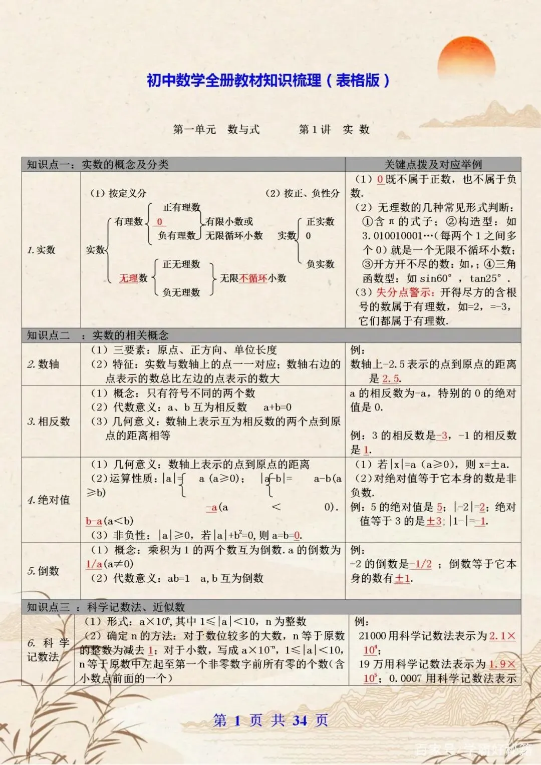 这两天正是开学季,为了学生们在新学期的学习能够顺风顺水,所以老师今天就特意为大家总结了一份初中数学最全的概念公式总结,这对学生们的学习会有很大的帮助。衡中名师分享:初中数学全册教材梳理(表格版),3年考点全囊括