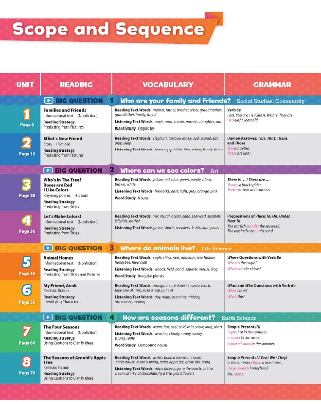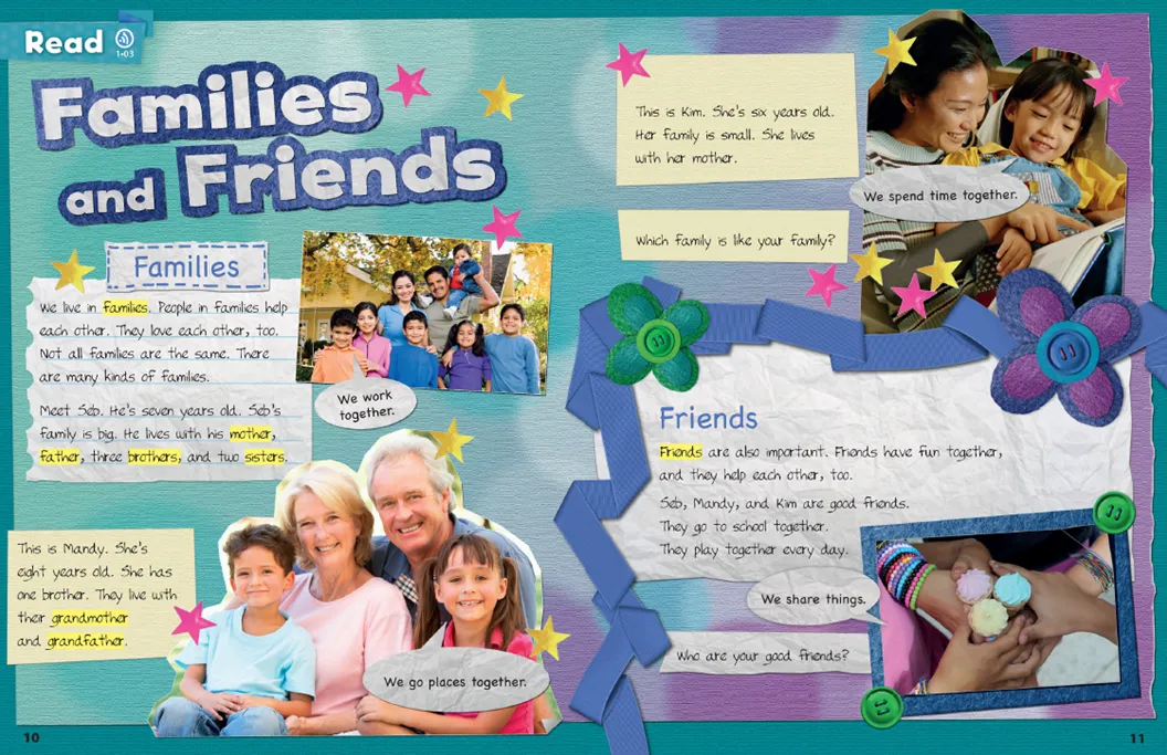 Oxford Discover曾荣获2014年美国纽约图书行业协会颁发的学校配套教材系列大奖第一名!不得不提到的是,牛津大学出版社的另一套自然拼读专项教材——Oxford Phonics World,获得同年学校配套教材系列大奖第二名。Oxford Phonics World是Oxford Discover的好搭档,这两套教材,为孩子小学阶段的英语学习,构架出一整套科学有效的课程体系,可以让孩子快速达到国际学校水平! 国内,Oxford Discover 教材已被众多高端国际学校使用,如上海平和双语学校、华东师范大学附属双语学校、北京朝阳外国语学校、上海韩国学校、枫叶国际学校等多家知名国际学校及双语学校。这套教材共有7册,每本书18个单元,每个单元都包含Reading阅读(Get Ready , Vocabulary, Reading), Grammar语法, Listening听力, Speaking口语, Writing写作, Wrap up总结活动 ,各个部分内容紧扣Big Question。每个单元开篇都会明确告诉我们学习的内容,提出一个有趣的Big Question,激发孩子的兴趣,在有兴趣的前提下去发现、学习。这些问题都是孩子们非常想了解的:Where do animals live ? How do seasons different ? How do we measure time ?以精准、清晰的图片呈现词汇,词汇有对应的练习,比如讲动物们的居住环境时,会有动物名和住所名,词汇下方就有对应的练习。第三本教材依然是先思考“Why do people move to new places ” ? “What do you think it's like to move far away” ? 并学习Sequence of Events 故事发展的顺序。▲选自Book 1 家庭和朋友篇中提供了3种不同的家庭形式Sing along将语法融入歌曲(歌曲有音频),再配合相关的语法点讲解和口语练习,Ask and answer 很清楚地告诉我们在实际中该如何运用,这样学习语法就轻松多了。《练习册》中有对应的语法模块What and Who Questions:刚才的What ,Who 是第一册书的内容,再看一个第二册的语法知识:地点介词,同样是一首歌曲、知识点讲解和口语运用。