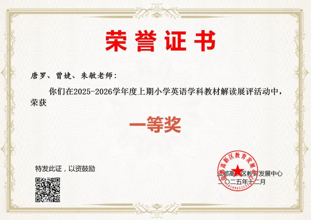 捷报传来!在2025年9月高新区小学英语学科教材解读展评活动中,我校朱敏、曾婕、唐罗老师凭借扎实的学科素养、精妙的解读设计与深厚的教学积淀,在激烈竞争中脱颖而出,荣获区级一等奖!向三位老师致以热烈祝贺!