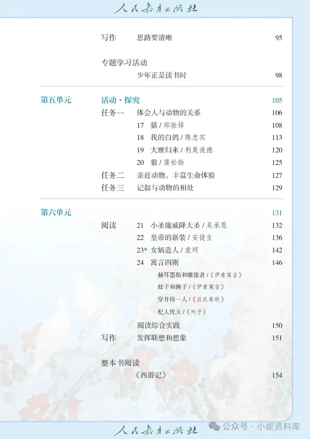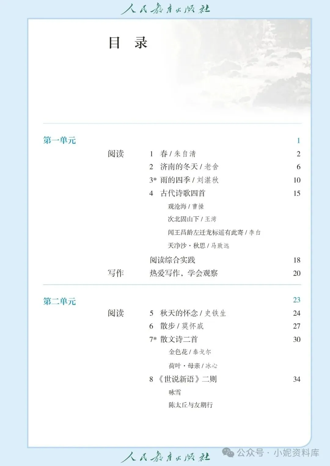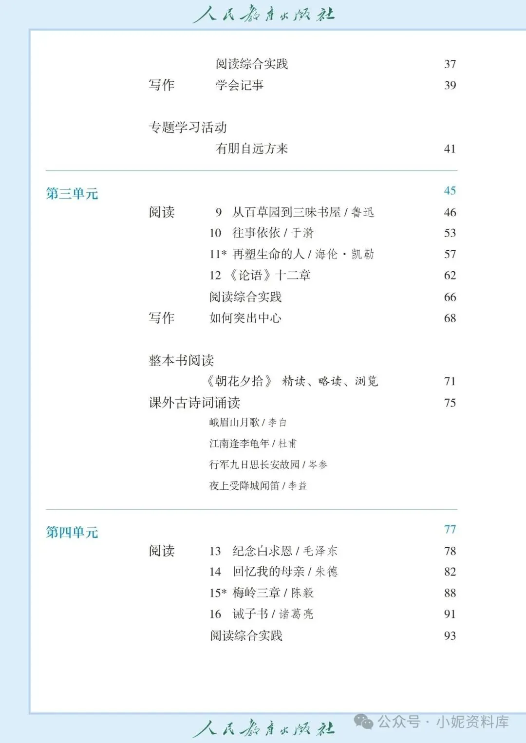 初一上语文用书, 2026年最新 人教版 《 初中七年级上册 语文 》课本教材 ,PDF高清电子版,可下载打印!通过夸克网盘分享的文件: 「 初中七年级上册语文 电子课本」链接:https://pan.quark.cn/s/5744ee6650ca主要内容包含阅读(《春》《济南的冬天》《雨的四季》等写景诗文品读,古代诗歌四首赏析)、阅读综合实践、写作(热爱写作,学会观察)主要内容包含阅读(《秋天的怀念》《散步》等亲情主题文章阅读,《散文诗二首》《世说新语》二则赏析)、阅读综合实践、写作(学会记事)、专题学习活动(有朋自远方来)主要内容包含阅读(《从百草园到三味书屋》《往事依依》《再塑生命的人》阅读,《论语》十二章解读)、阅读综合实践、写作(如何突出中心)、整本书阅读(《朝花夕拾》精读、略读、浏览方法指导)、课外古诗词诵读(《峨眉山月歌》等四首赏析)主要内容包含阅读(《纪念白求恩》《回忆我的母亲》等人物主题文章阅读,《梅岭三章》《诫子书》赏析)、阅读综合实践、写作(思路要清晰)、专题学习活动(少年正是读书时)主要内容包含任务一(体会人与动物的关系,阅读《猫》《我的白鸽》《大雁归来》《狼》)、任务二(亲近动物,丰富生命体验)、任务三(记叙与动物的相处)主要内容包含阅读(《小圣施威降大圣》《皇帝的新装》《女娲造人》阅读,寓言四则赏析)、阅读综合实践、写作(发挥联想和想象)