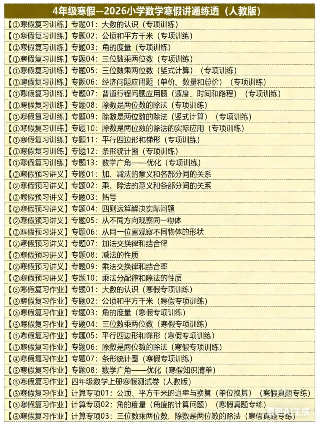 【4】4️⃣年级寒假--2026小学数学寒假讲通练透(人教版),包含复习讲义,预习新教材讲义,寒假作业,三部分