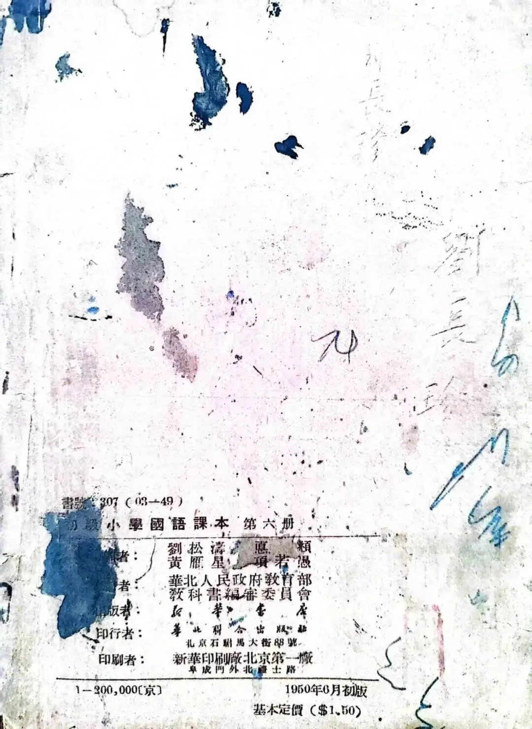 关于建国初期的中小学教材发展史,我在以前的很多文章里都提到过。建国之初,全国还没有一套统一的中小学教材。中央出版委员会和较合适编审委员会(后来改称出版总署编审局)在上海临时编审委员会、华北人民政府教育部编审委员会、东北行政委员会教材编审委员会等多家编审委员会的编辑审定的基础上,联合各地新华书店和华北联合出版社、上海联合出版社,出版发行了建国后第一套教科书,用于1949年秋季和1950年春季。因为其出版主体多为各地新华书店,所以也被称为“新华书店版本”。上图中这本教材是《初级小学国语课本》(第六册),是我手里仅有的的一本由华北人民政府教育部教科书编审委员会编订,华北联合出版社印行的1950年代小学语文教材,1950年6月初版,也仅此一版。因为到了1950年12月,人教社就正式成立,并开始“逐步统一全国教科书的编辑出版工作”了。