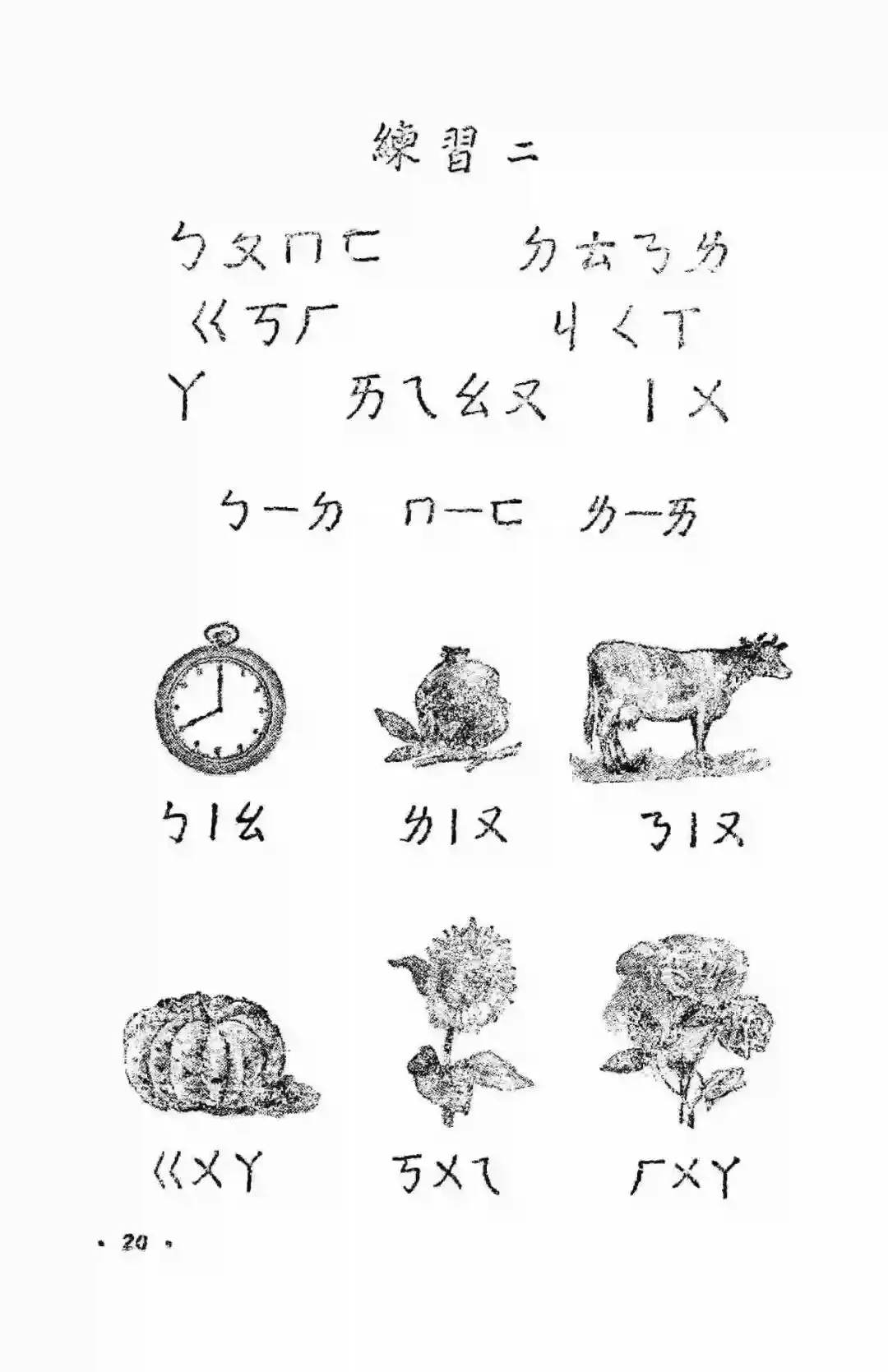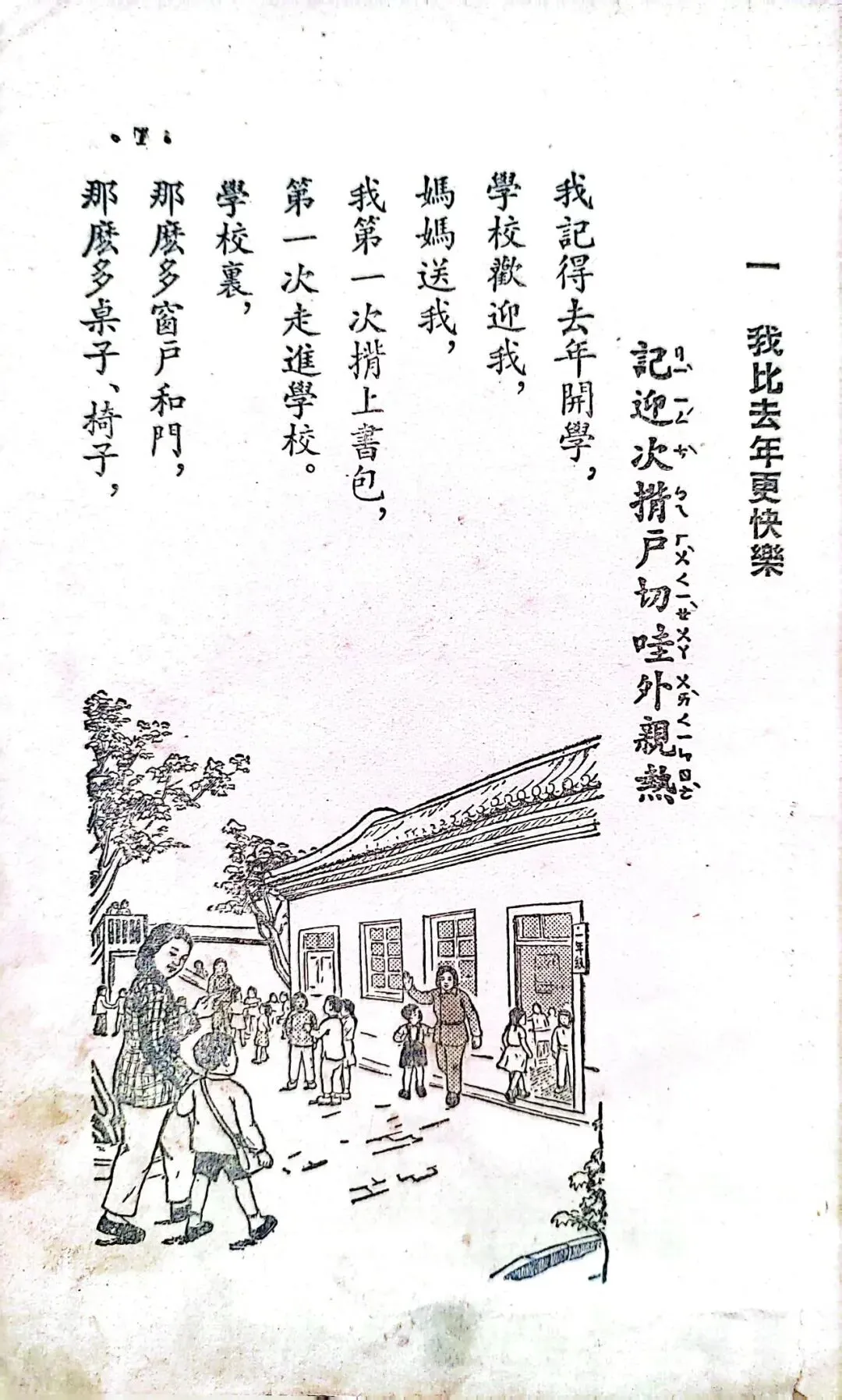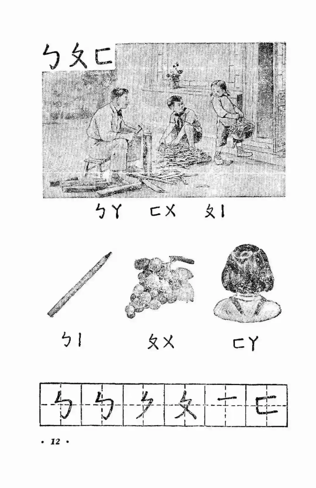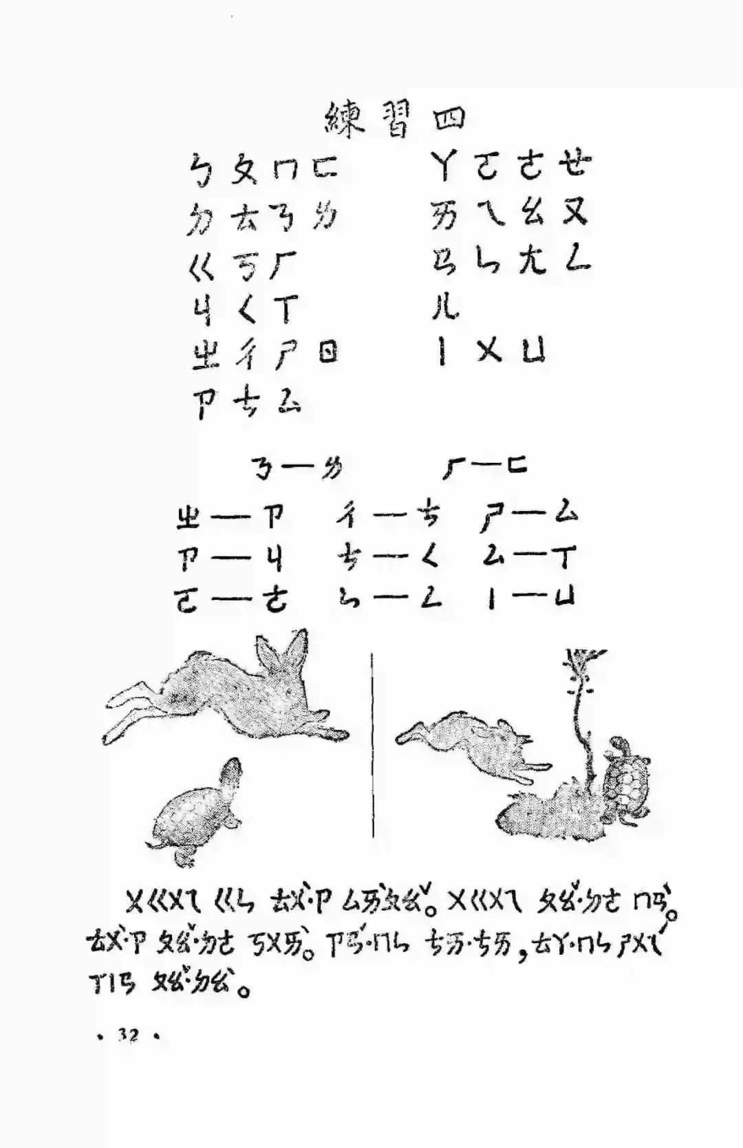 从1954年底到1957年,邓散木用工整的小楷为1955年版小学语文课本的前六册书写了精美的课文、注音符号、封面书名和插图说明,并先后制作出了繁简两个版本的铜字模,为制作新的汉字手写体字模提供了范本。同时他还书写了配合语文课本学习的学生字帖。前面讲过了这套教材承担着文字改革的重大使命,1955年实现了横版书写,1956年开始使用简体字,到了1958年它又承担起了推广汉语拼音方案的使命。但是在这版教材使用的前两年里,它的第一部分,依然是注音符号。注音符号旧称“注音字母”,1918年发布,共计39个字母。1920年字母数增加至40个,在1958年以前,注音符号是语文教育的主要拼读工具,是小学语文的必修内容。接下来,我们就一起走进满是注音符号的1955年小学语文第一册。这幅封面是阿老绘制的,据说曾经有两版,一版是阿老画的,一版是刘继卣画的。虽然注音符号和片假名看起来很像,但它真心是属于我们自己的字母符号。汉语拼音方案推行后,学校不再使用注音符号授课,但注音符号并没有消失。在《新华字典》、《现代汉语字典》中依然有着它的身影。